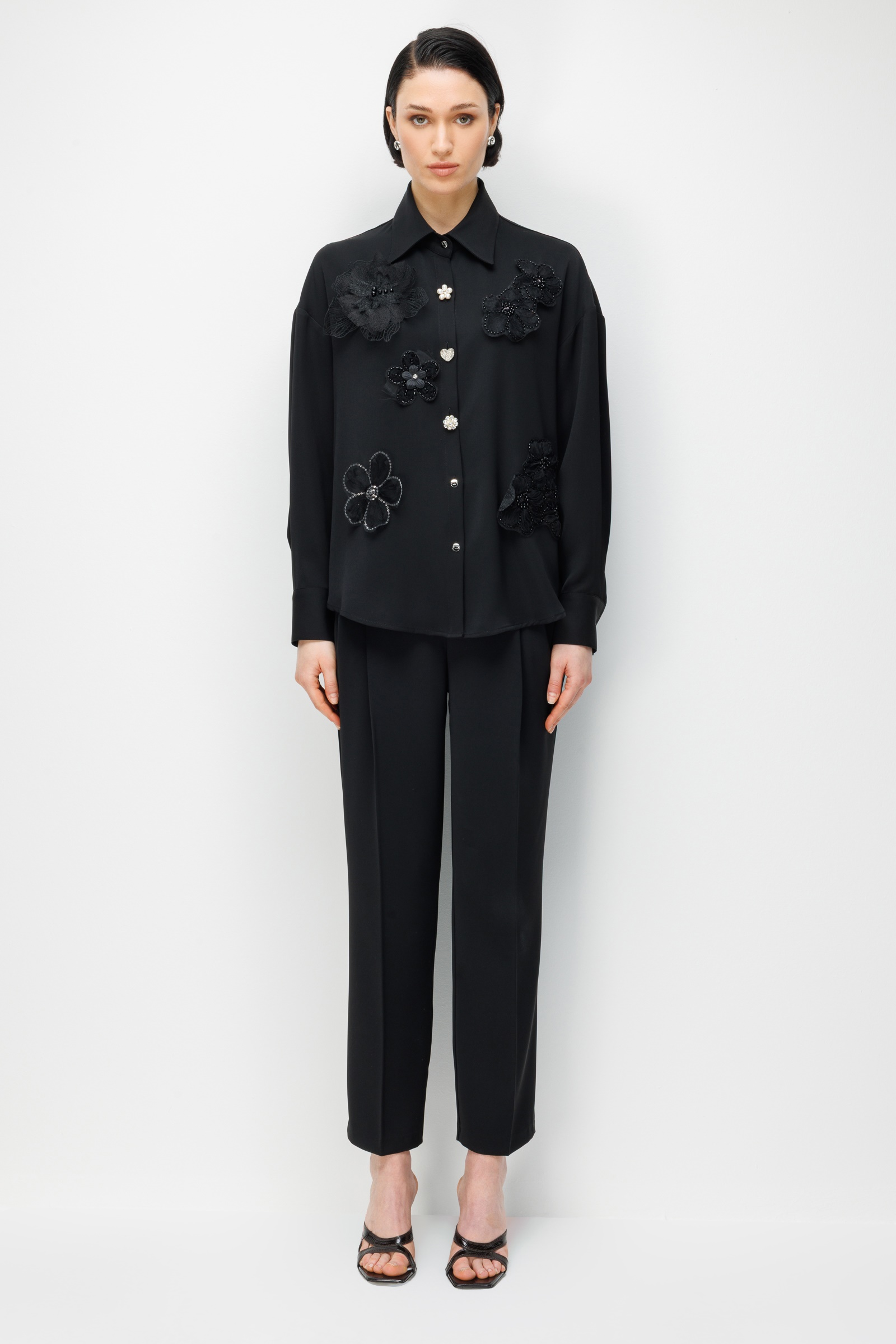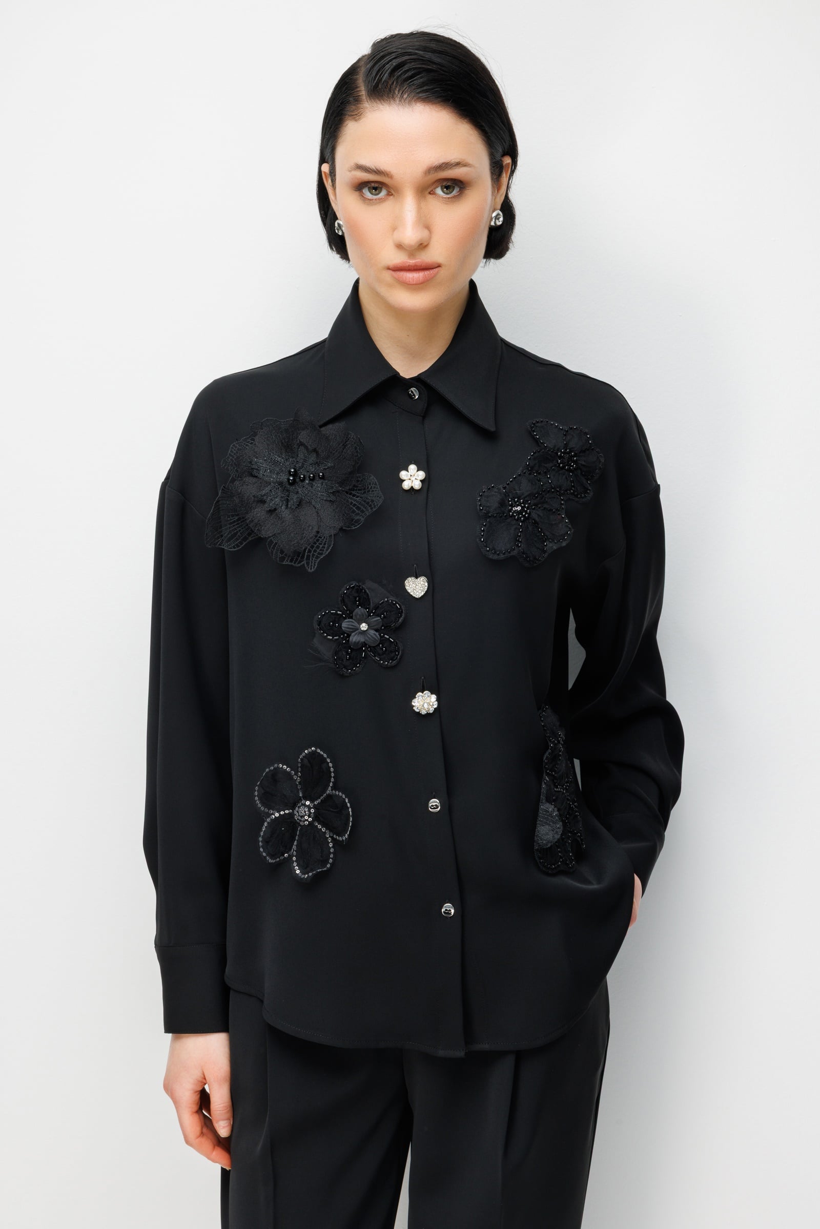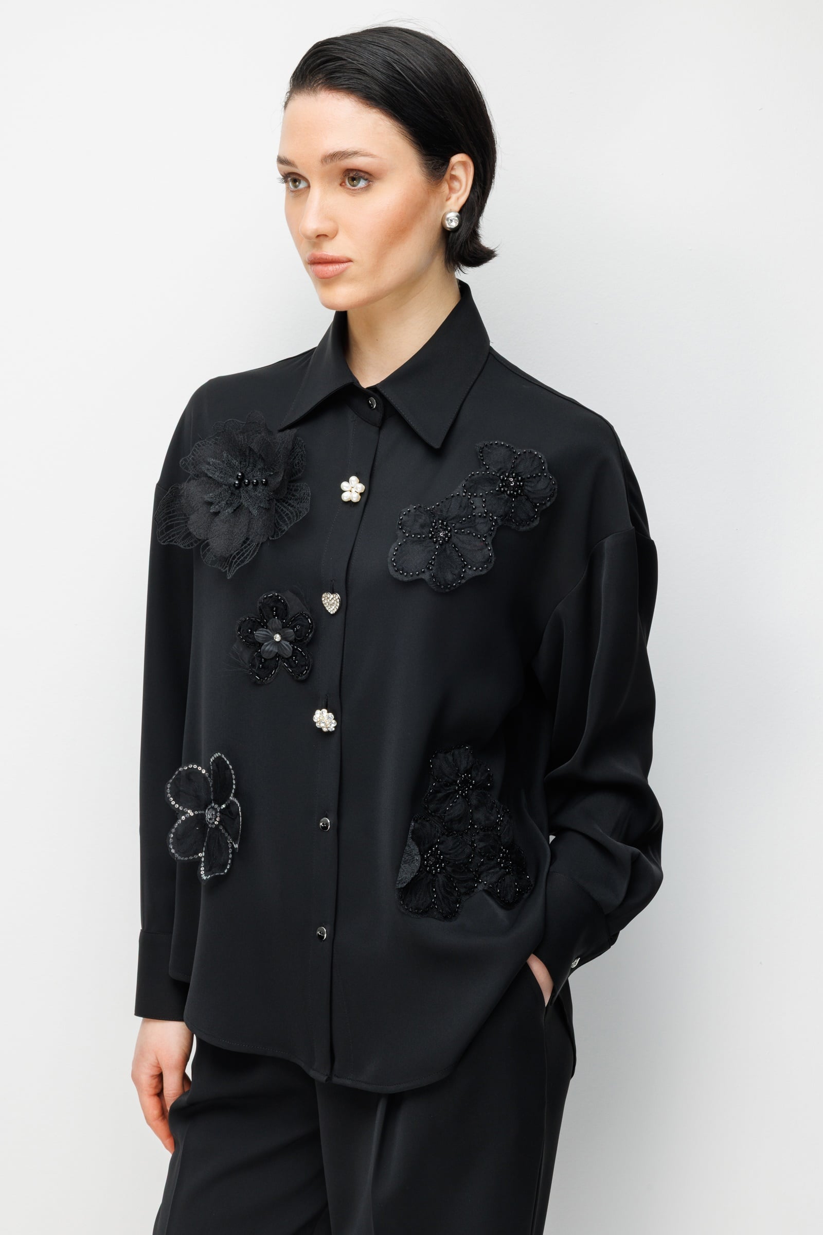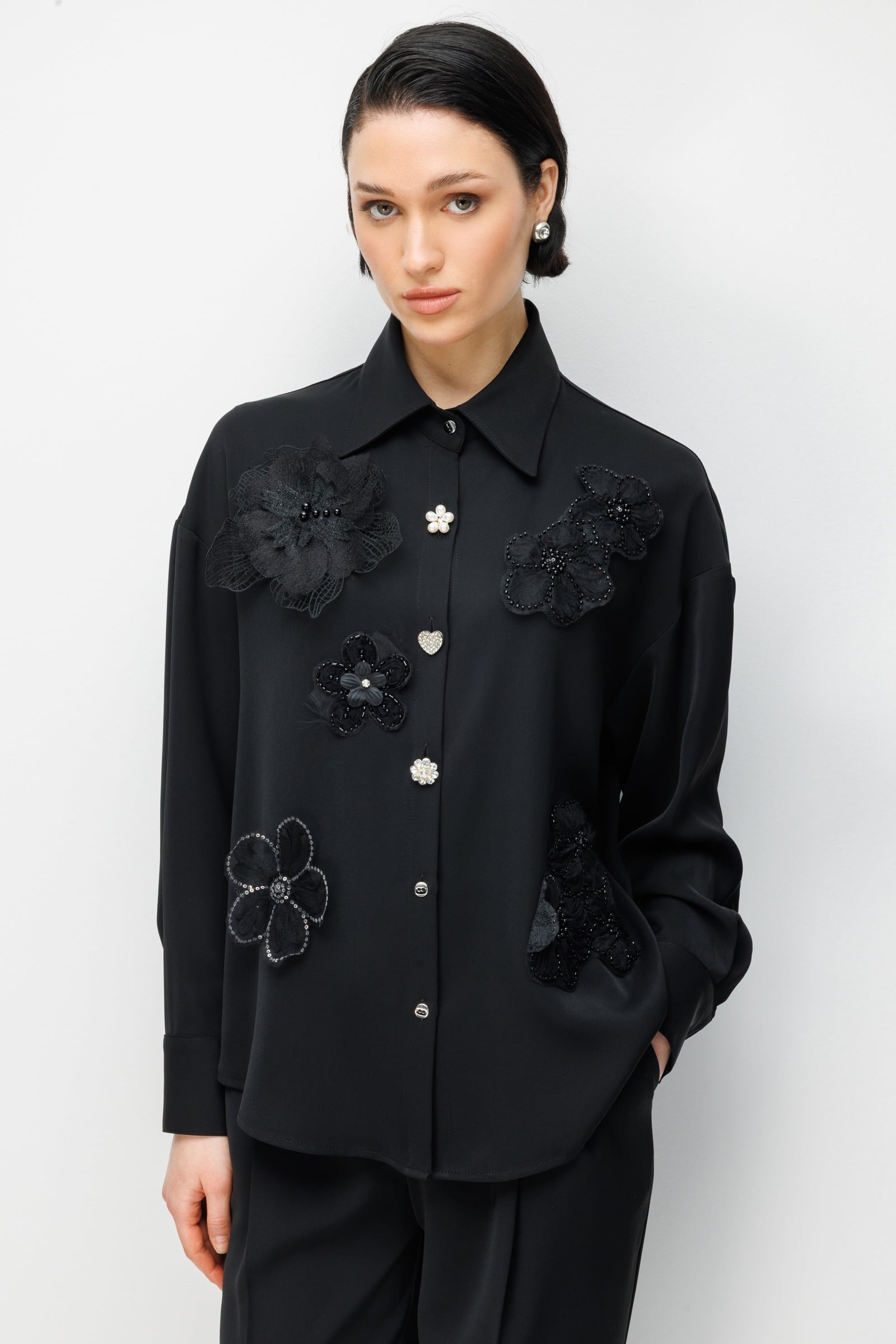 Modailgi Çiçek Aplikeli Oversize Gömlek Siyah (ILG261GMK10116-263)