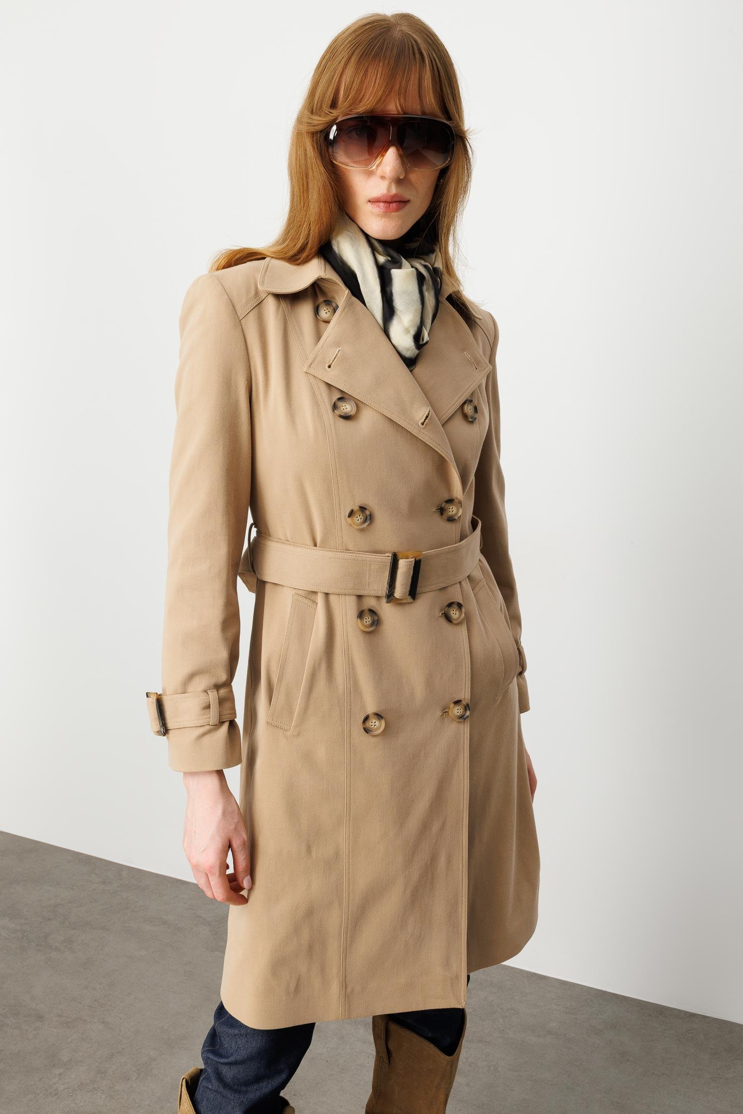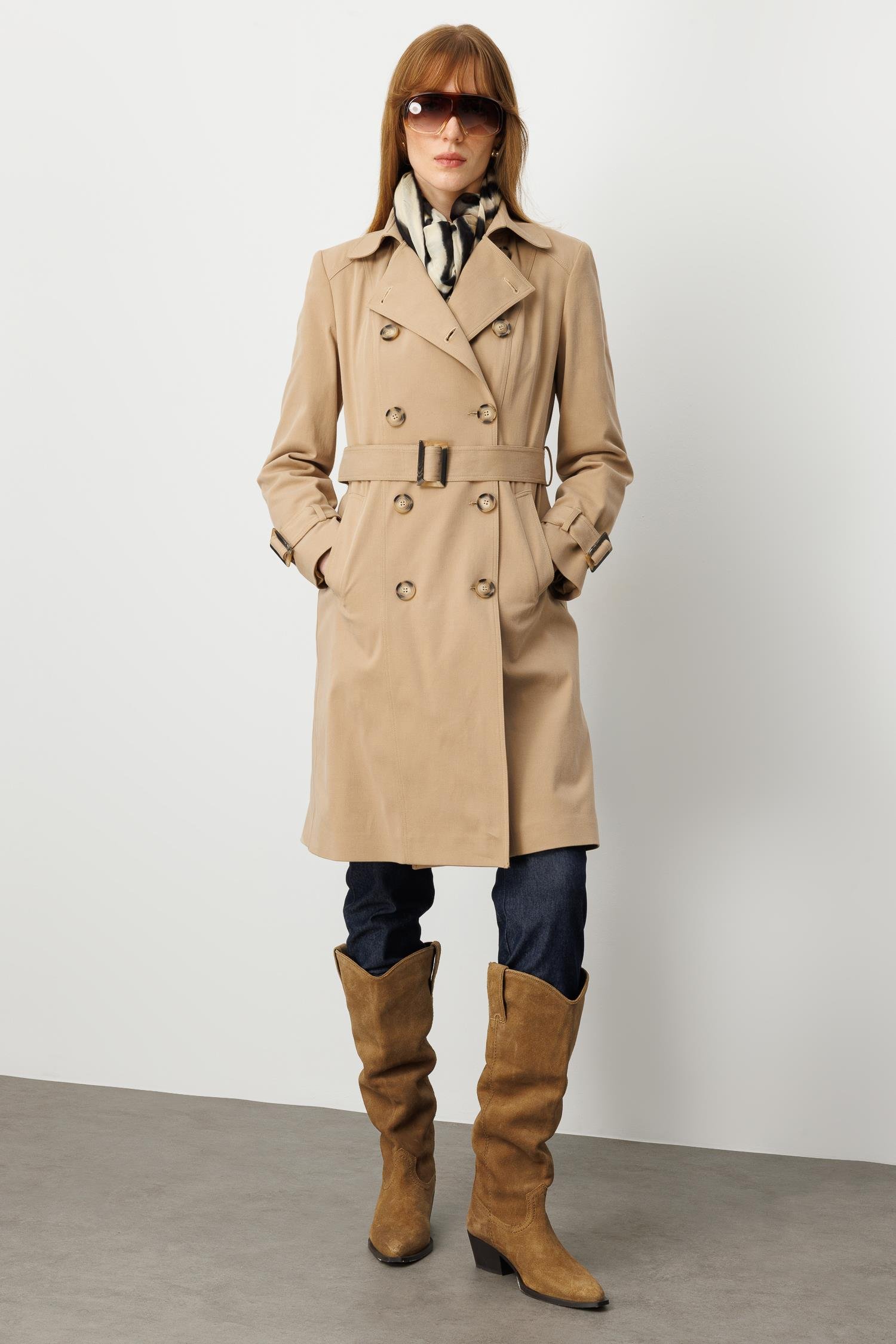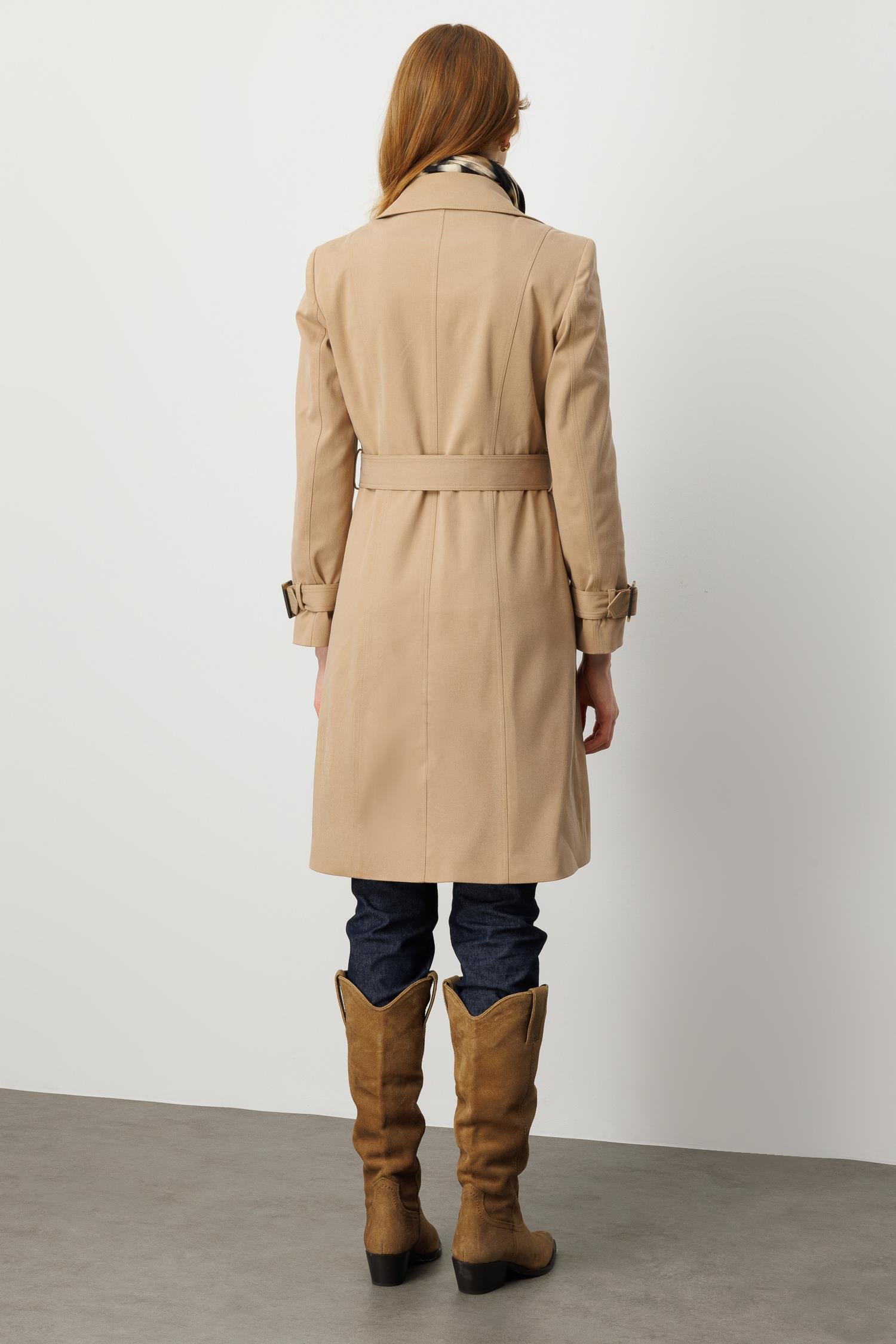 Modailgi Kruvaze Kapamalı Beli Ve Kolları Kemer Kuşak Detaylı Spor Dikişli Astarlı Ara Boy Trençkot Camel (ILG260TRC20003-047)