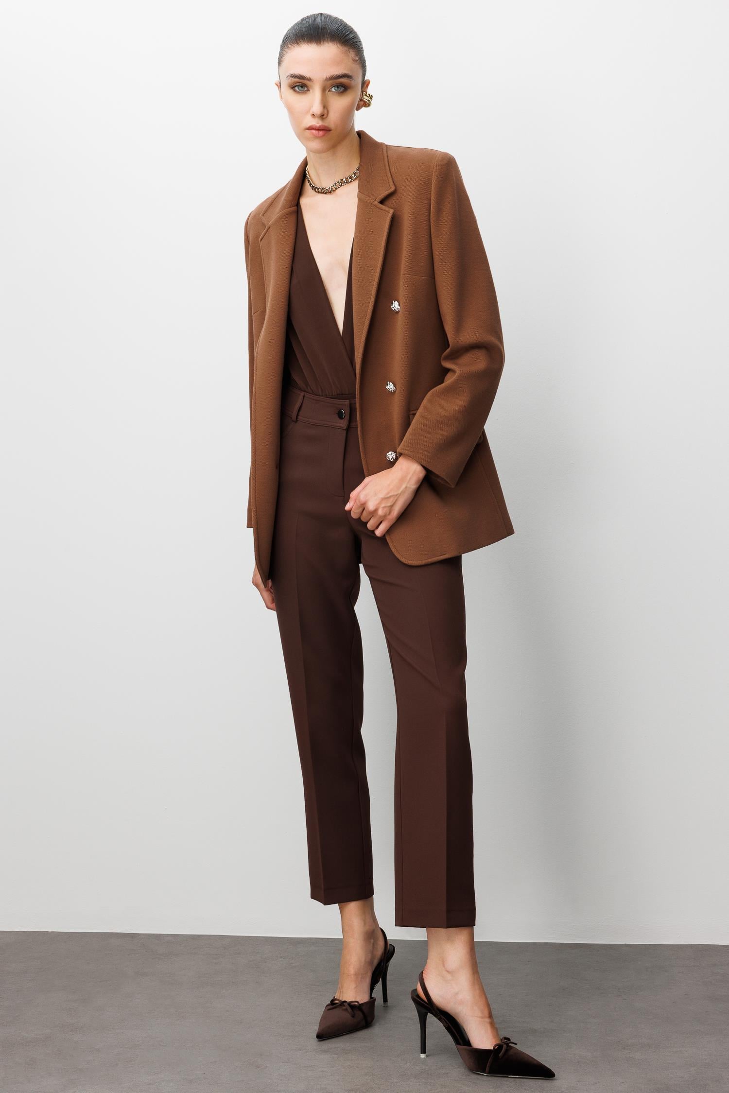 Modailgi Mono Yaka Cep Kapaklı Uzun Ceket Kahve (ILG250CKT07084-122)