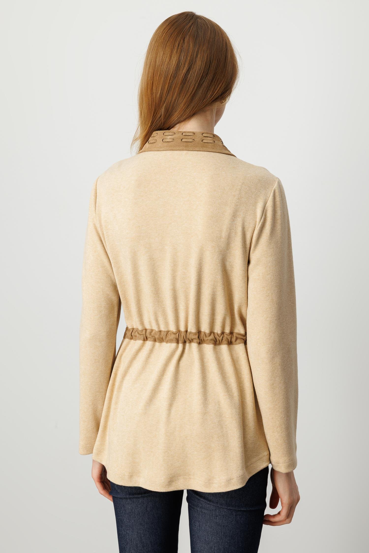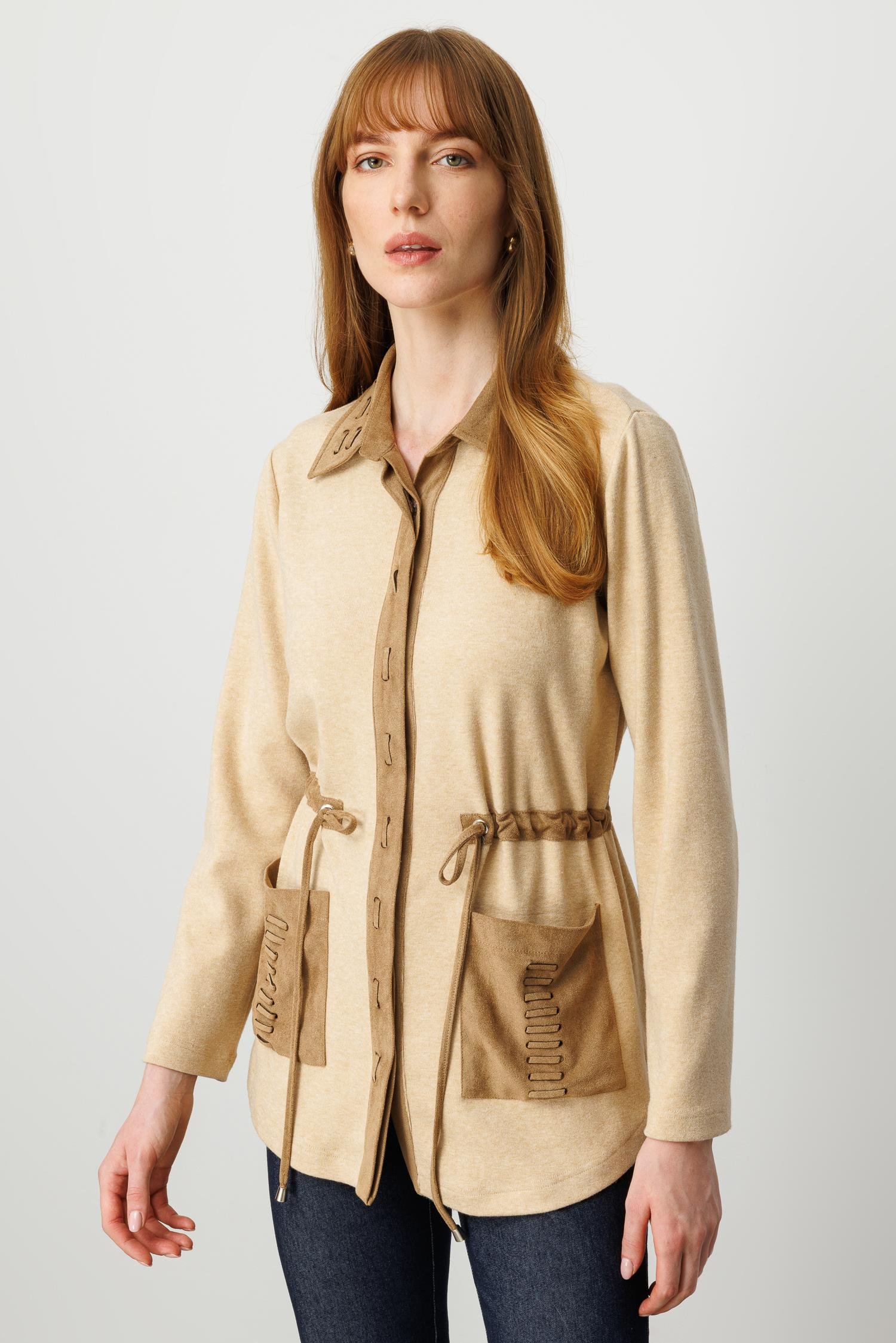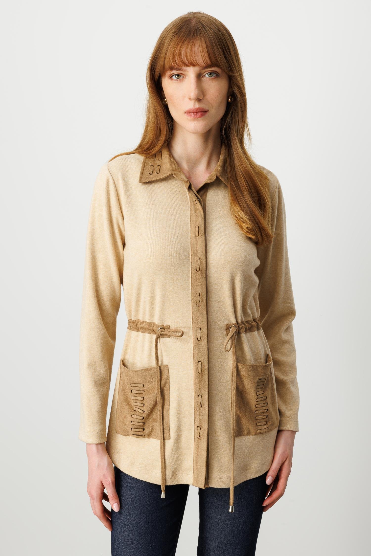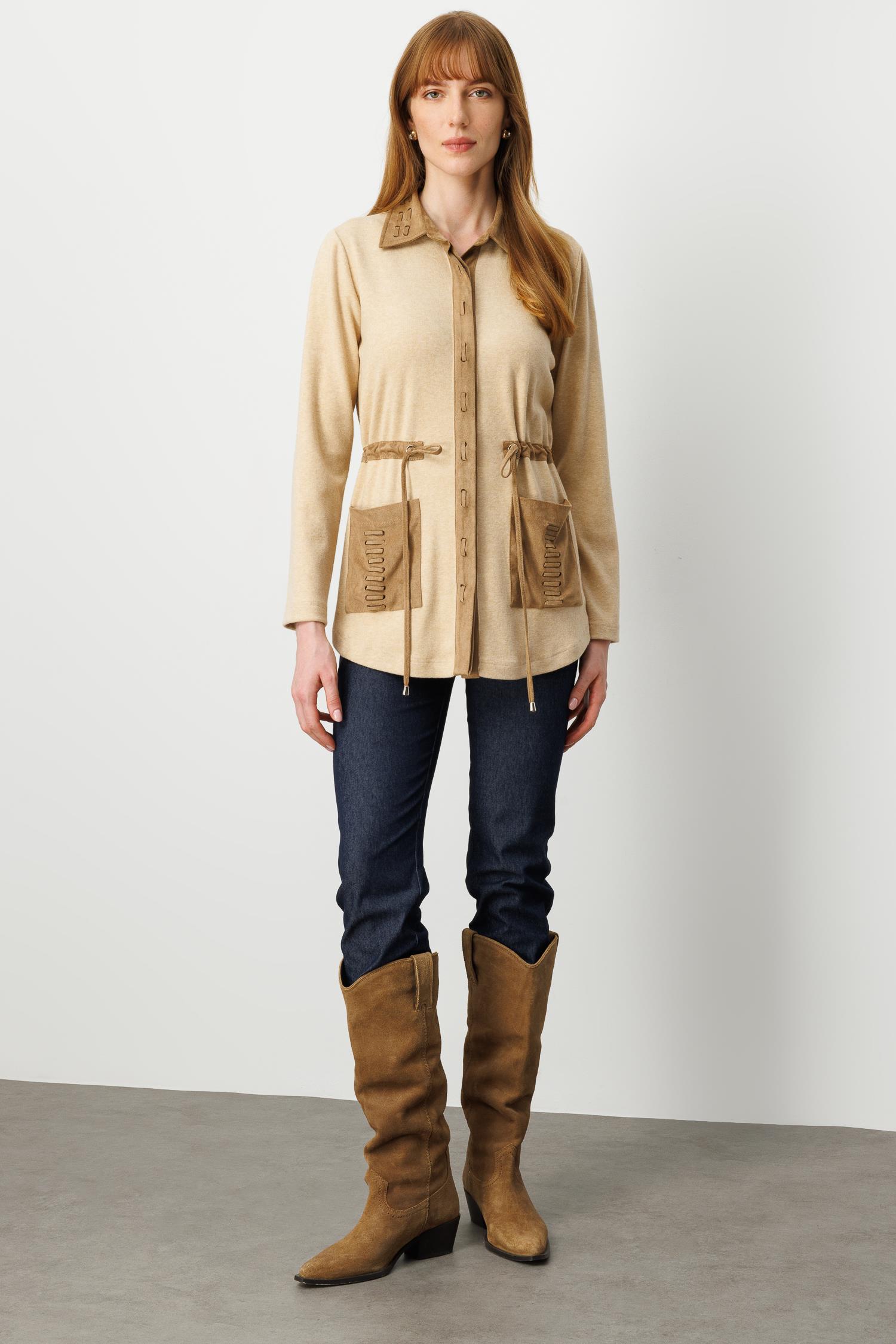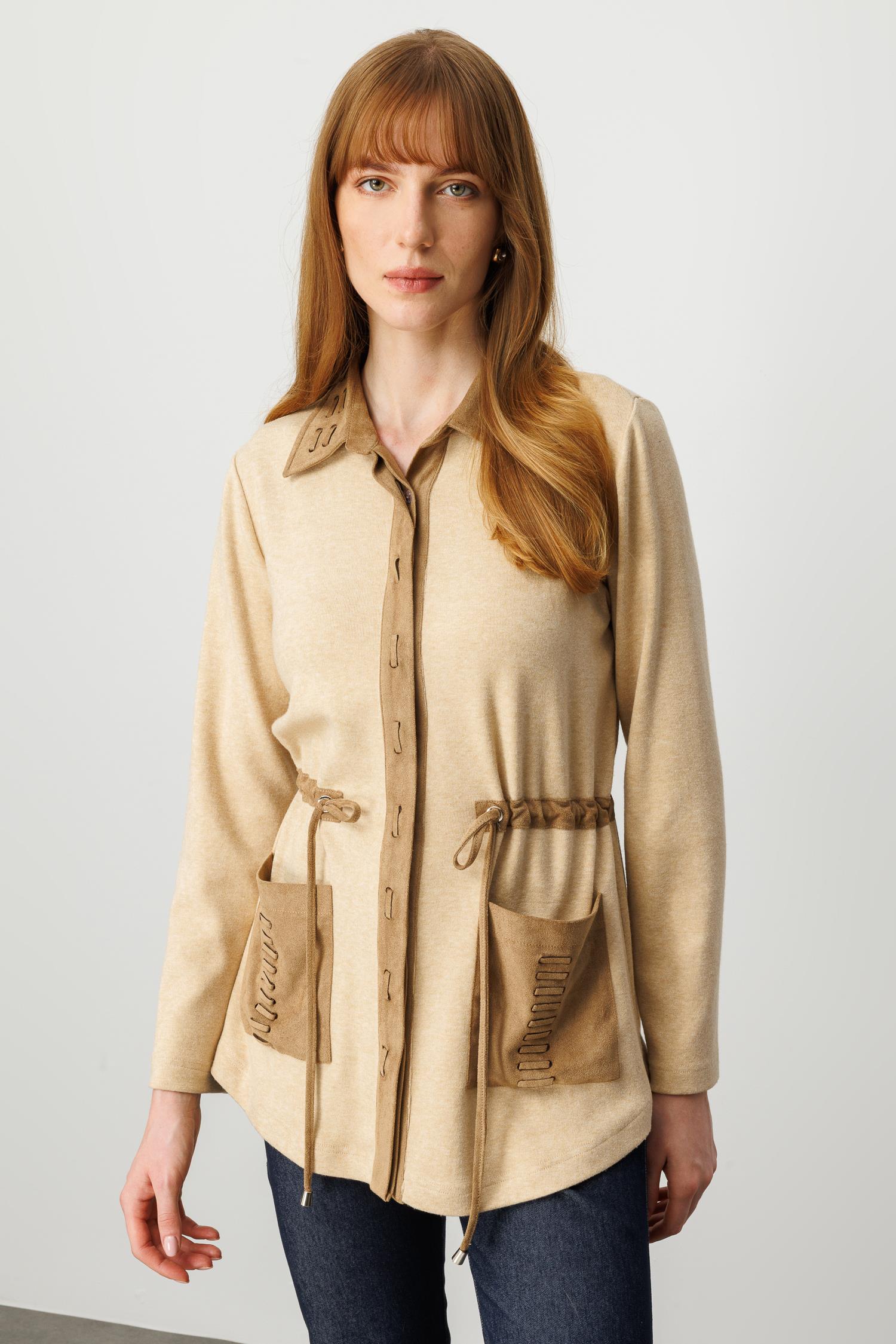 Modailgi Süet Kumaş Garni Detaylı Belden Tünel Bağcıklı Lazer Kesim Triko Gömlek Camel (ILG260GMK15052-047)