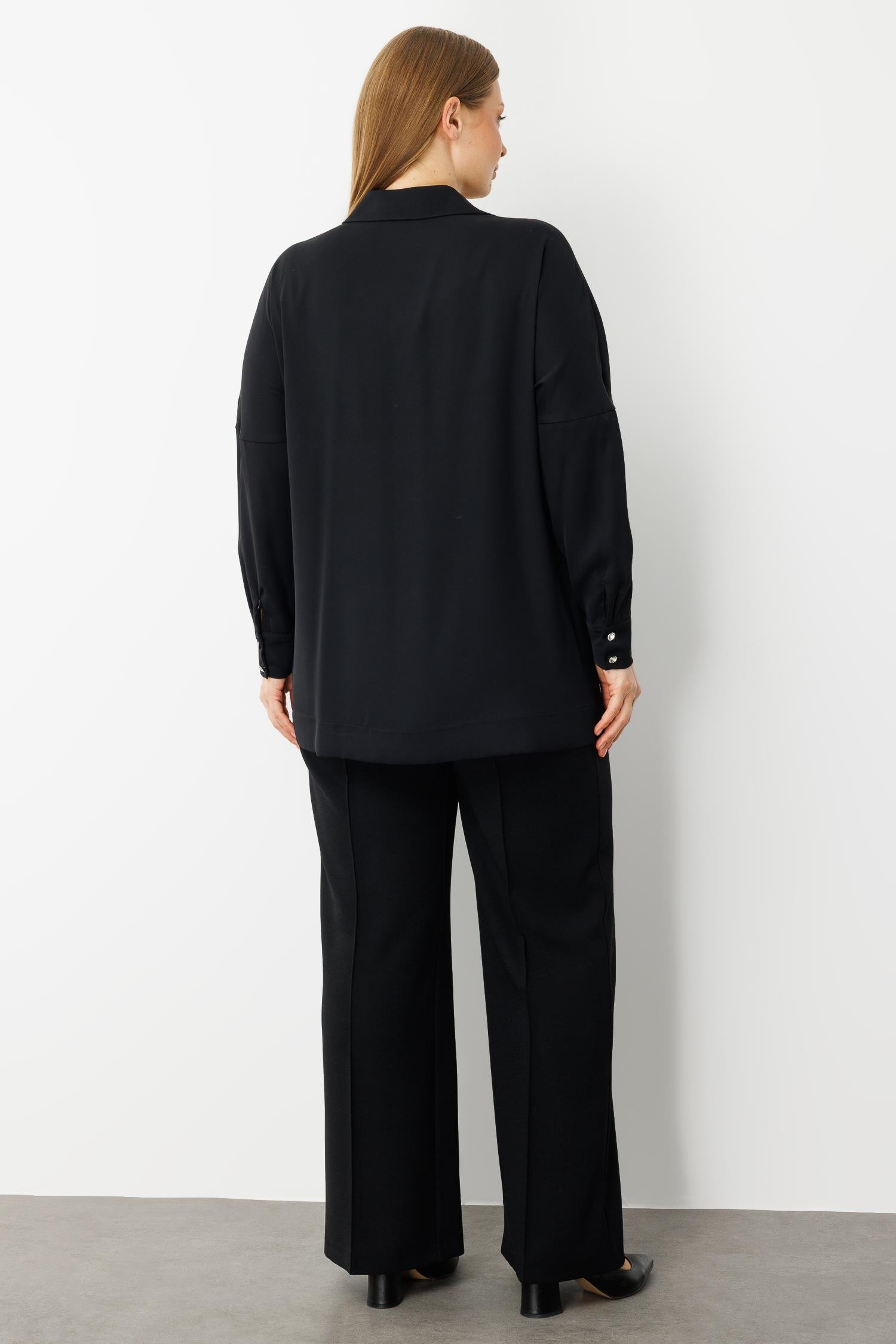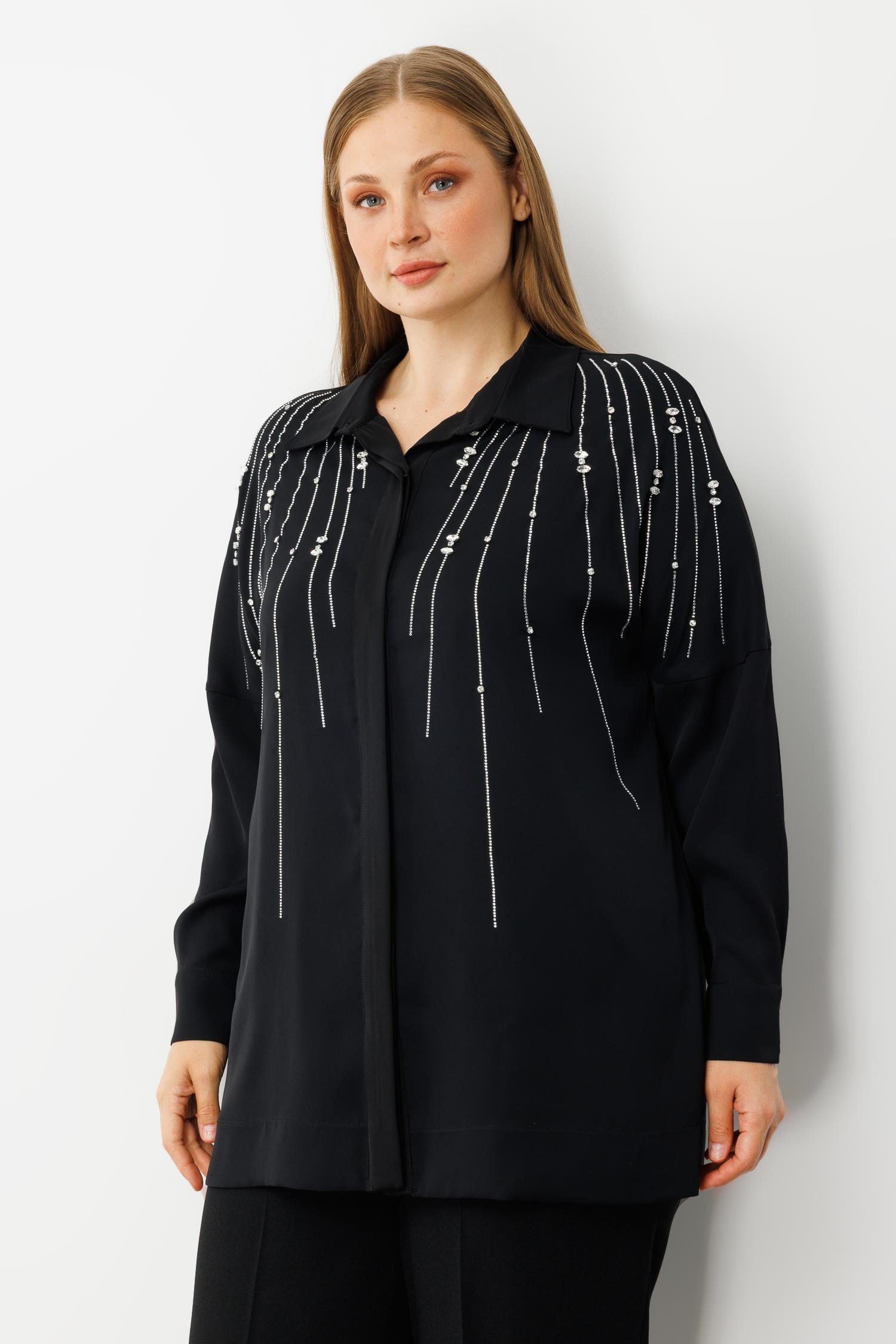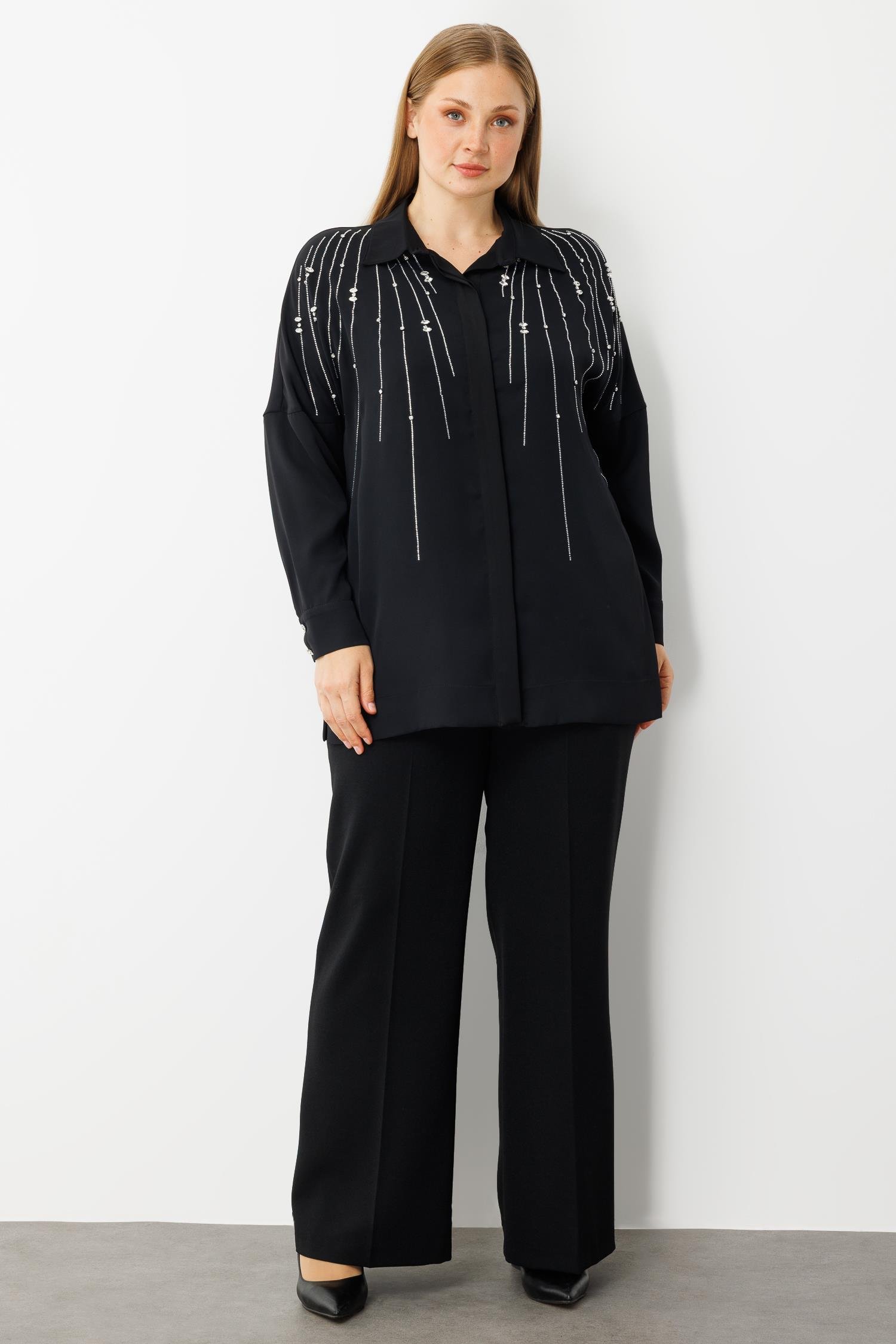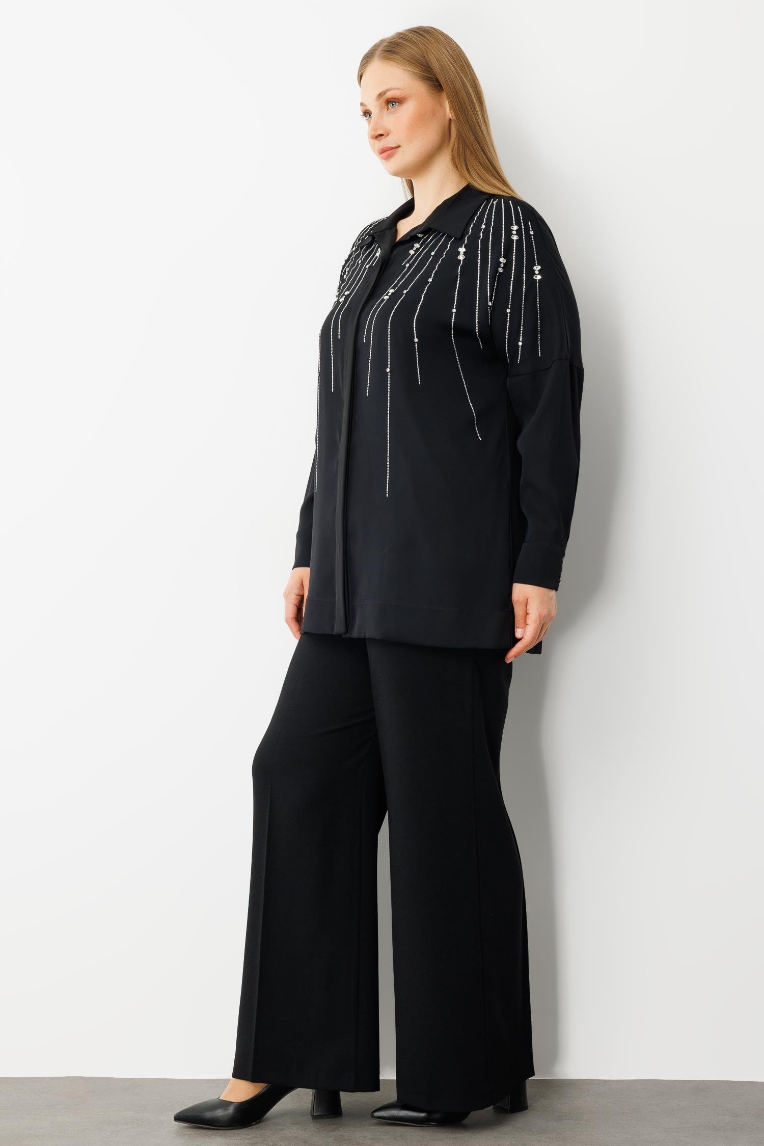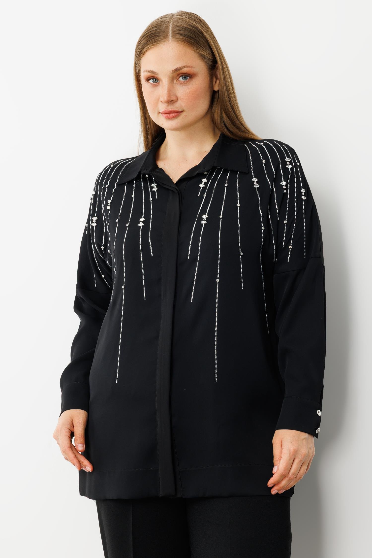 Modailgi Taş Dizgi Detaylı Gizli Pat Oversize Gömlek Siyah (GLD260GMK40040-263)