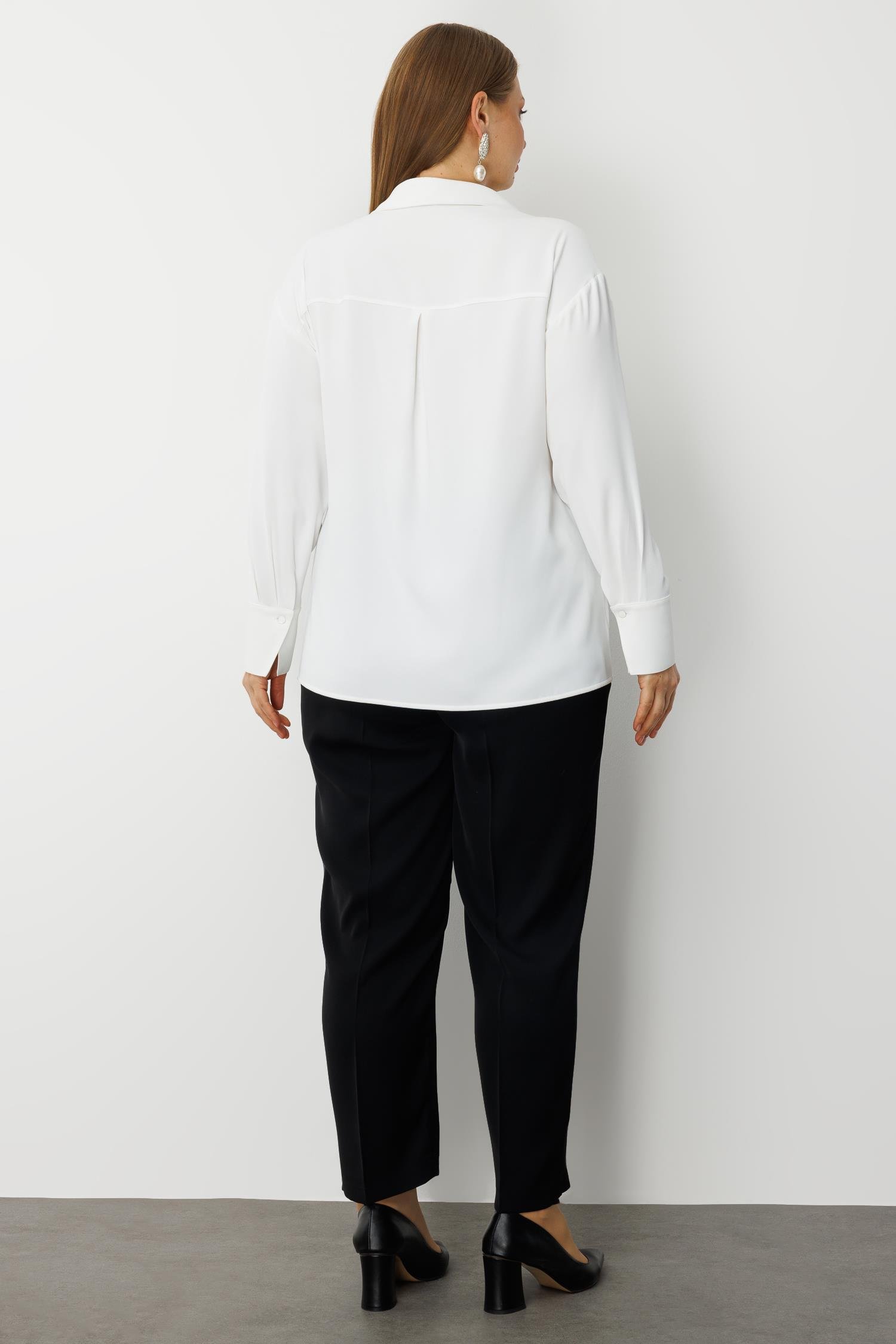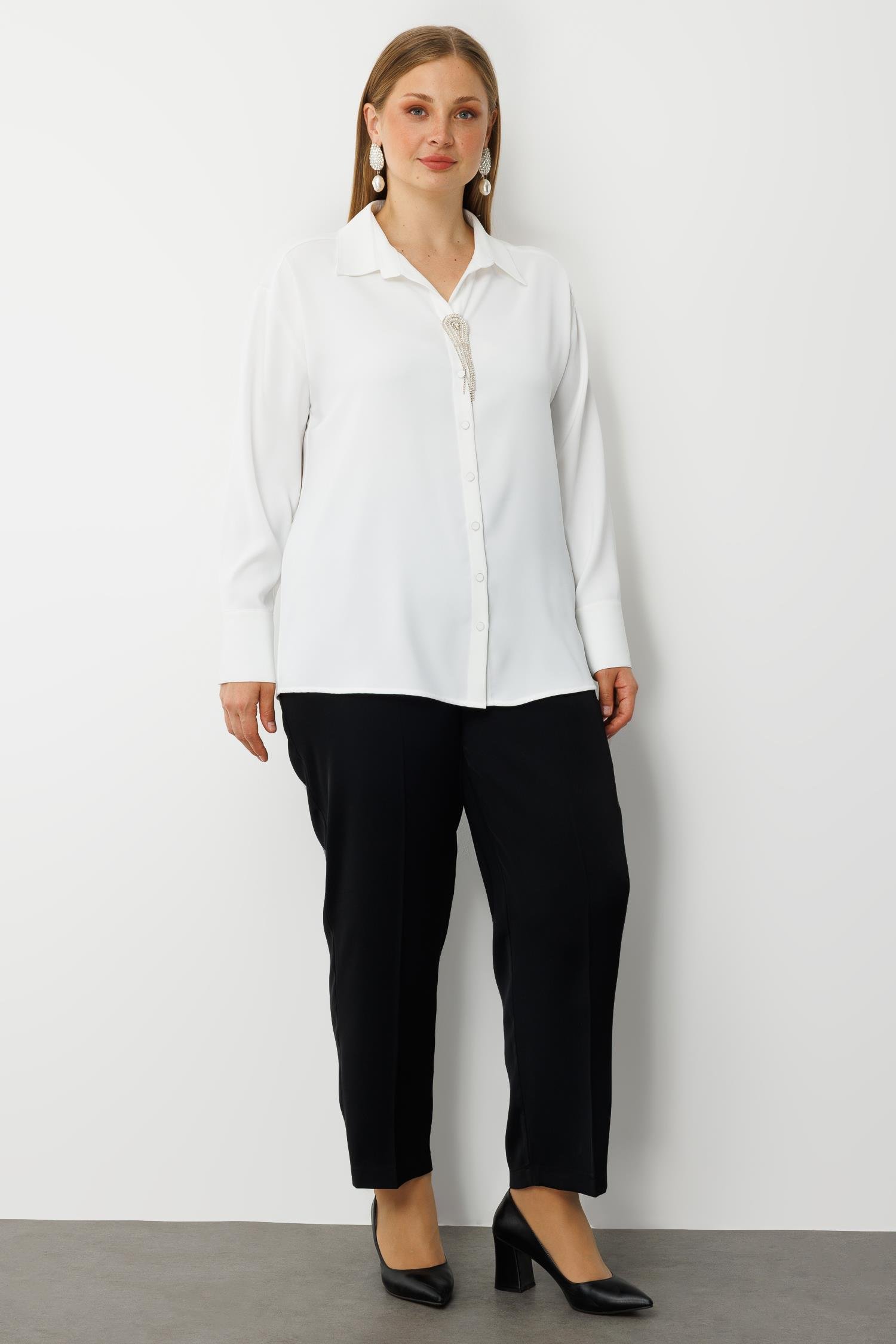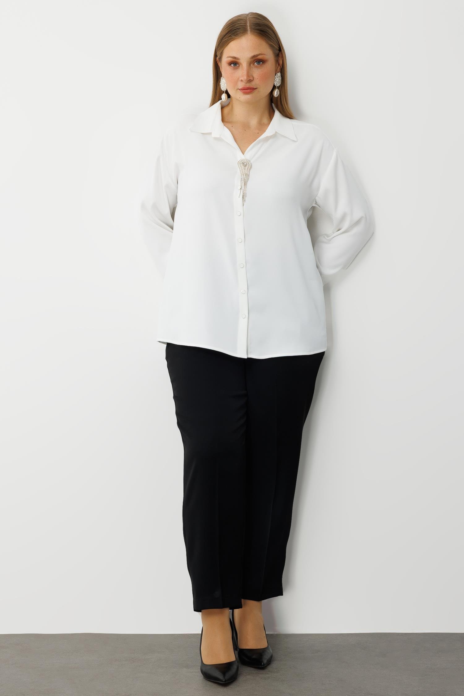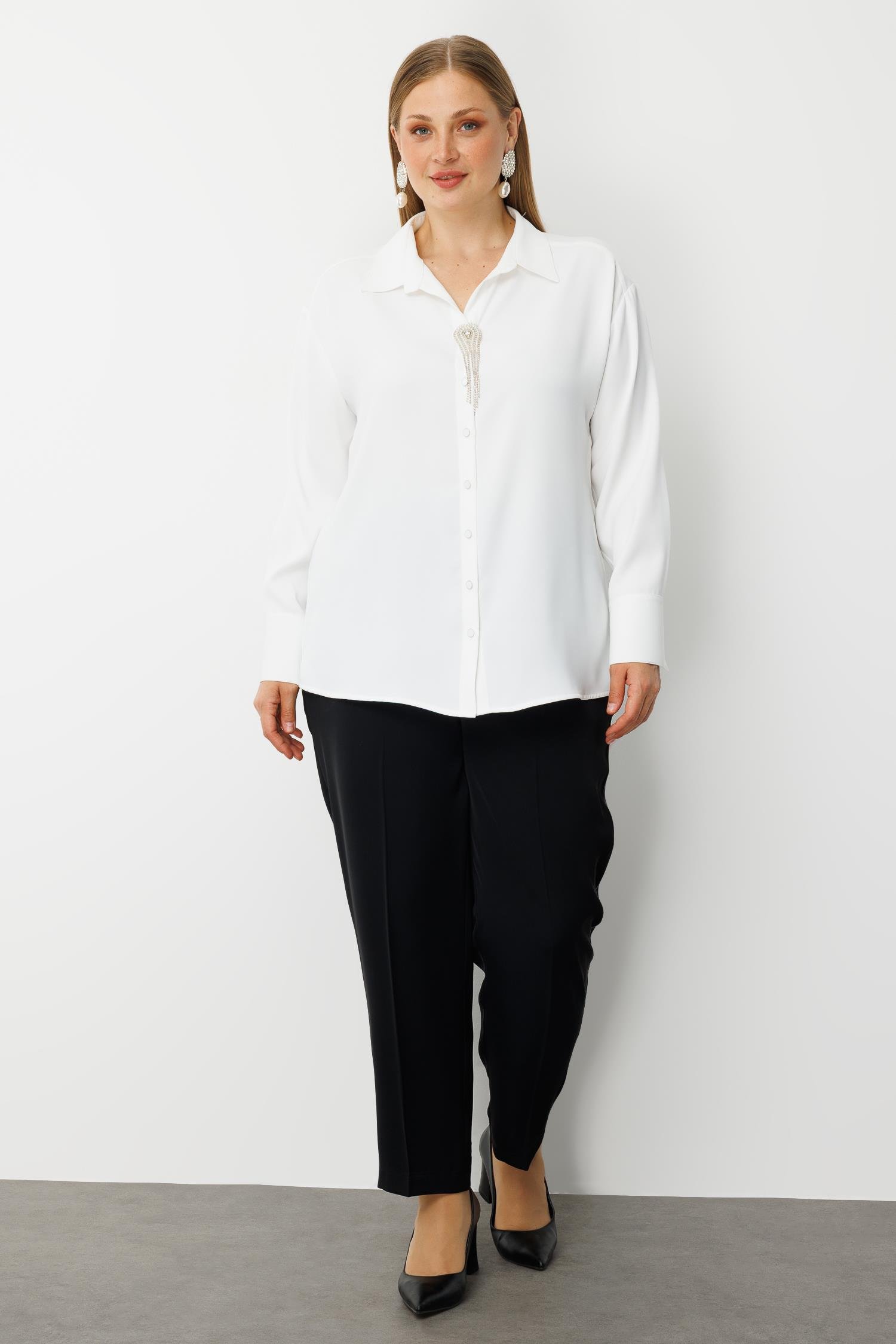 Modailgi Taşlı Broş Aksesuarlı Rahat Kesim Gömlek Ekru (GLD251GMK40033-063)