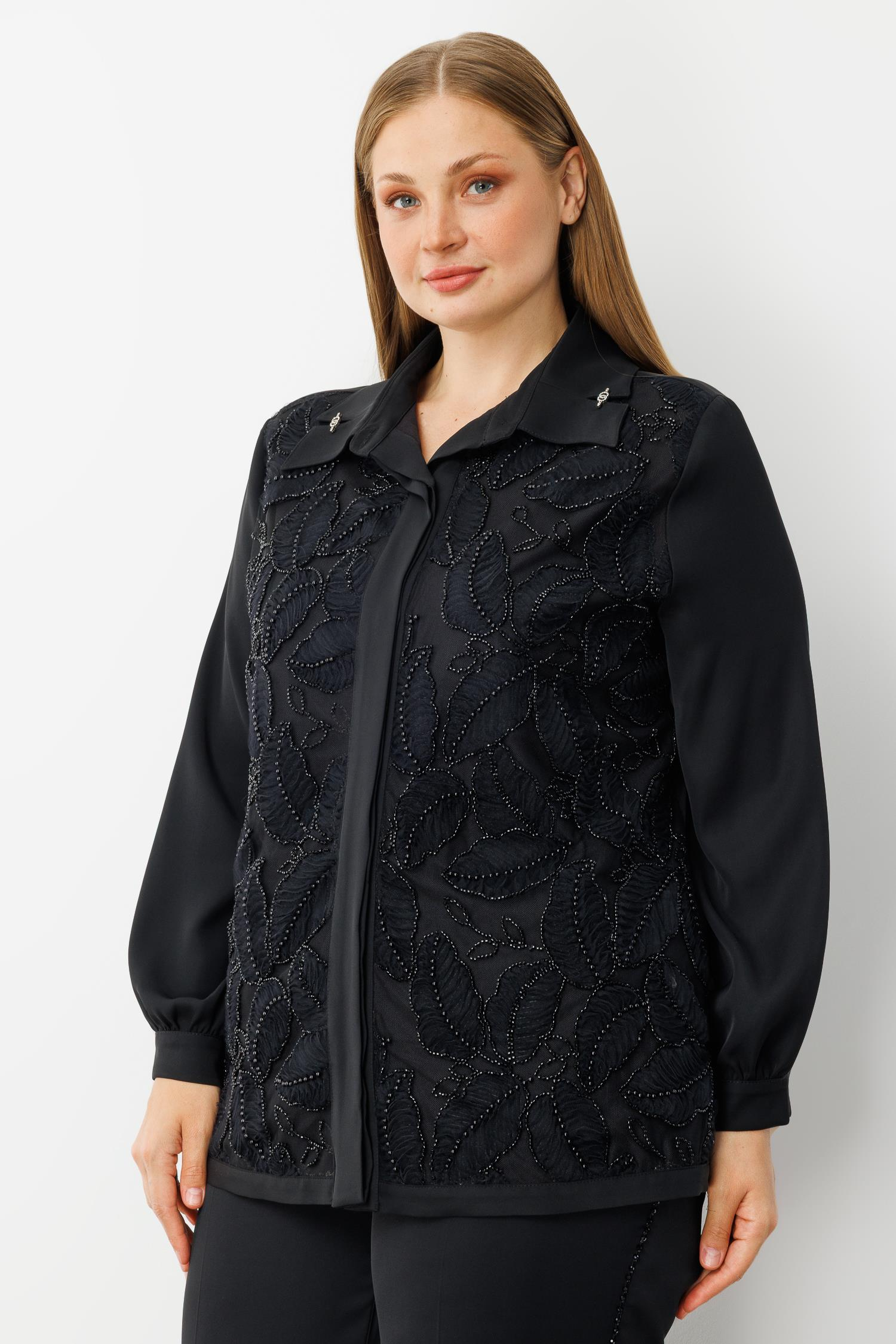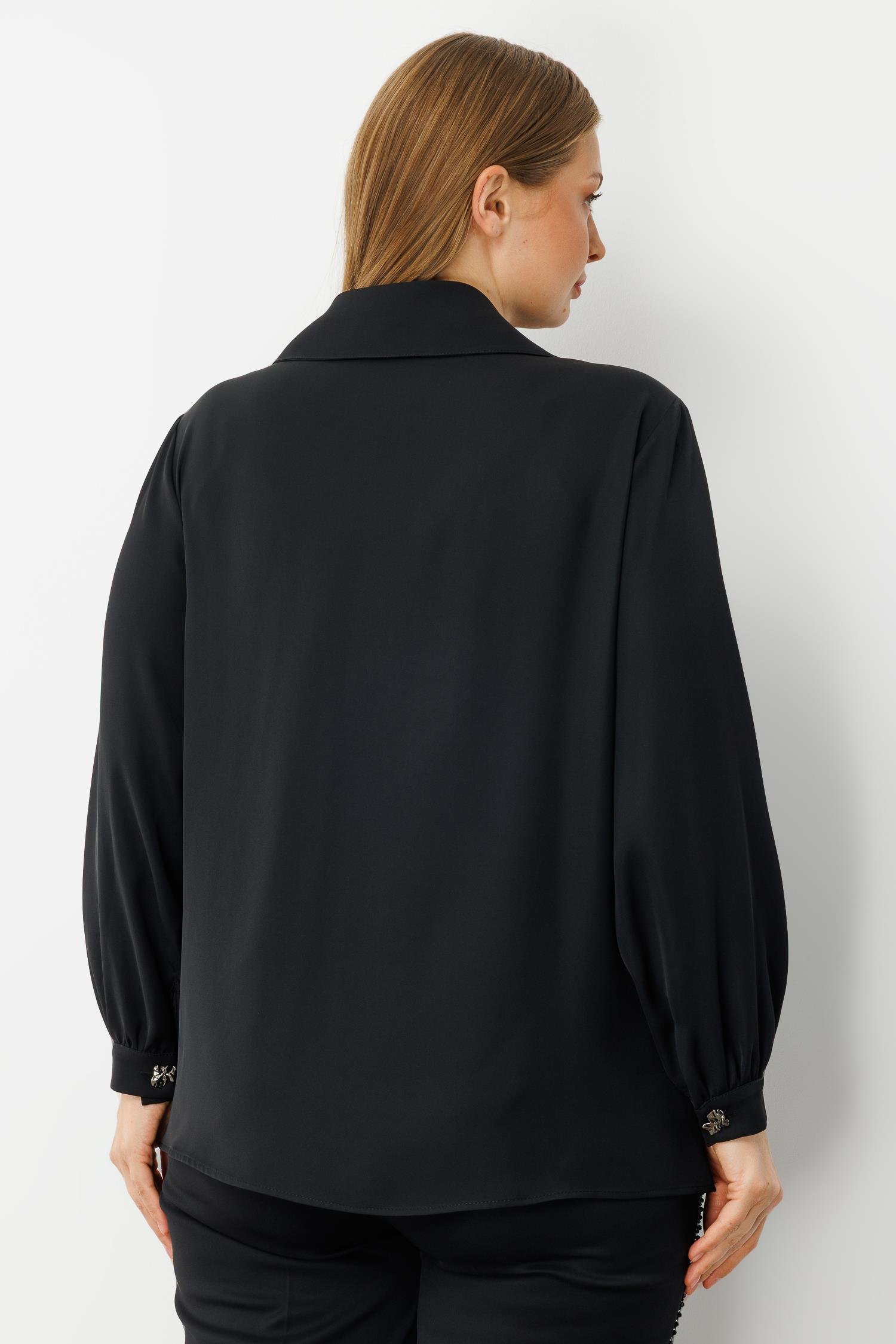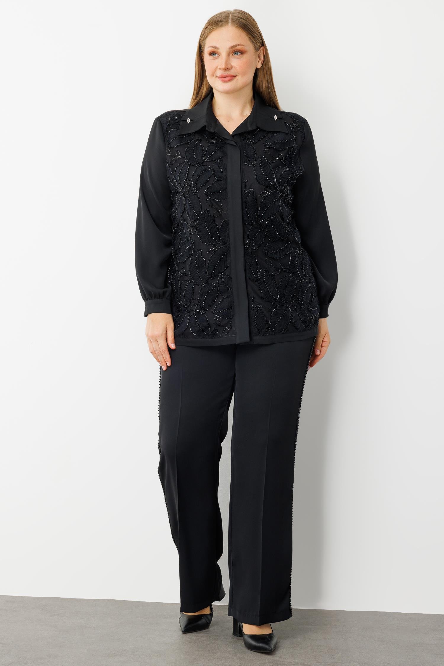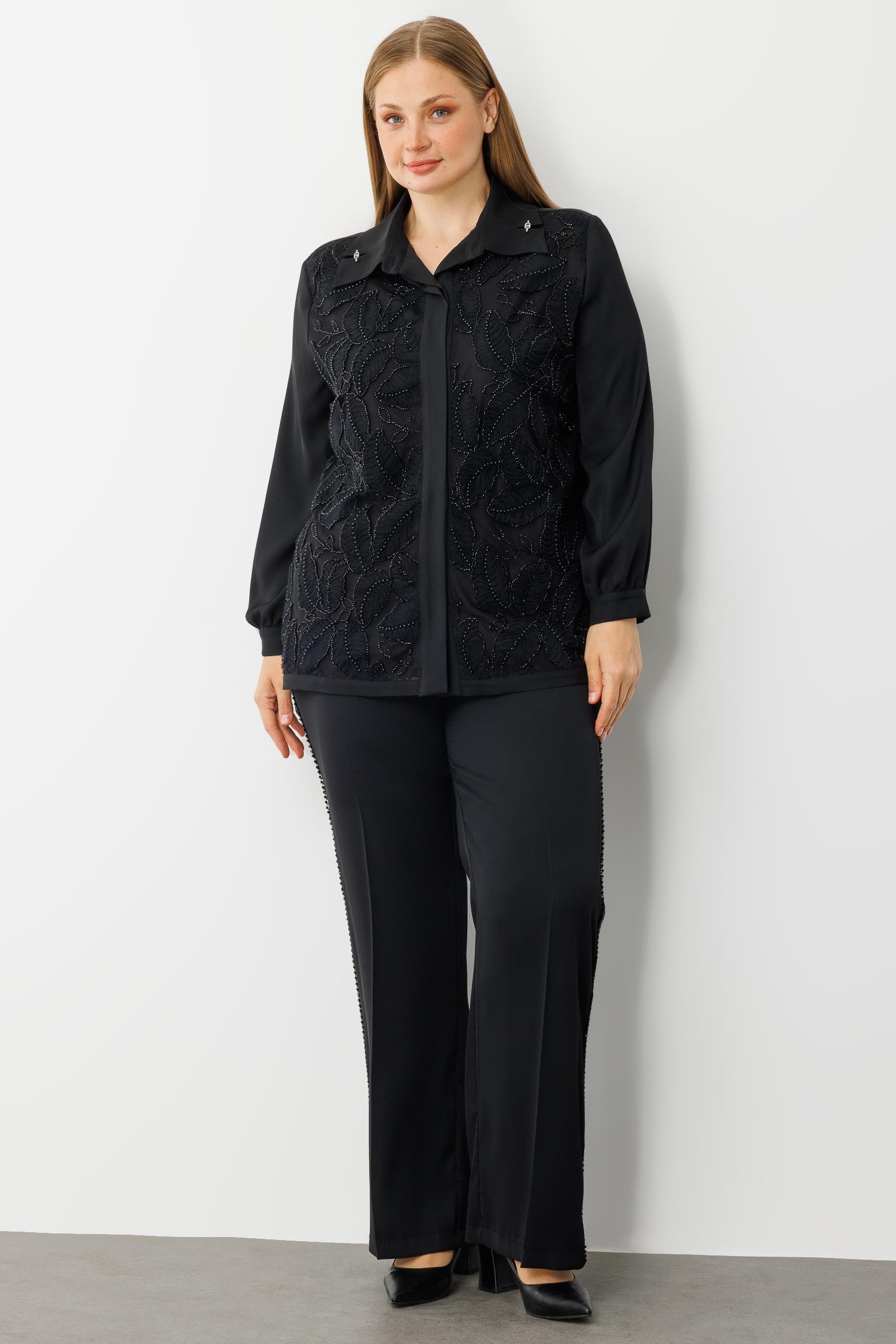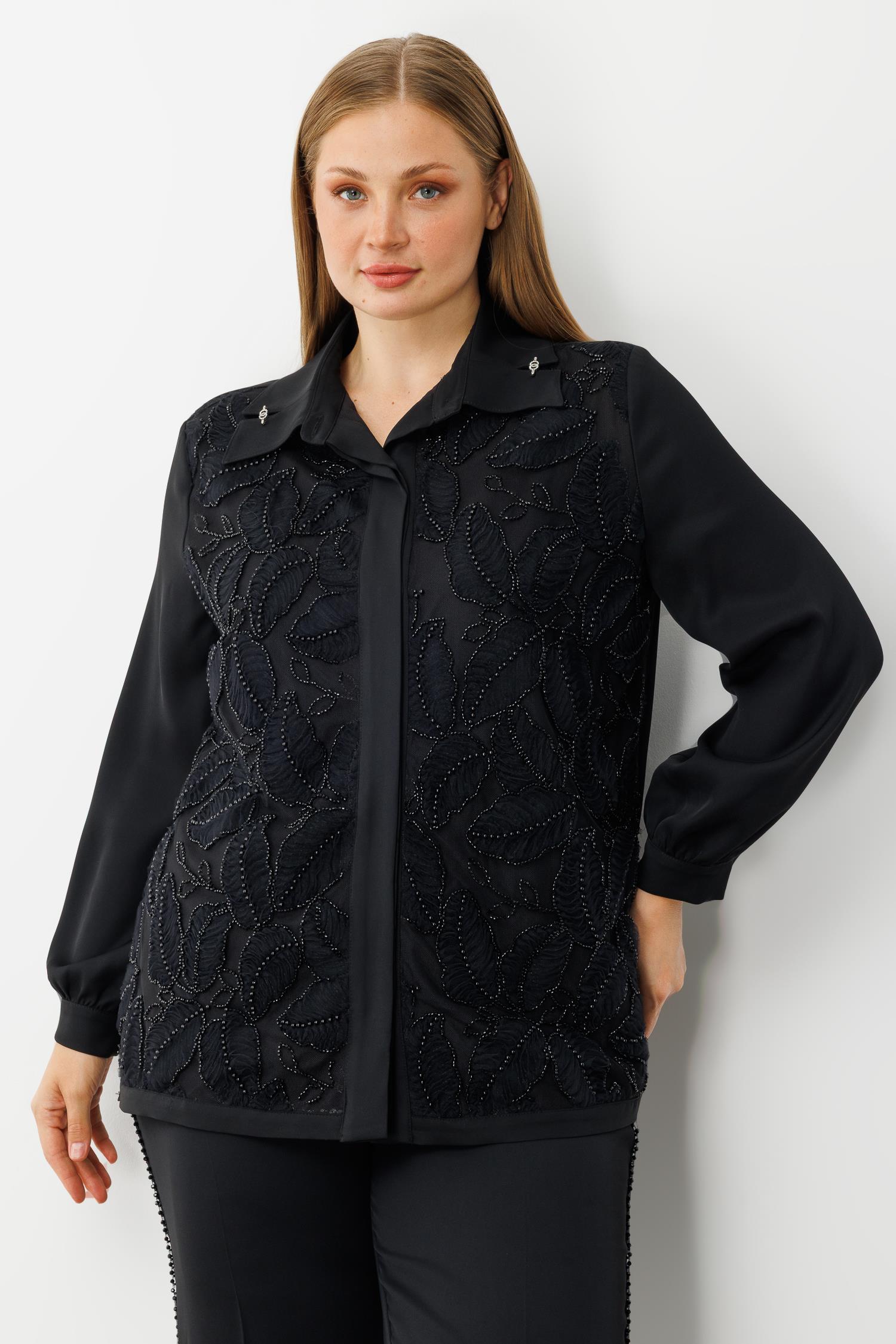 Modailgi  Yaprak Desenli Boncuk Detaylı Takma Kol Gömlek Siyah