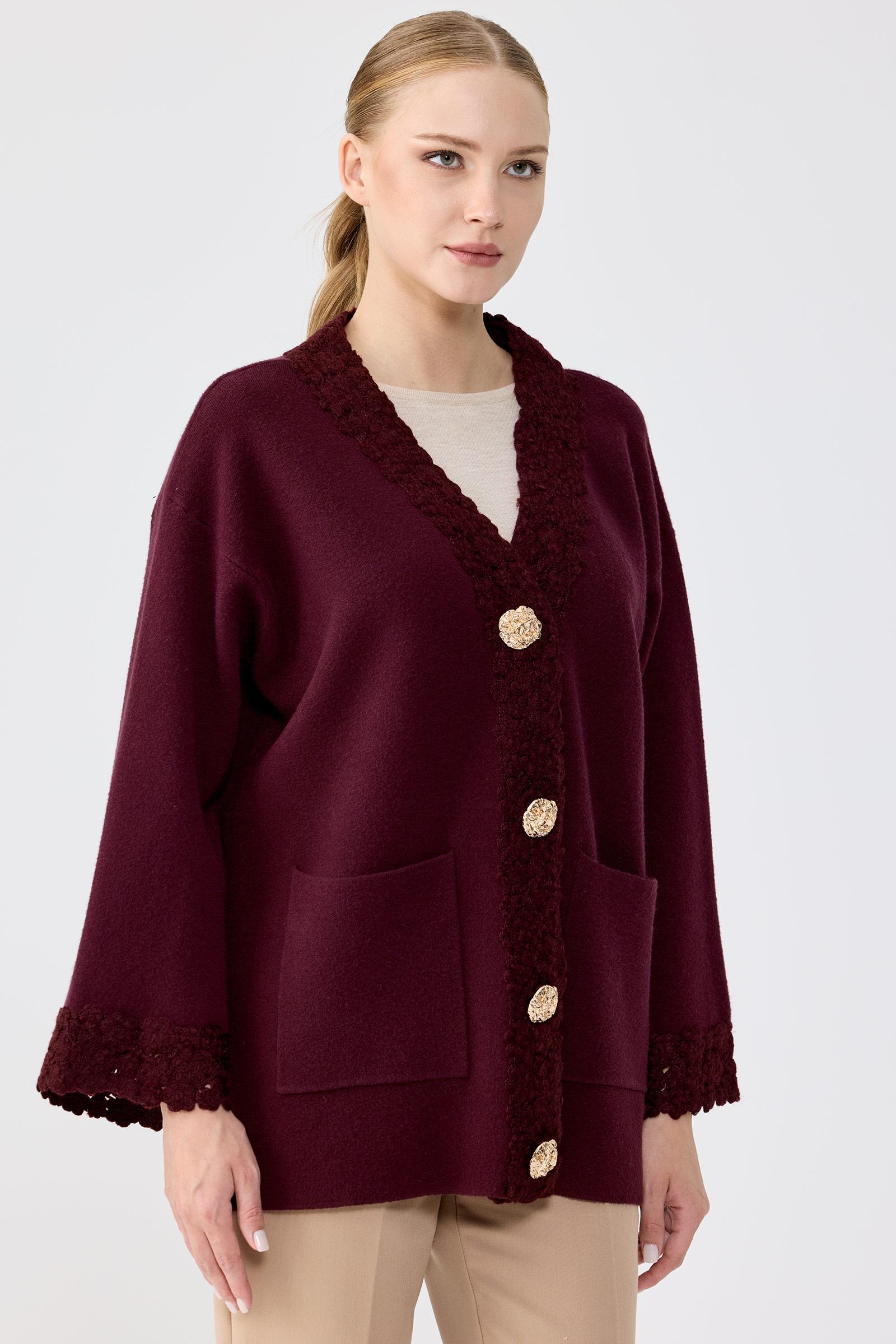 Kol Ve Pat Detaylı Düğmeli Triko Hırka BORDO (HRK.22009.1)