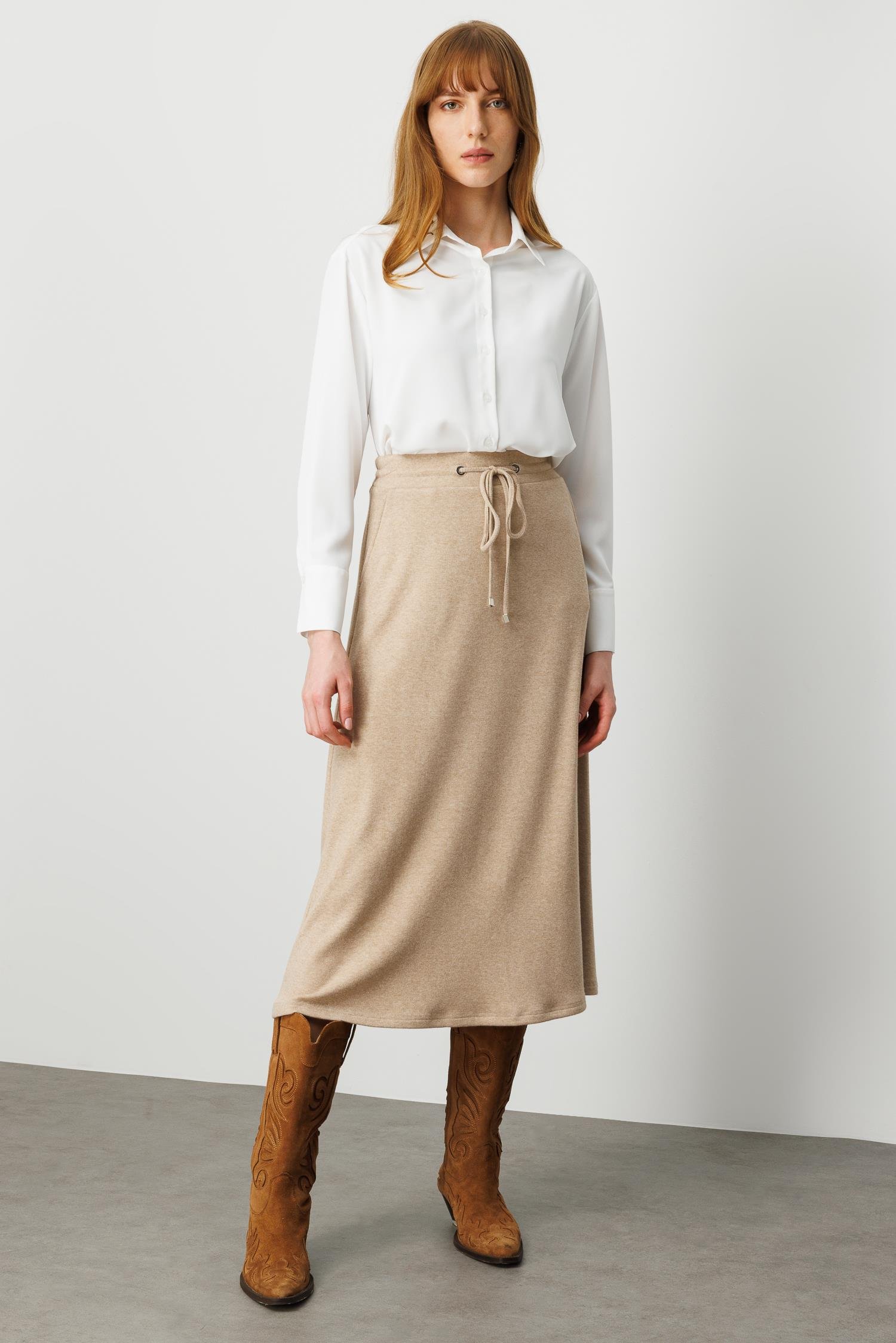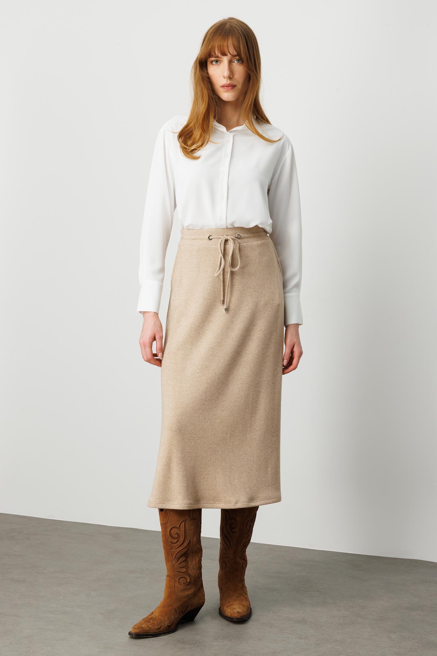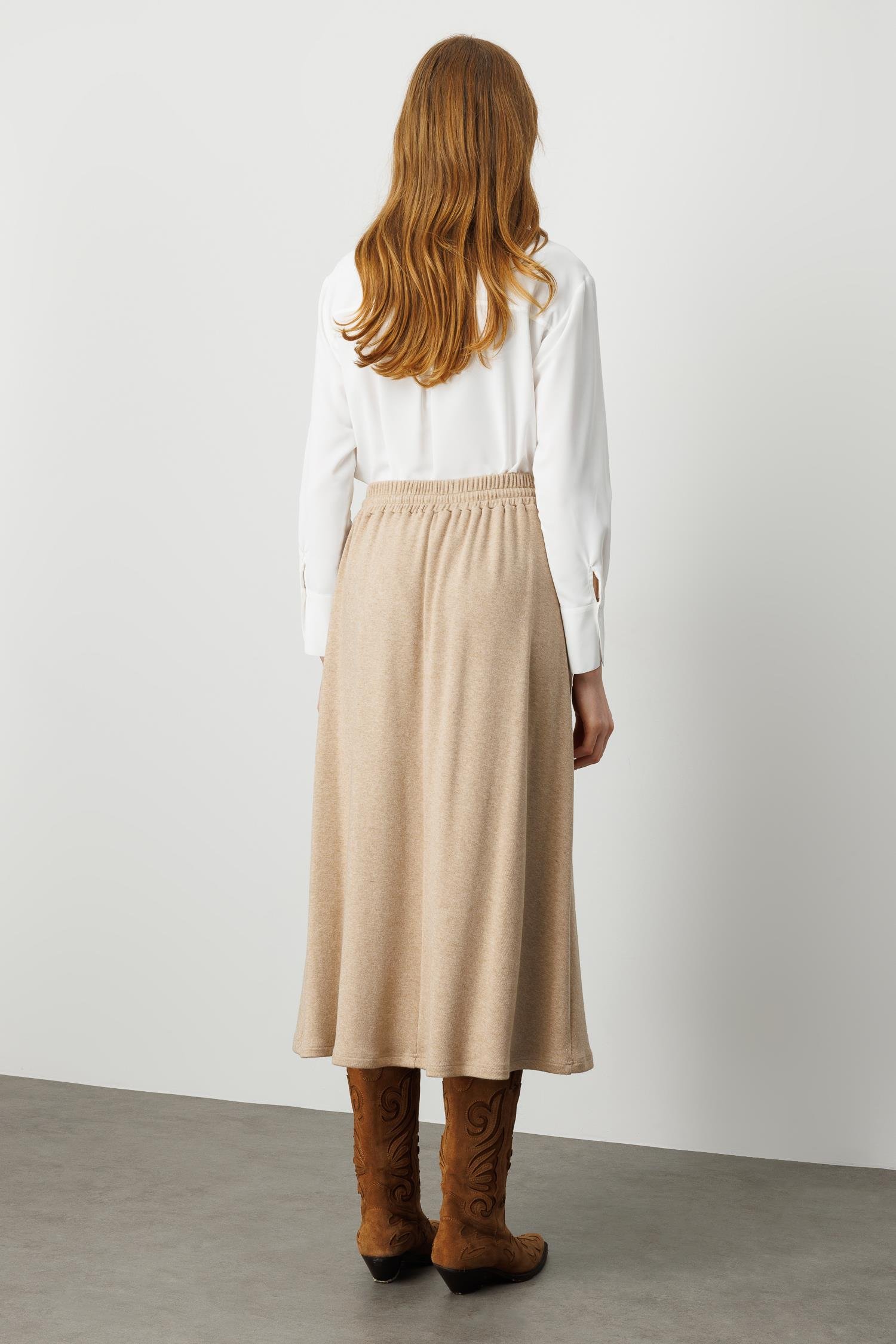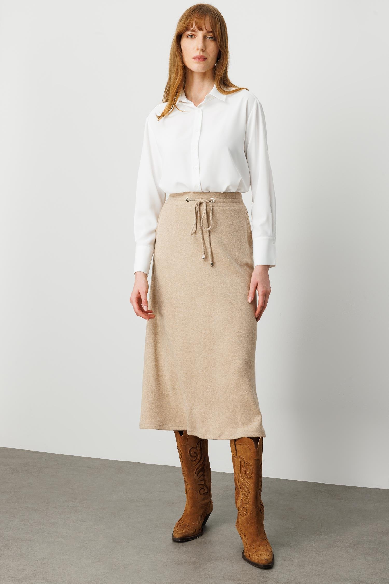 Modailgi Arka Kemeri Lastikli Önde Tünel Bağcıklı Yandan Cepli Midi Boy Triko Etek - Vizon