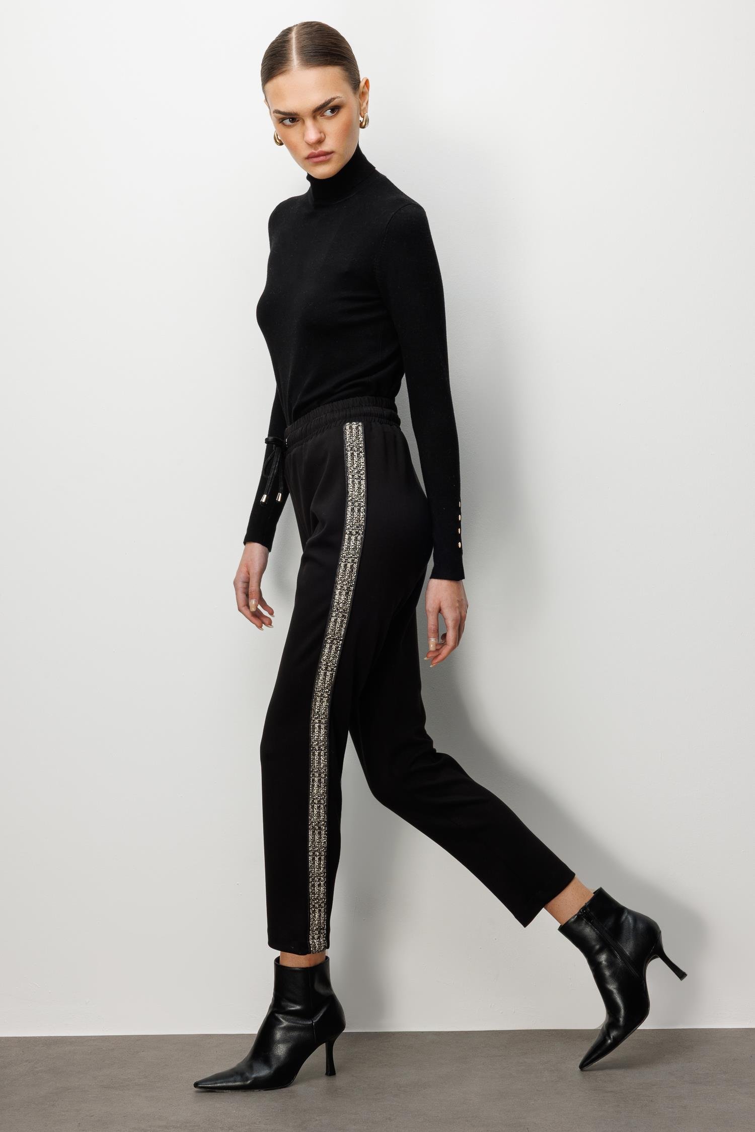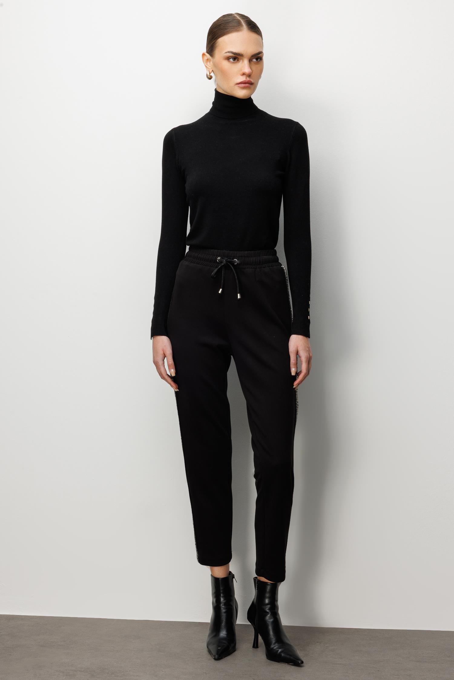 Model: Günlük hayatta konforu ve modern sportif şıklığı bir araya getiren, beli lastikli ve biye detaylı örme pantolon.