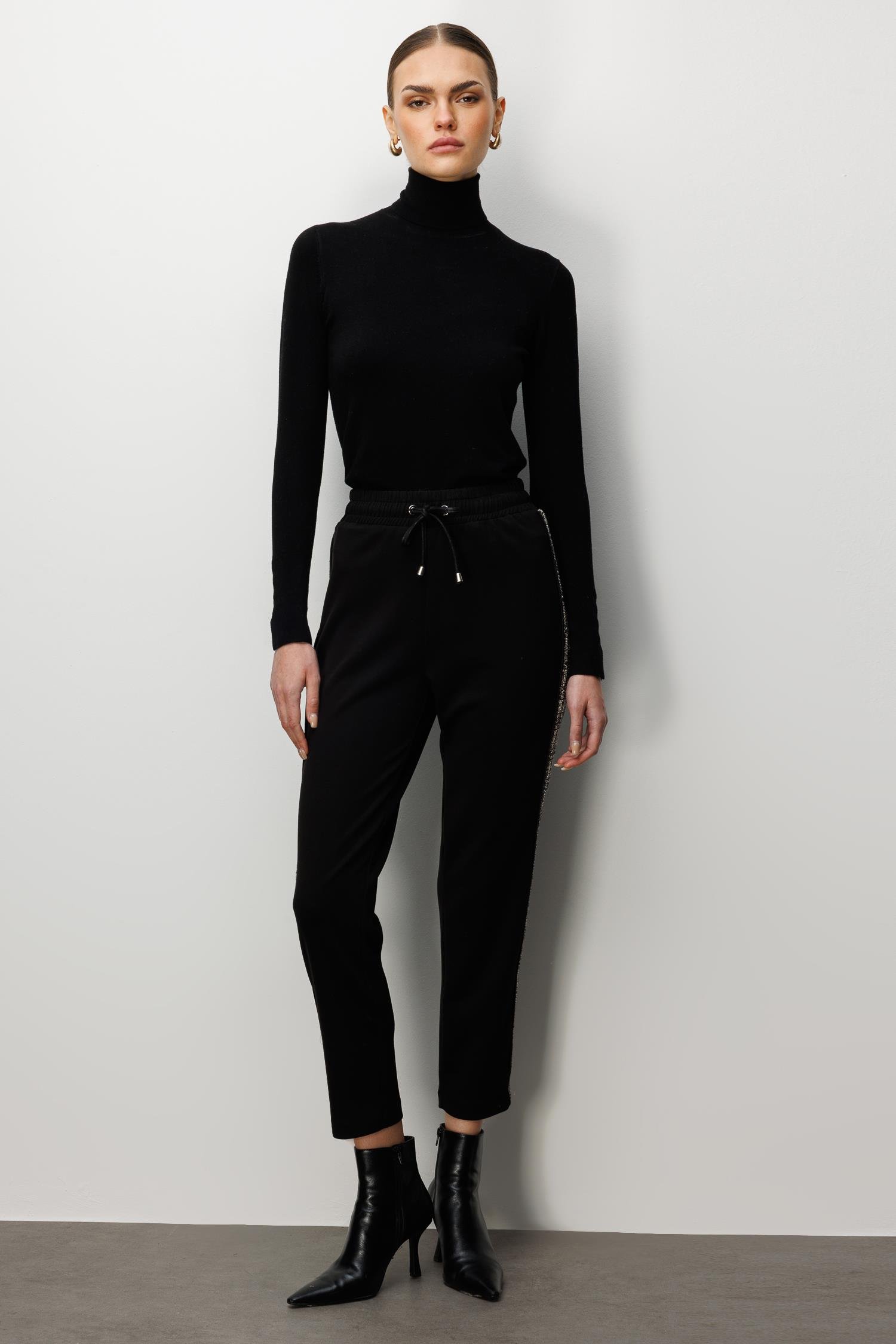 Bu pantolon, modern kadının bitmek bilmeyen günlük temposunda "hem rahat hem de stil sahibi olma" ihtiyacından ilham alınarak tasarlandı. Ev konforunu sokağın dinamizmiyle buluşturan örme dokusu, spor giyimin kurallarını yeniden yazıyor. Yanlardaki şerit ve biye oyunları, klasik bir eşofman altını sofistike bir şehir parçasına dönüştüren ince mühendislik dokunuşlarıdır.