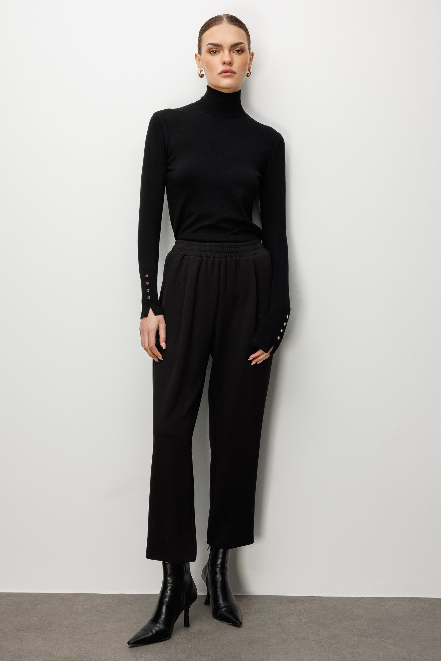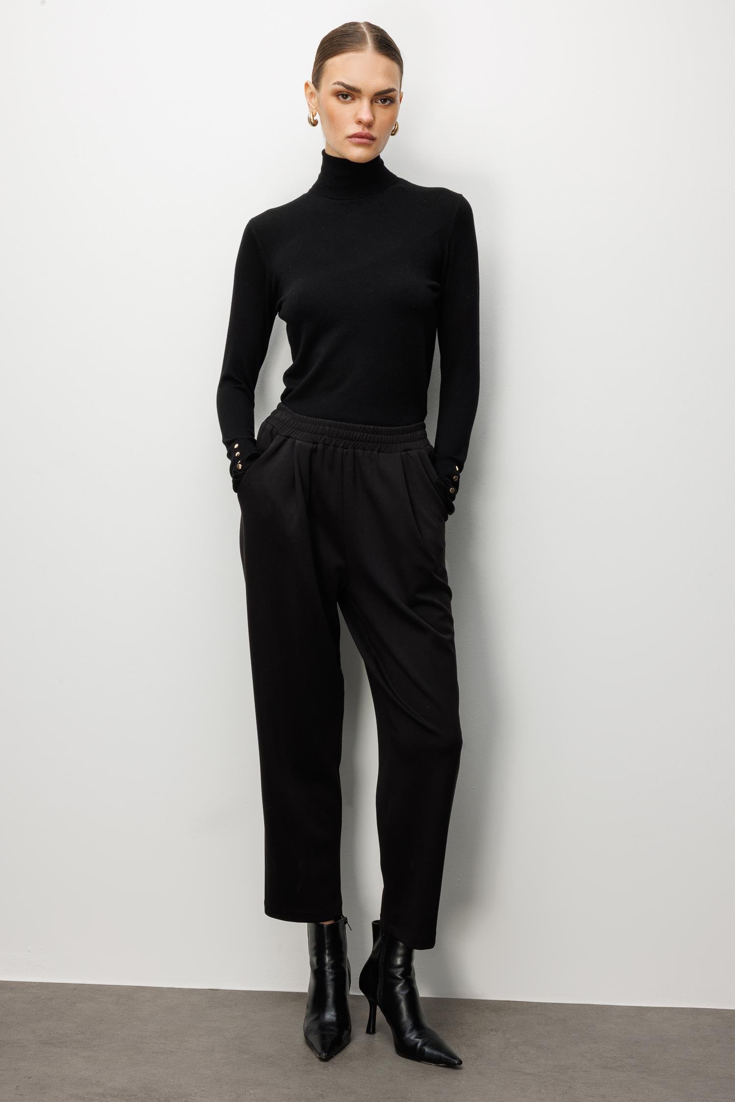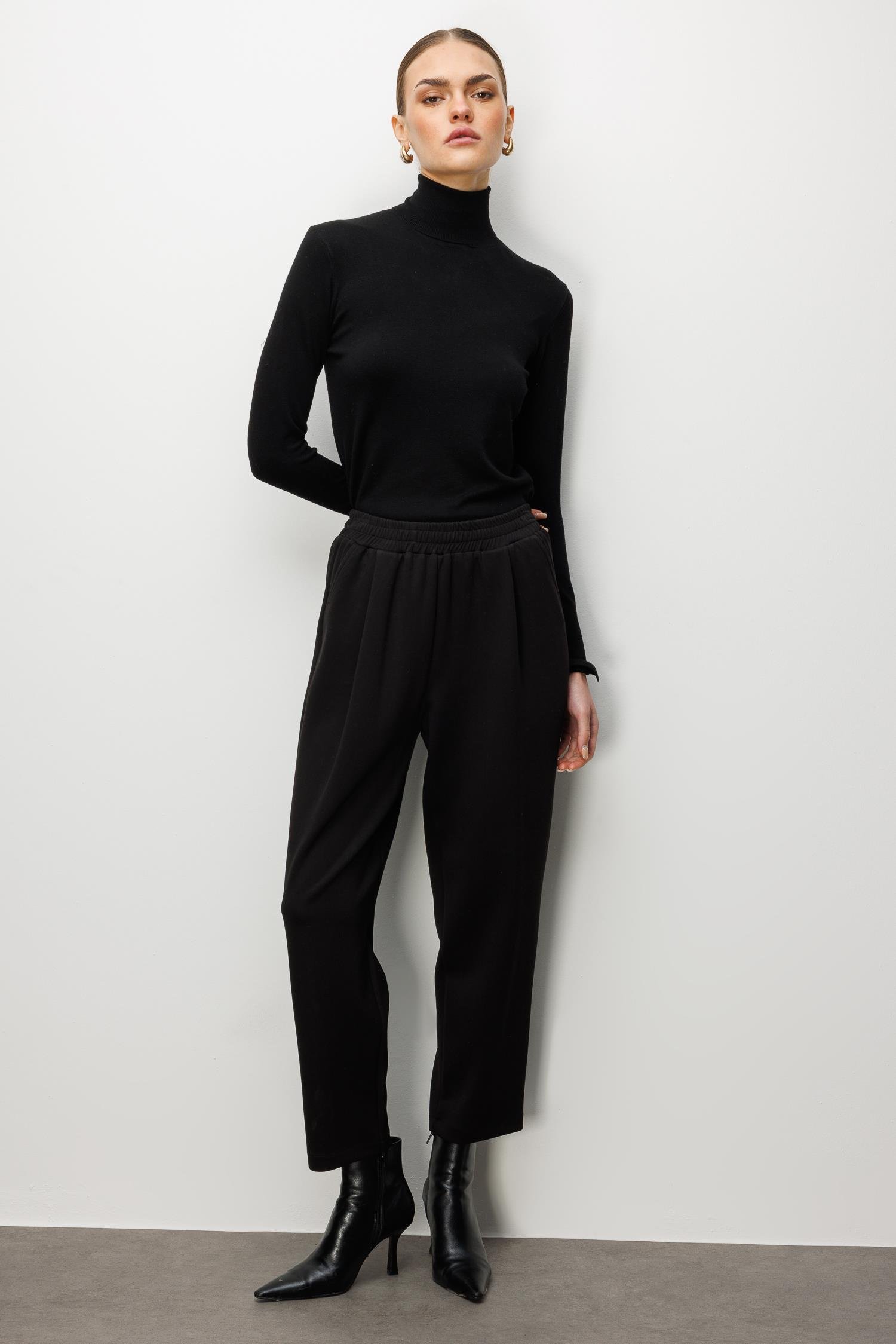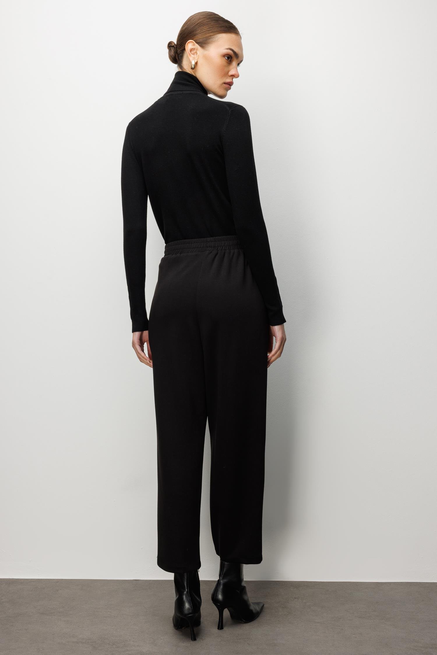 Model: Klasik pantolon şıklığını örme kumaşın konforuyla birleştiren, pile detaylı ve yüksek bel örme pantolon.