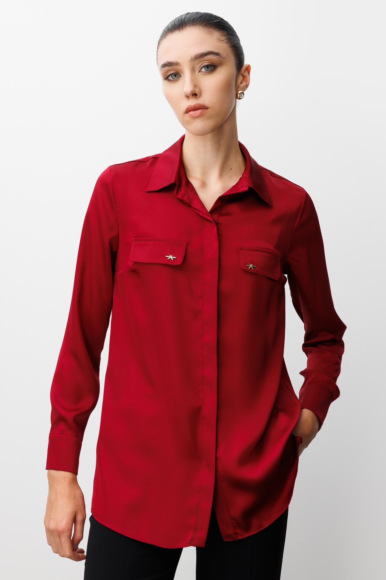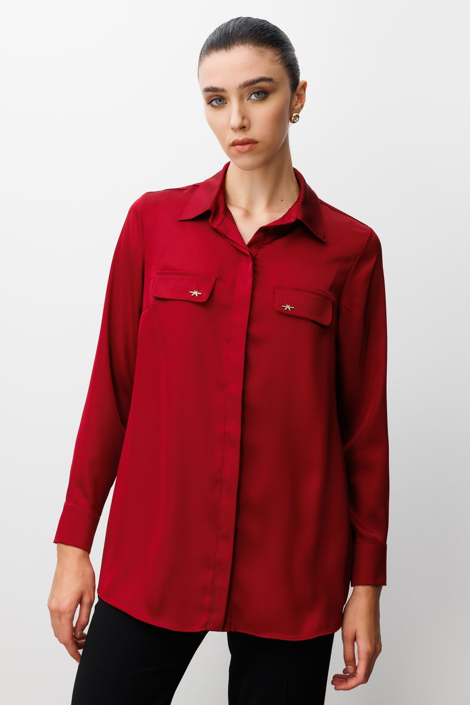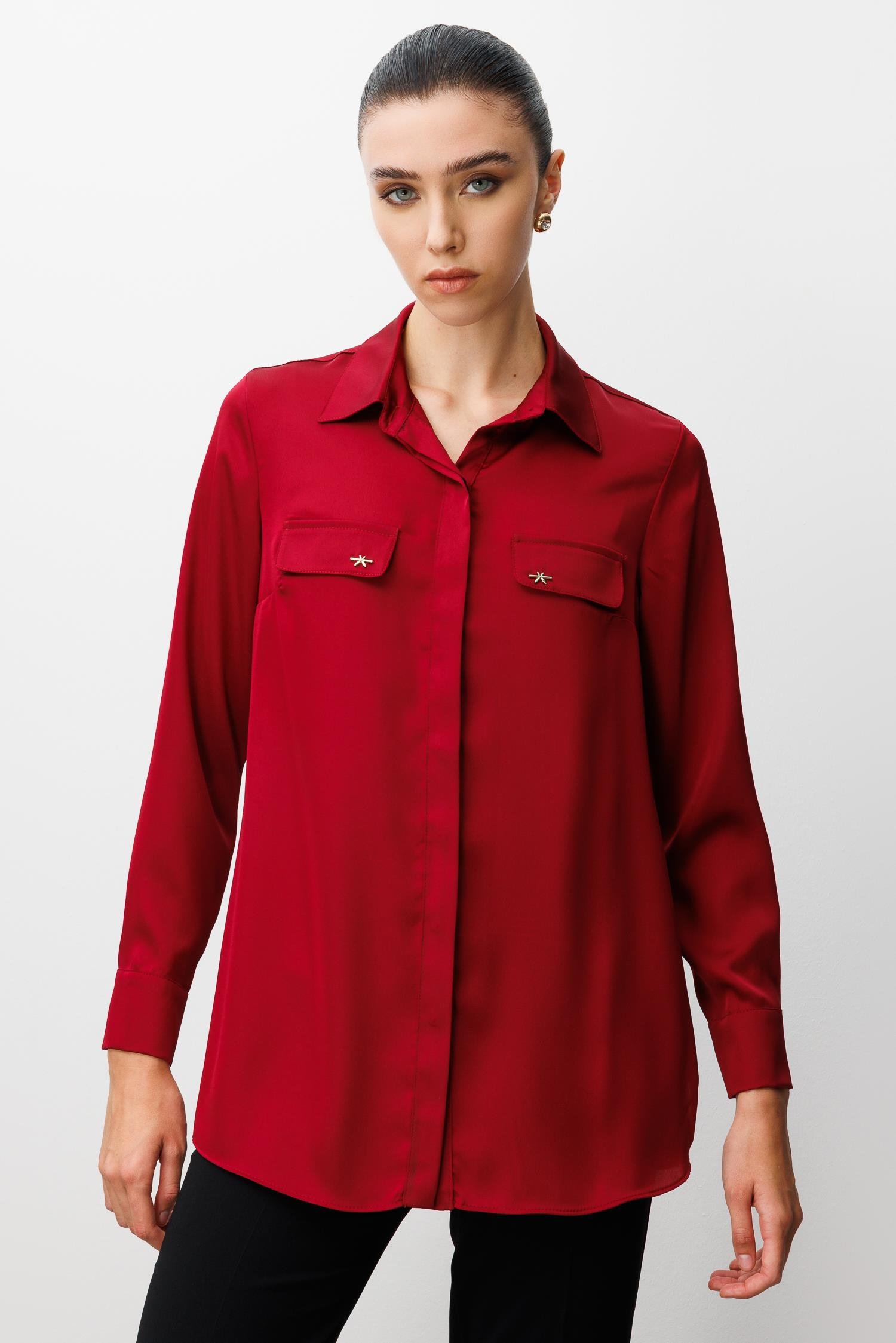 Modailgi Cep Kapaklı Kolları Apoletli Saten Gömlek - Bordo