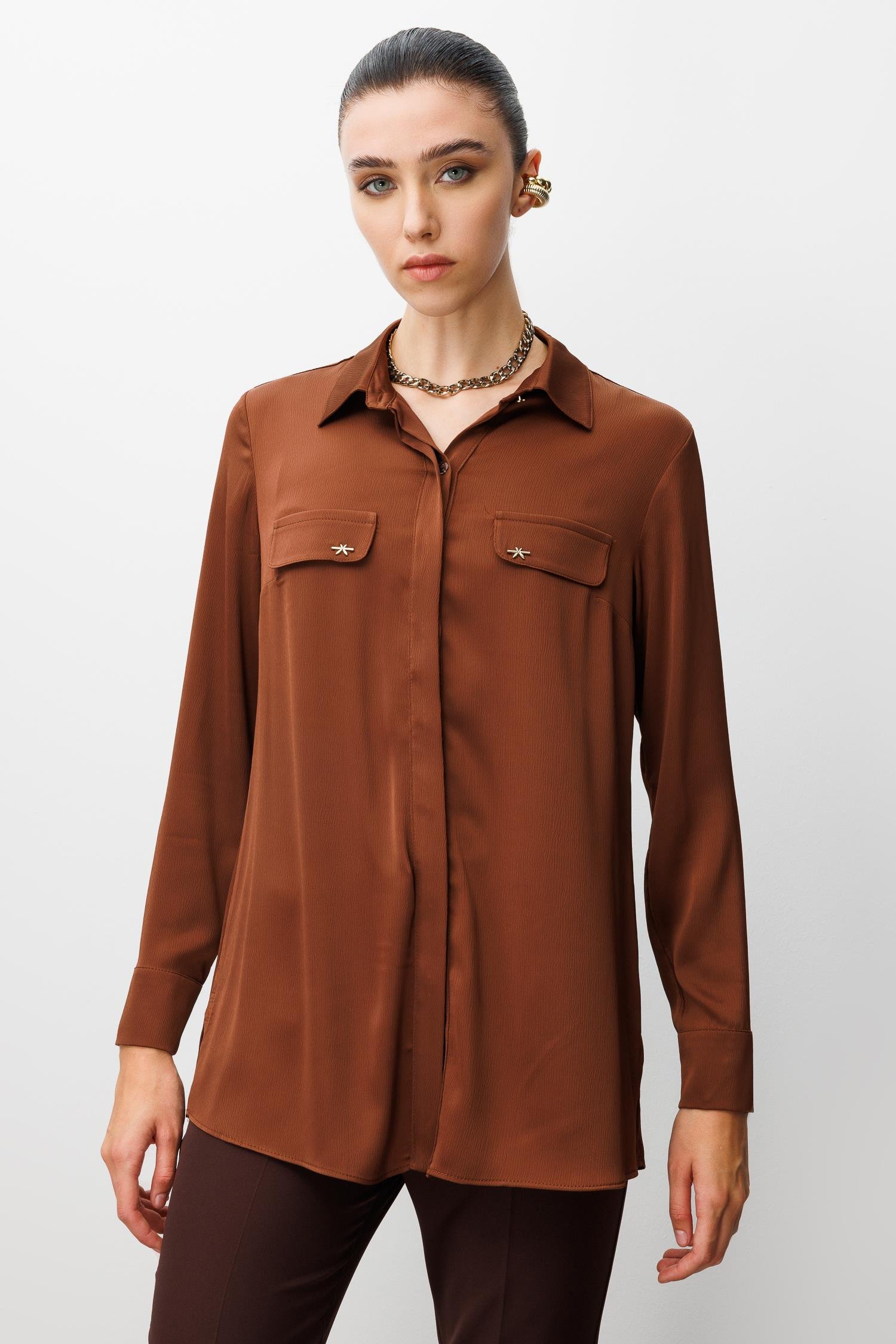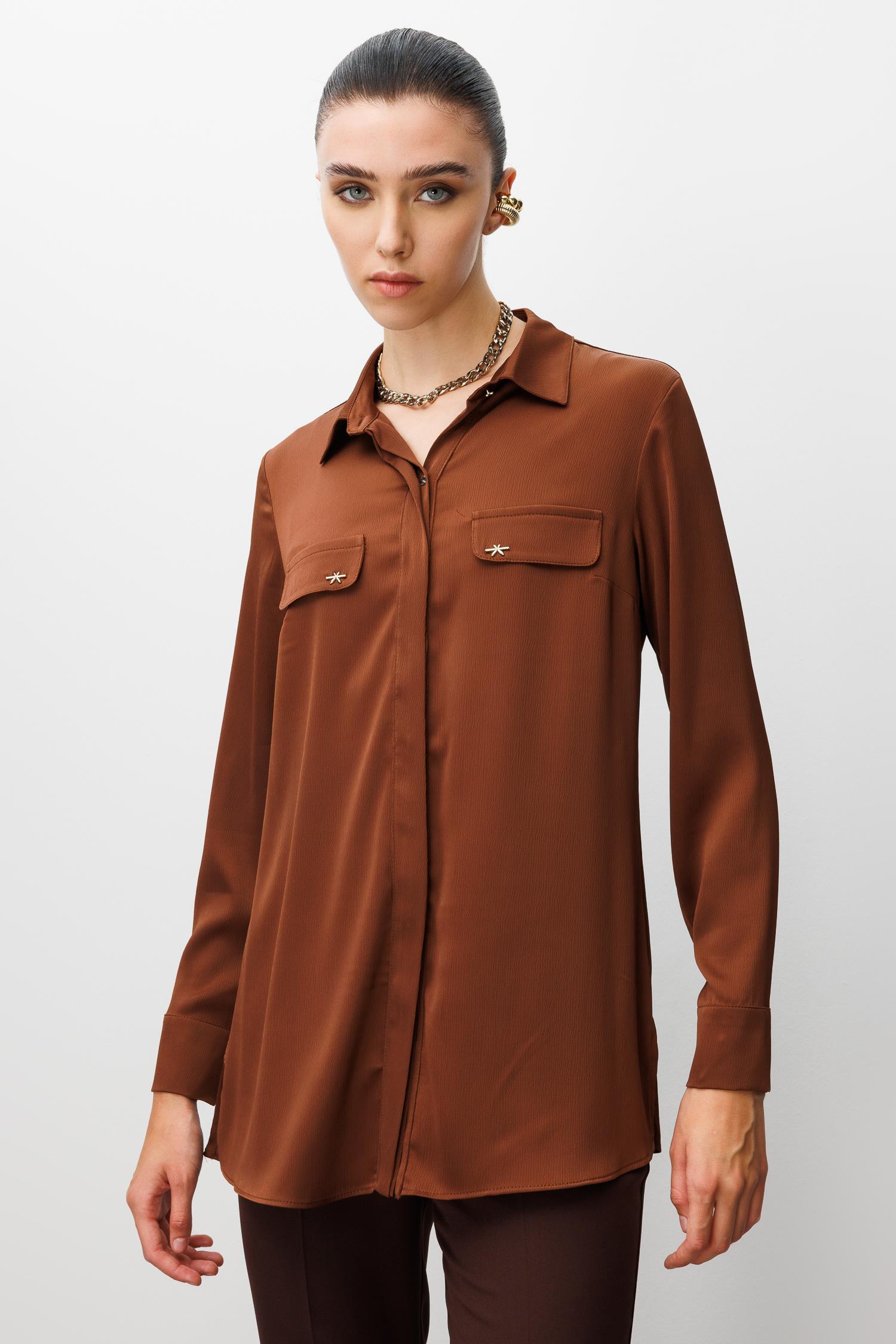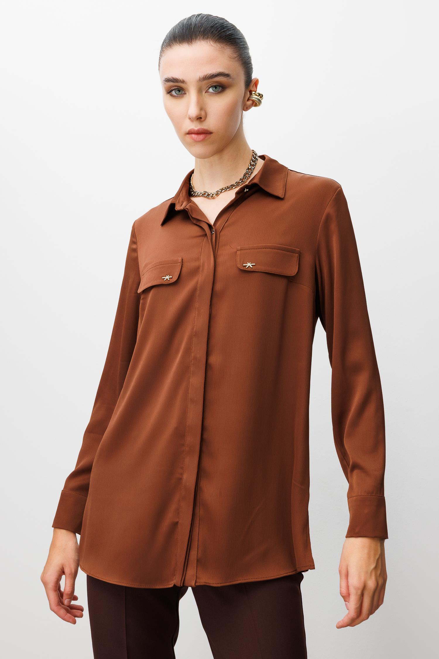 Modailgi Cep Kapaklı Kolları Apoletli Saten Gömlek - Kahve