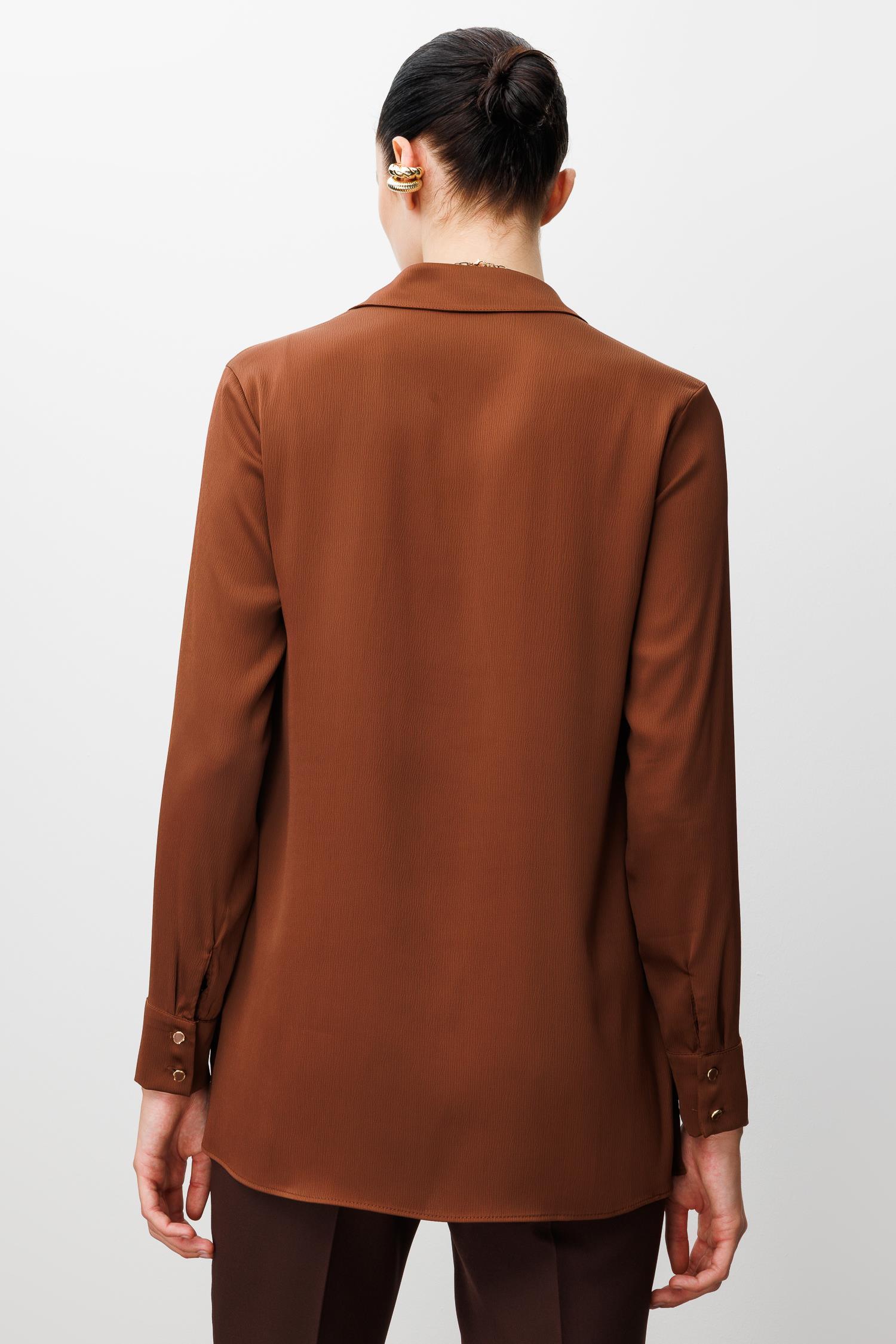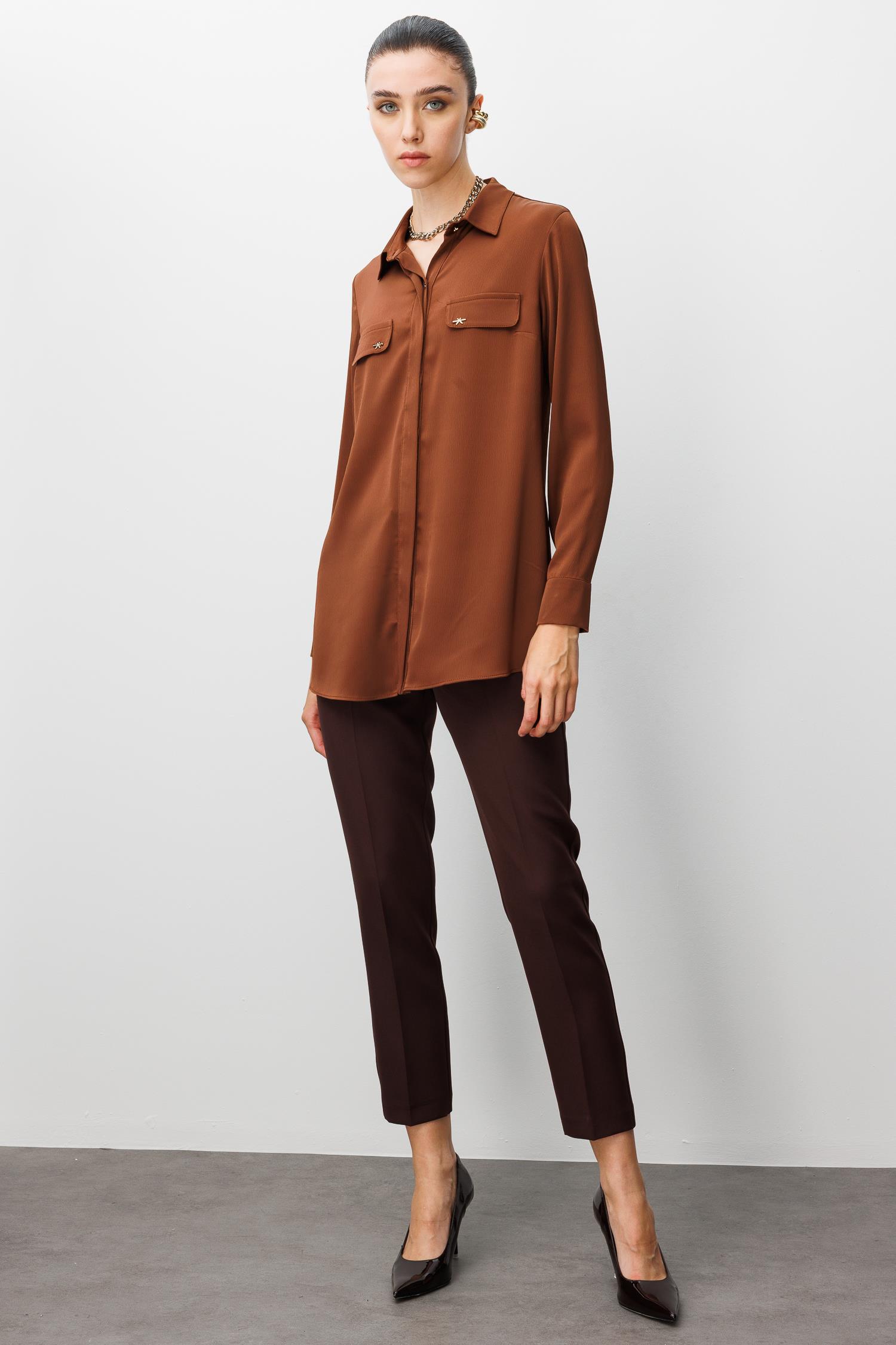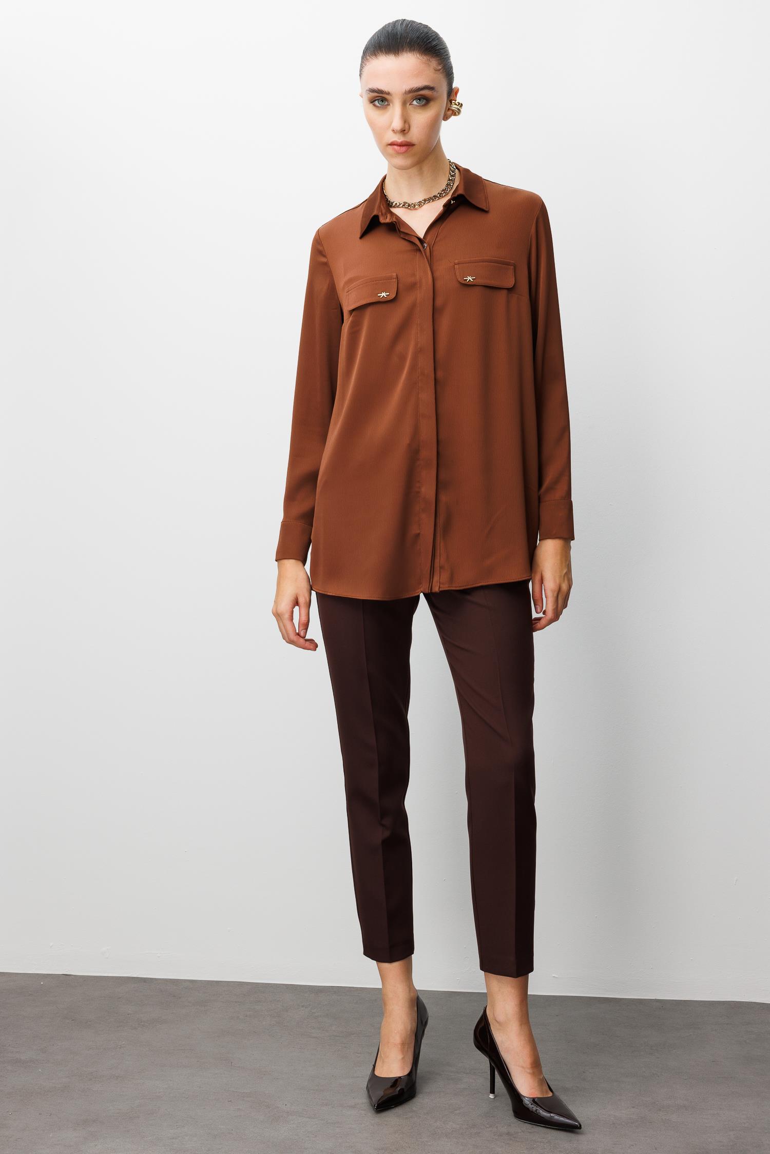 Modailgi Cep Kapaklı Kolları Apoletli Saten Gömlek - Kahve