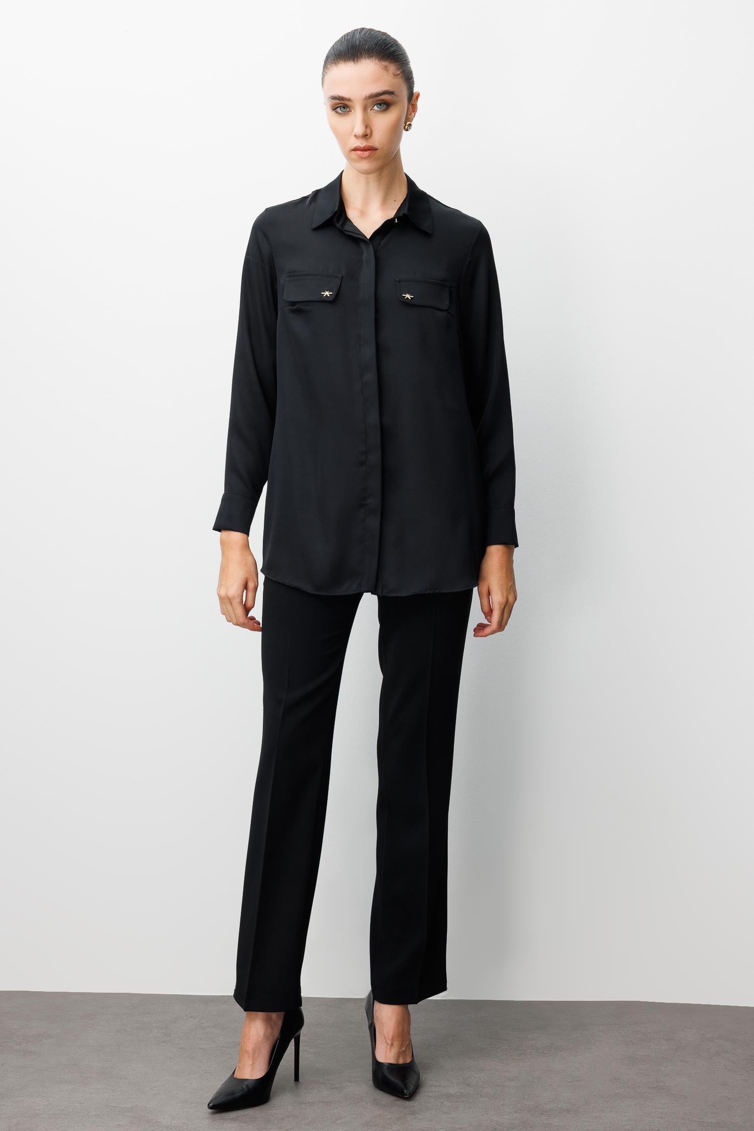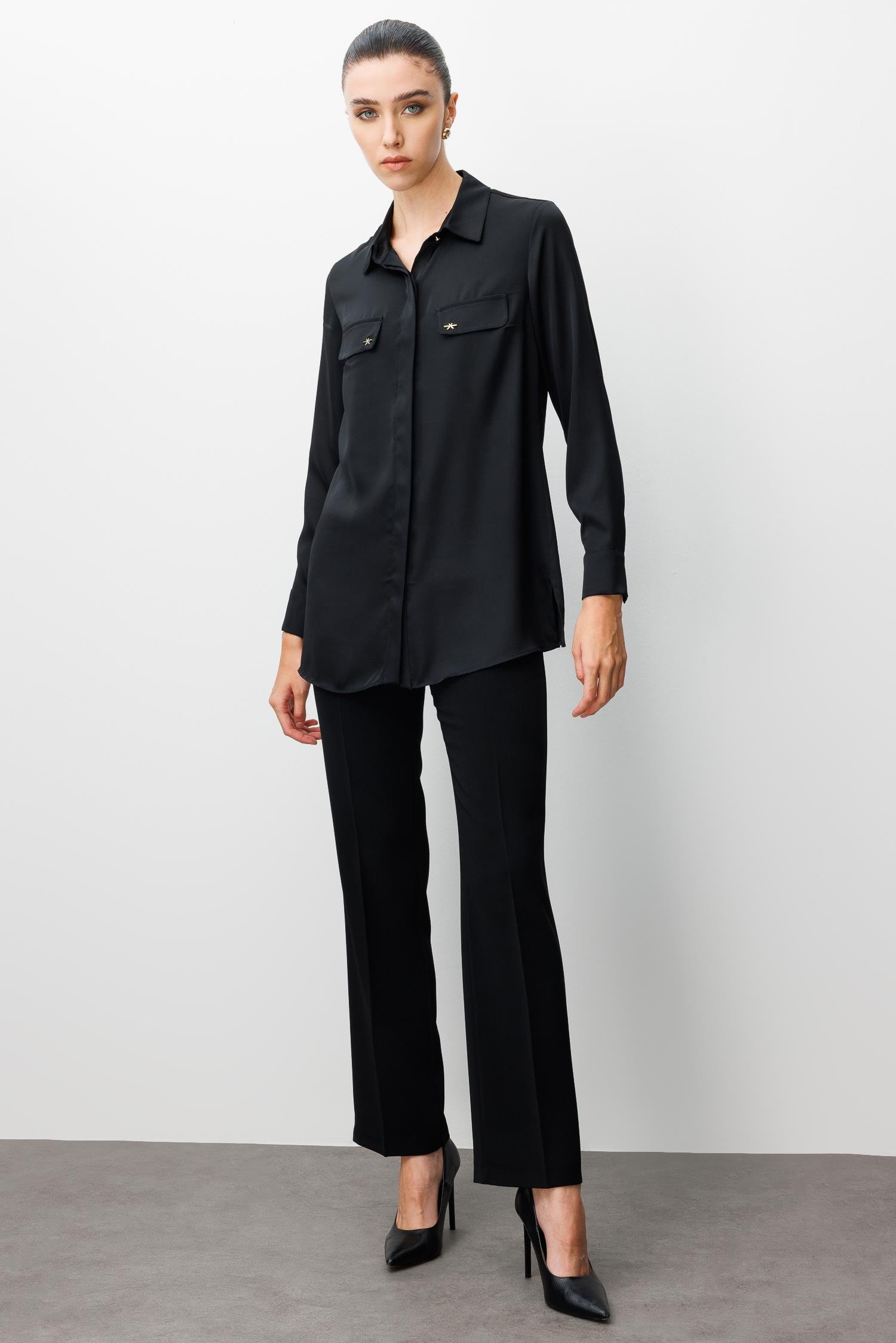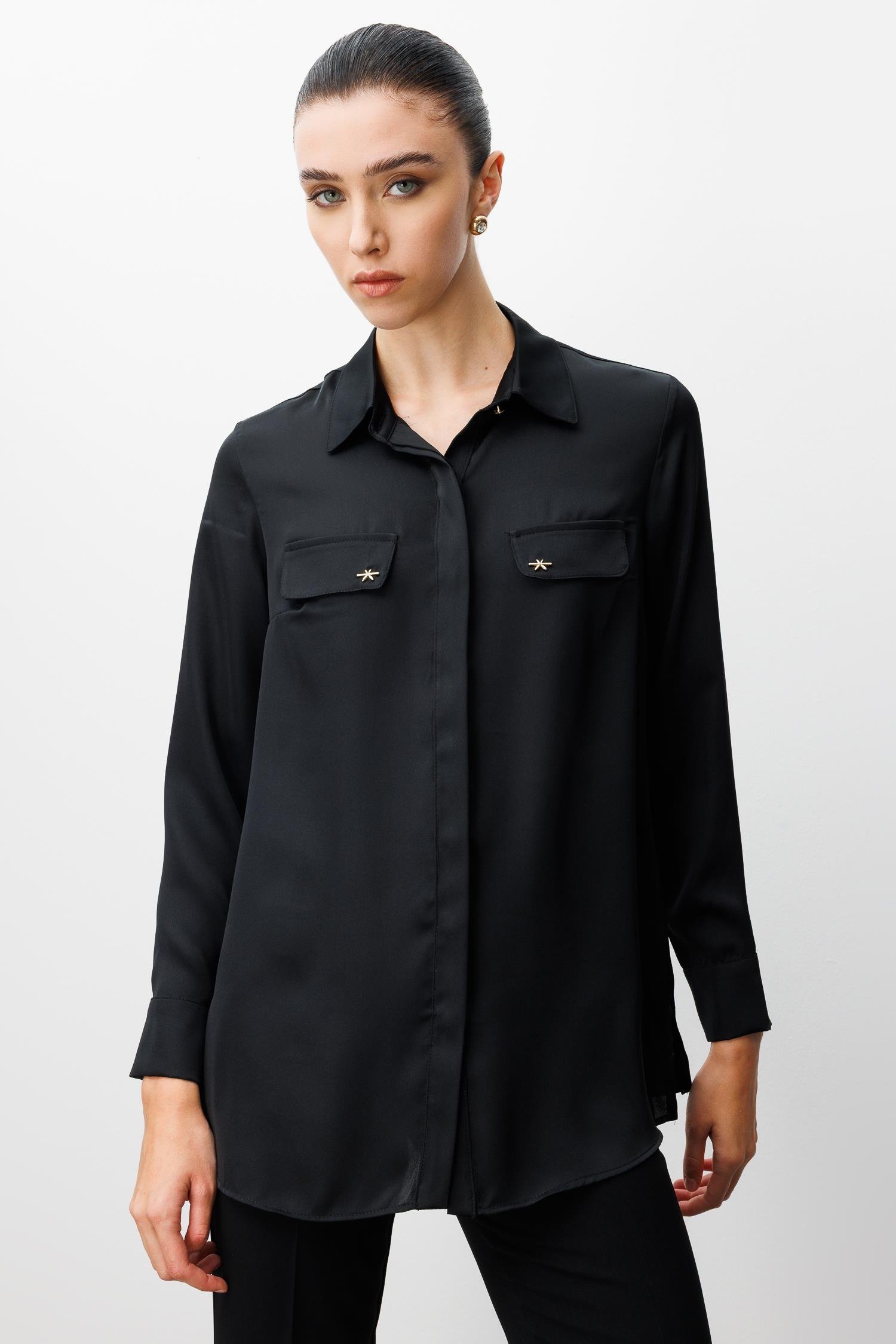Modailgi Cep Kapaklı Kolları Apoletli Saten Gömlek - Siyah