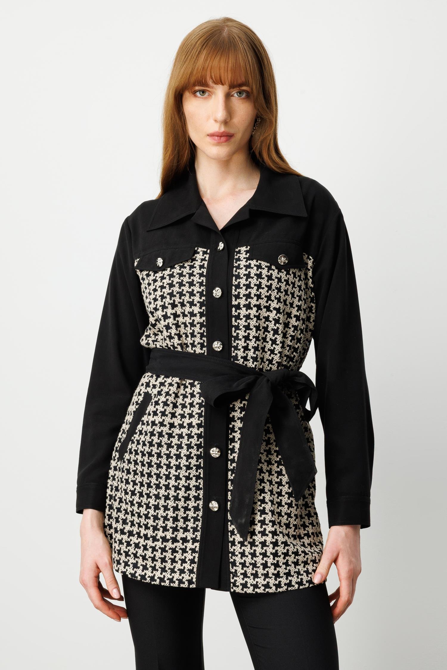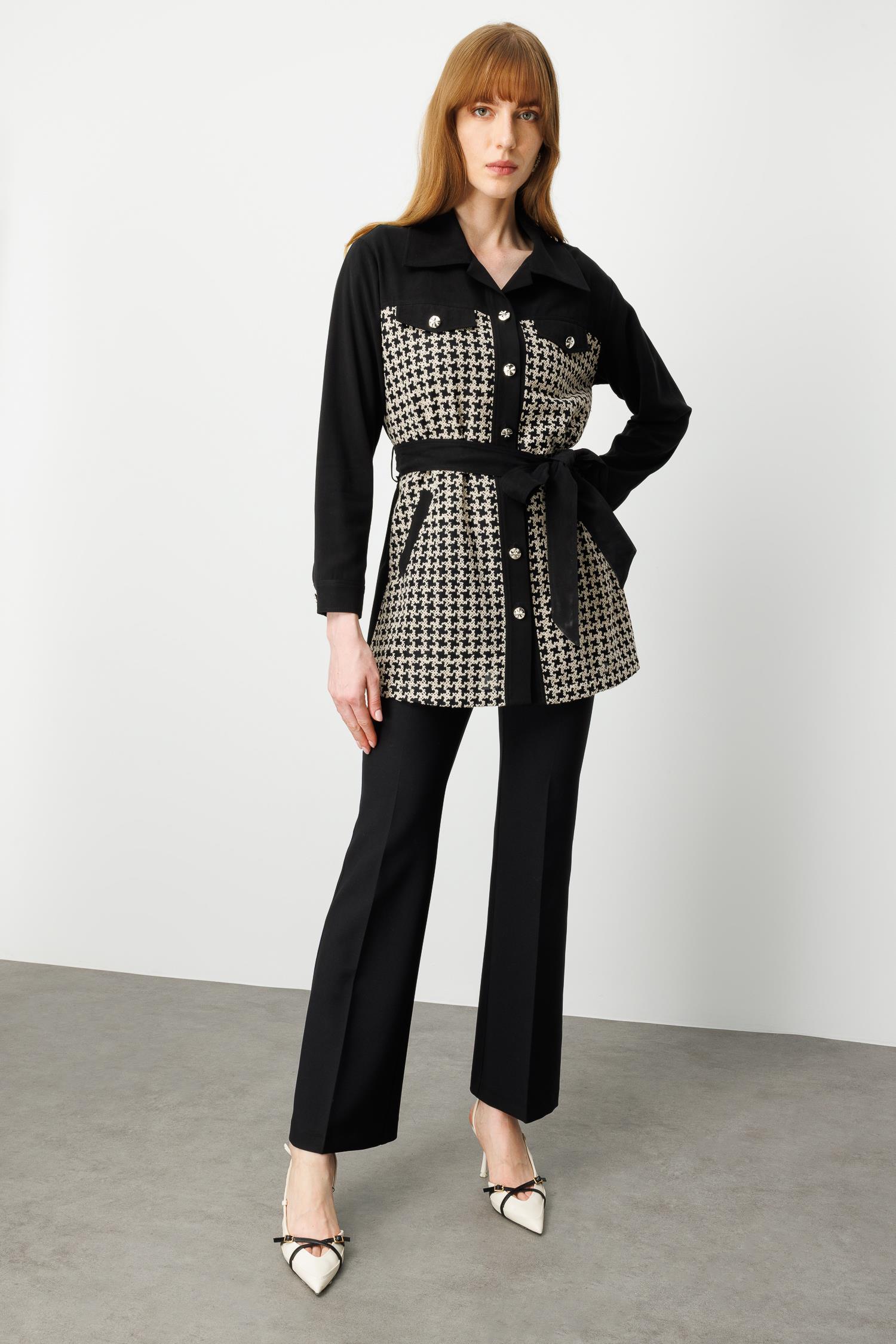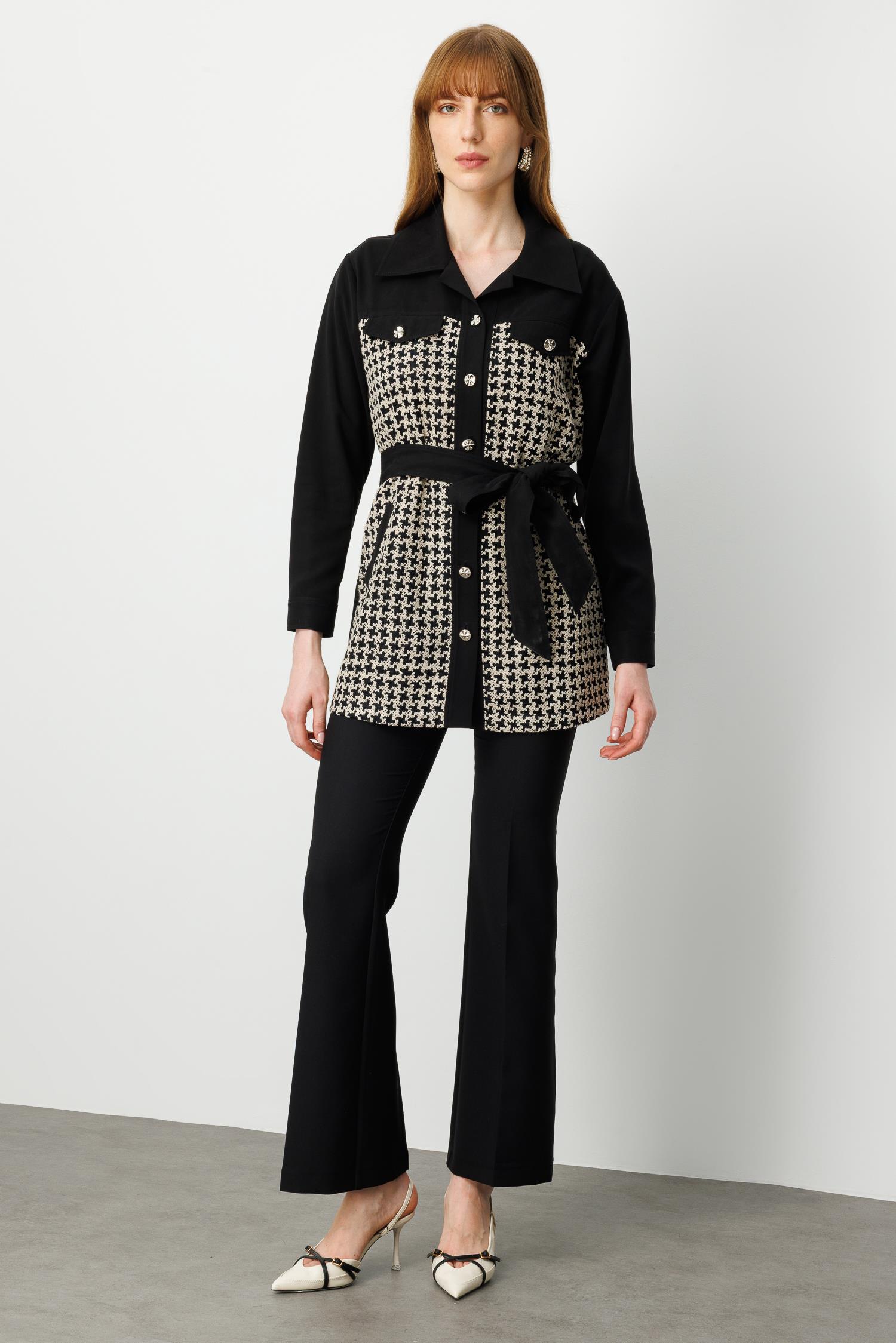 • Model: Uzun form, kazayağı desenli, belden kuşaklı tunik
