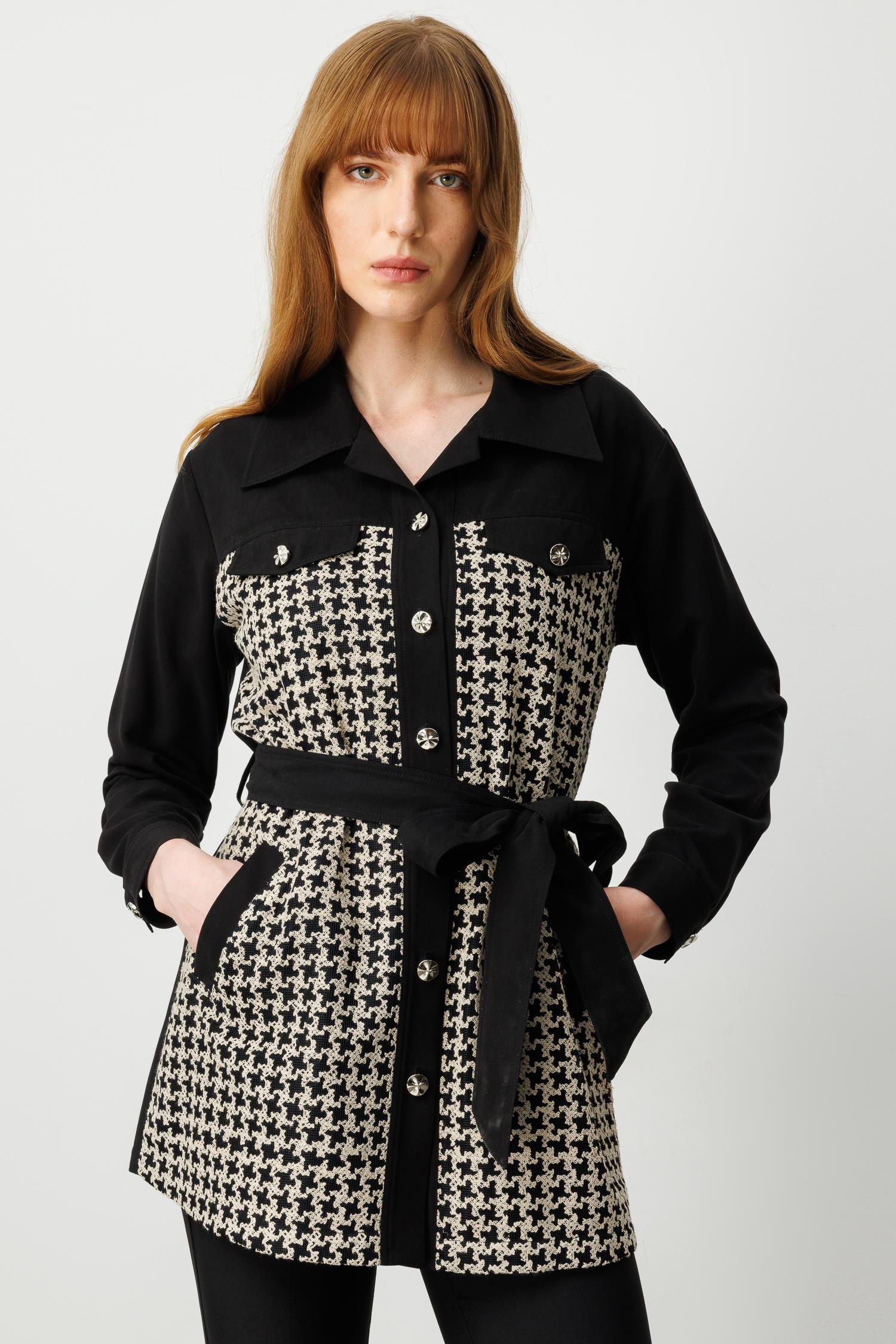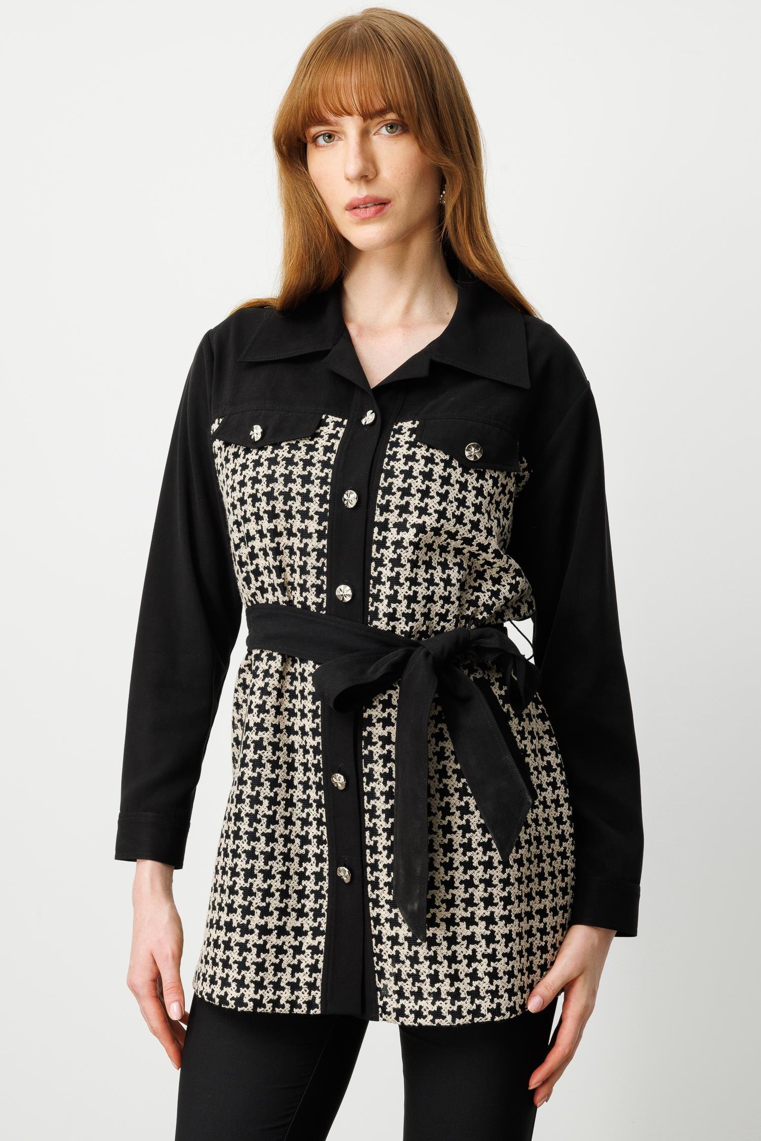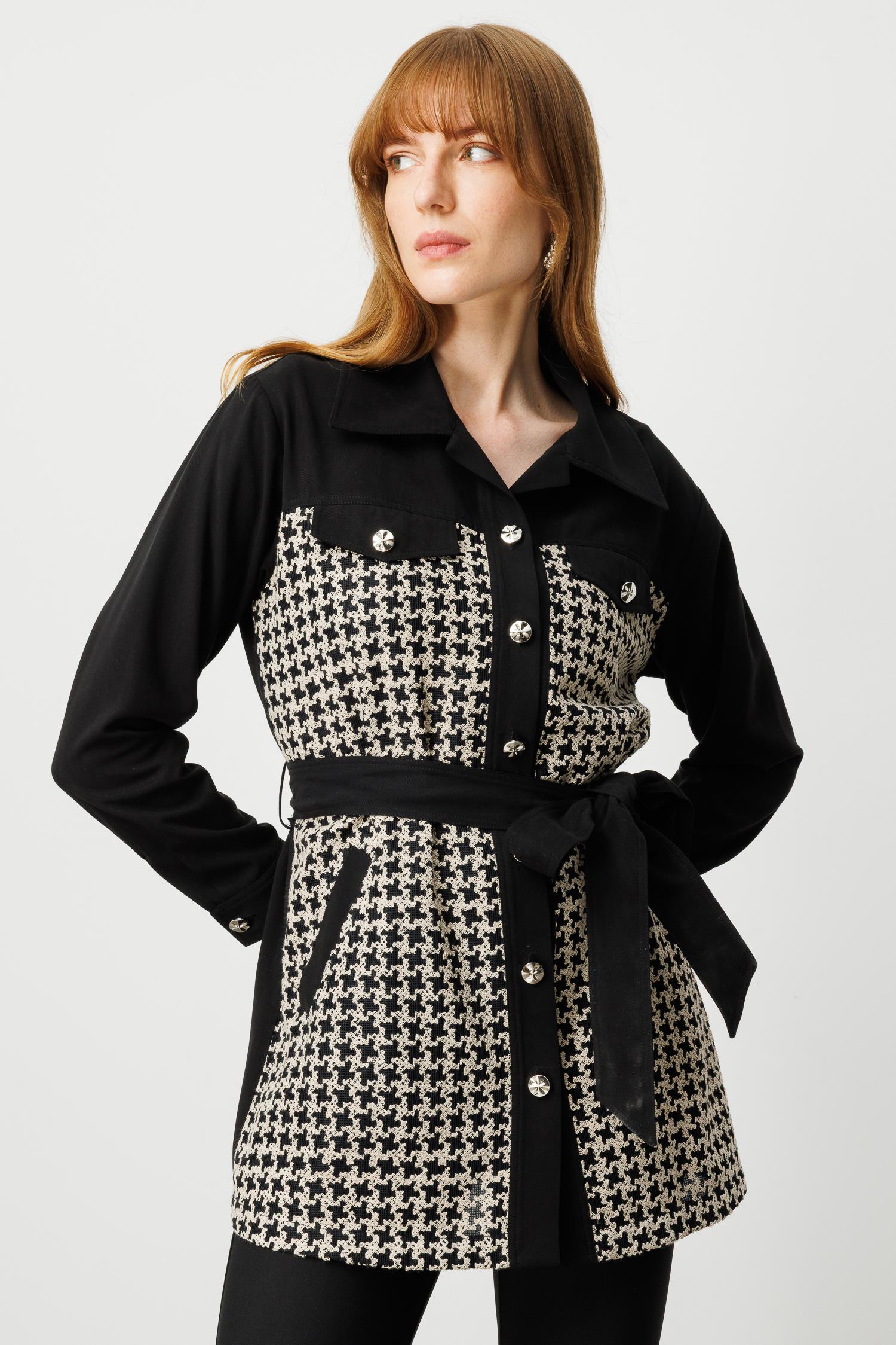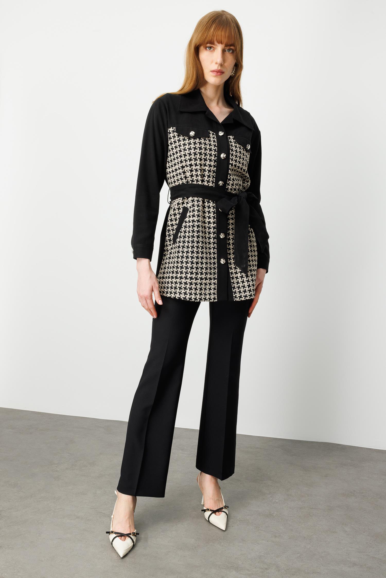 • Model: Uzun form, kazayağı desenli, belden kuşaklı tunik