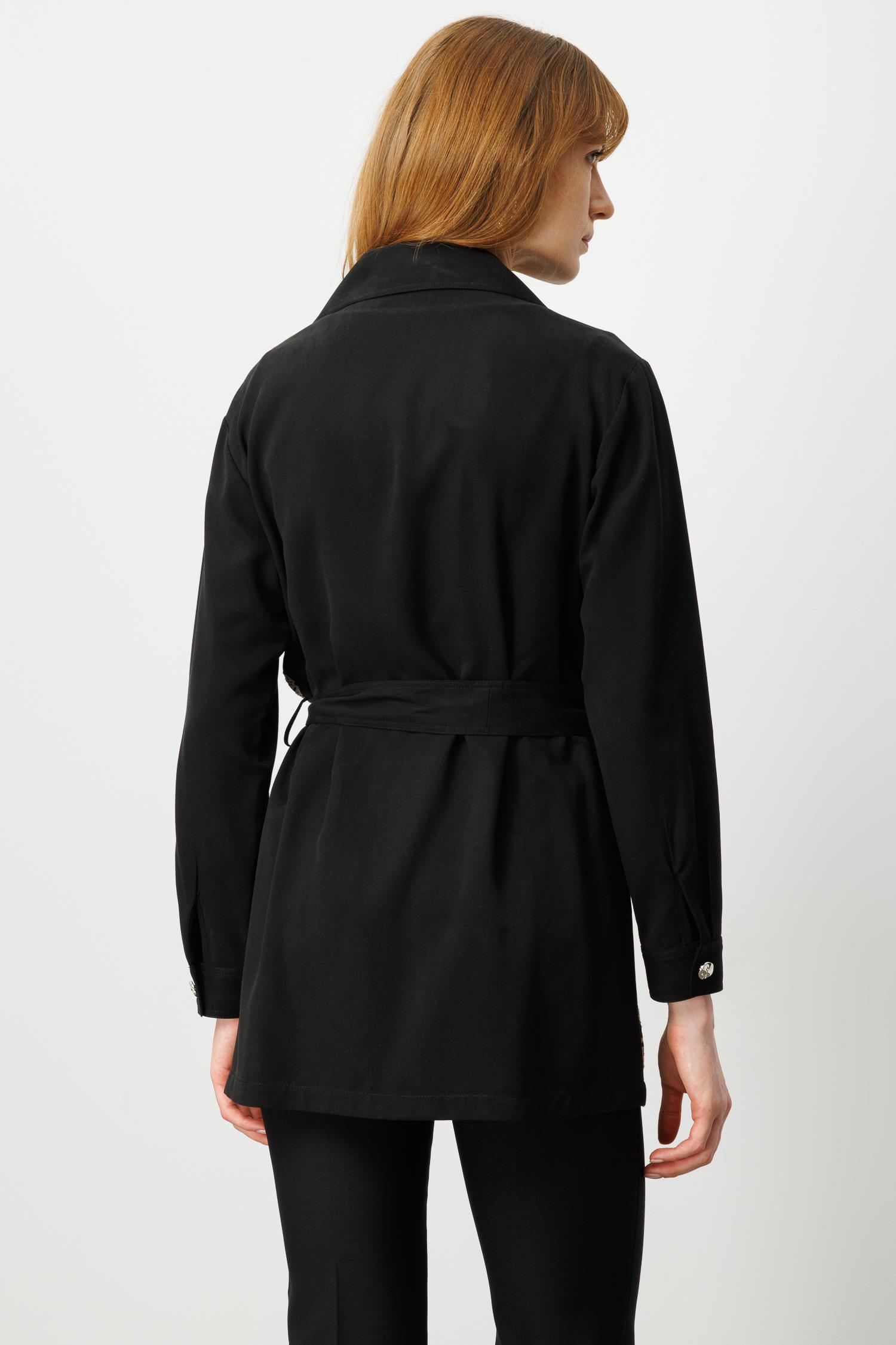 Göğüs kısmında dekoratif cep kapakları ve metal düğme detayları