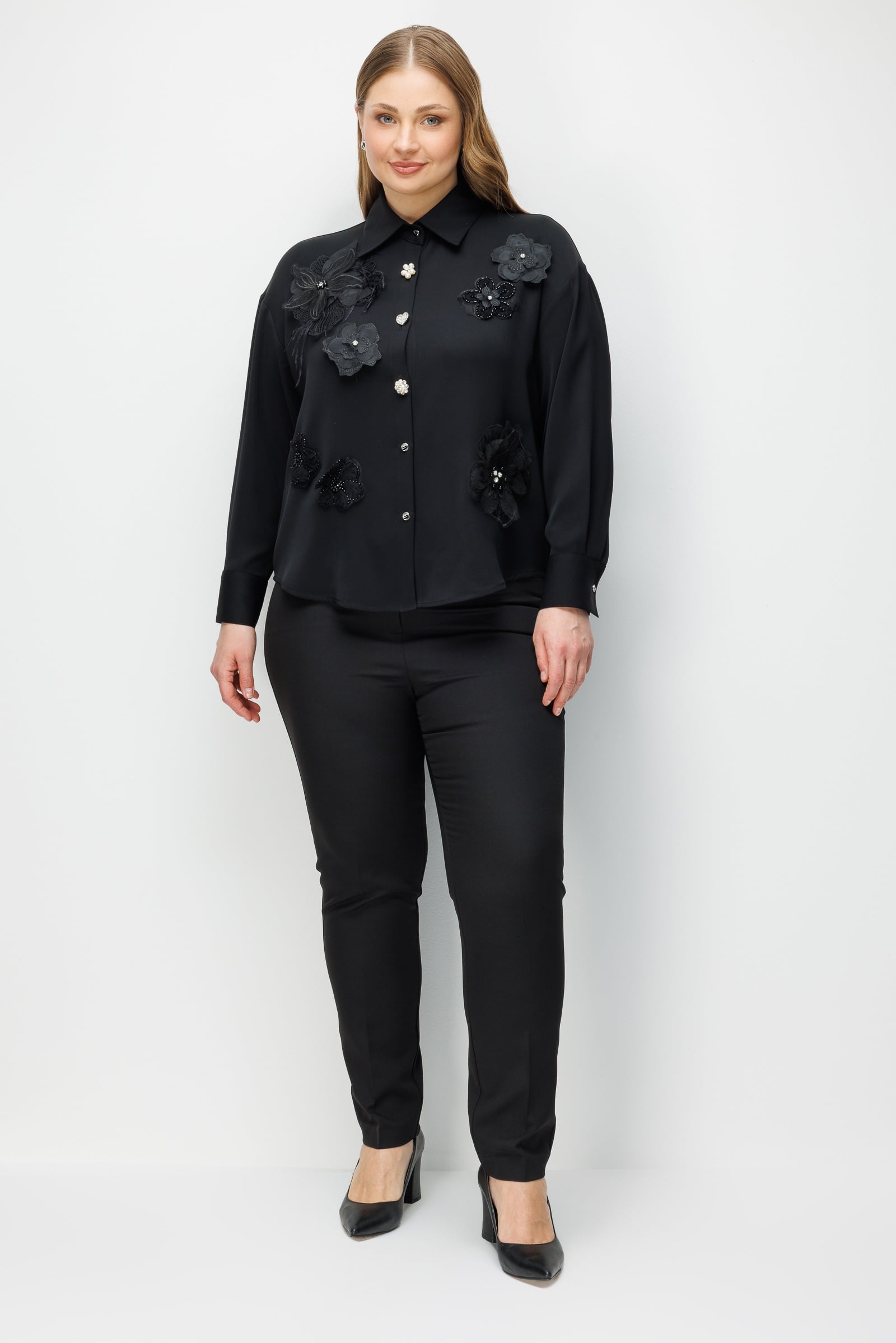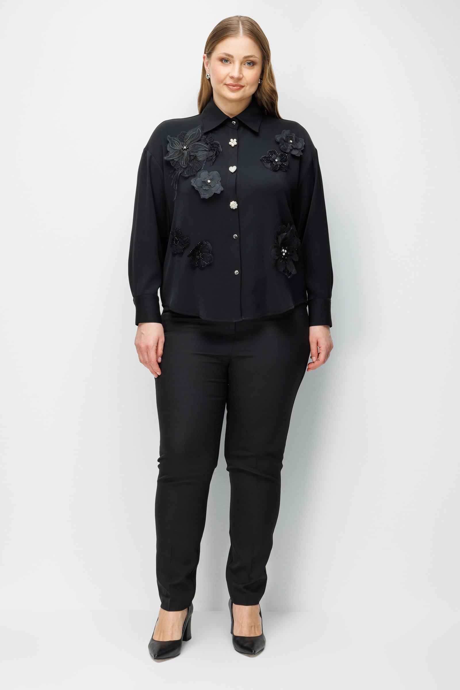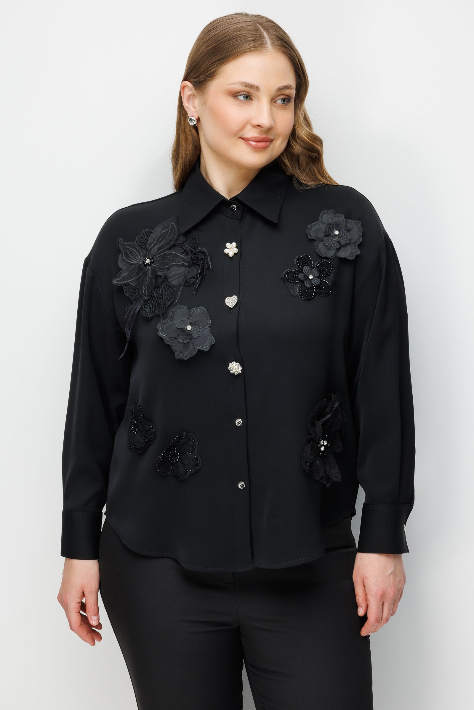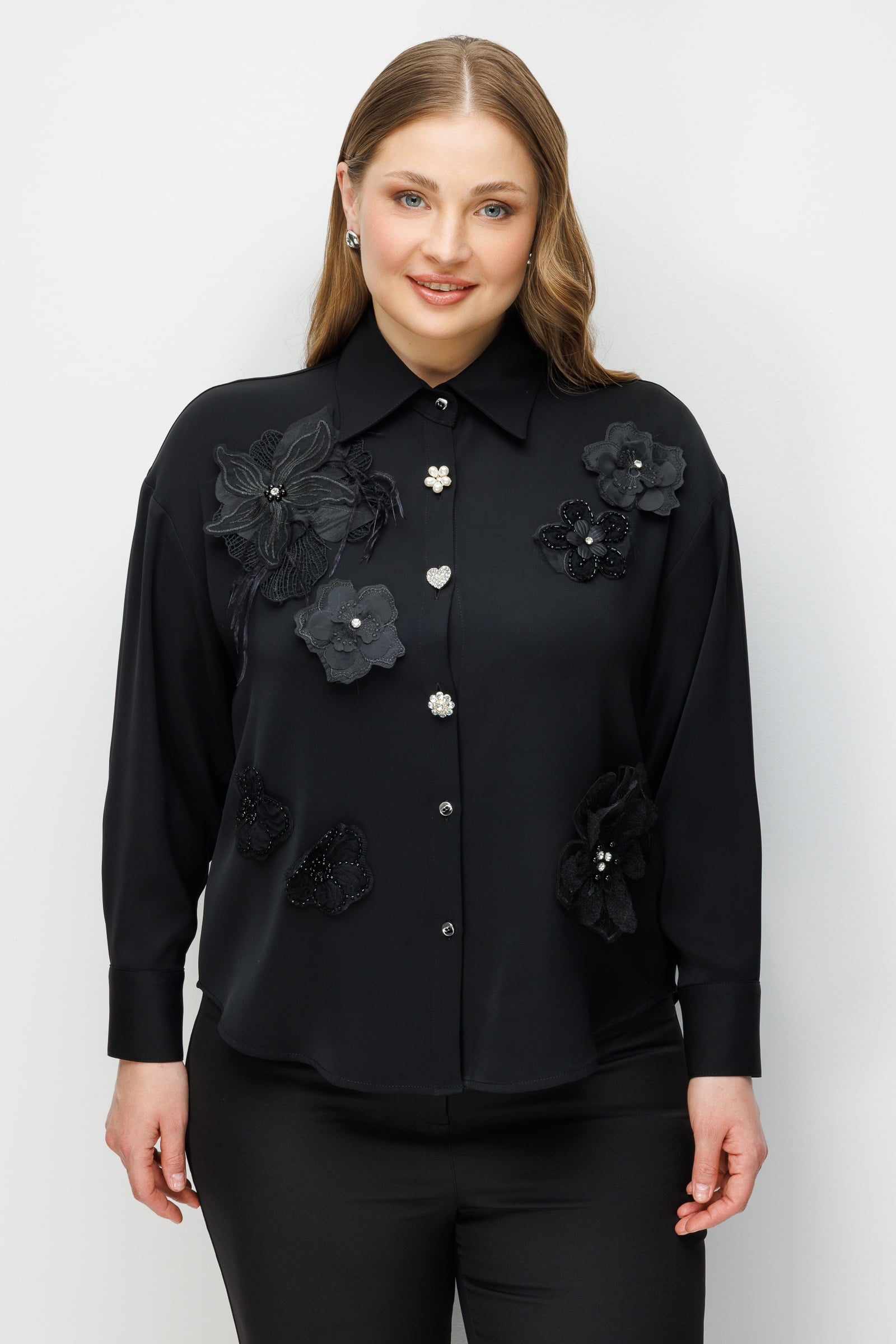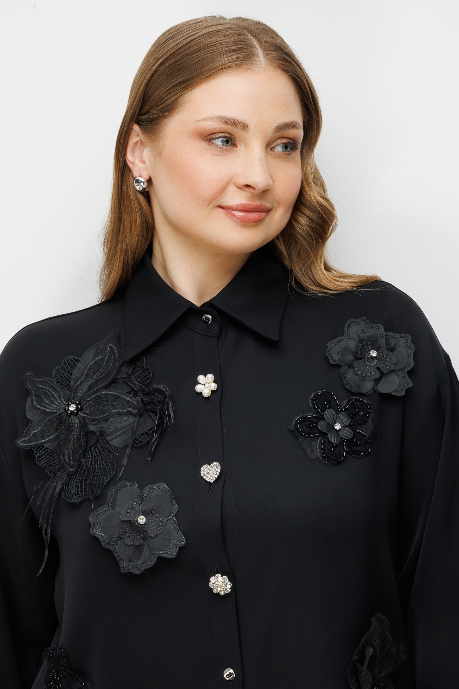 Bu gömlek, kentsel gecenin gizemini baharın üç boyutlu romantizmiyle harmanlamak amacıyla tasarlandı. Siyahın mutlak otoritesi, el işçiliği zarafetini yansıtan çiçek aplikeleriyle yumuşatılarak ortaya hem güçlü hem de naif bir silüet çıkarıyor. Tasarımın odağındaki asimetrik mücevher düğmeler, karanlığın içindeki parıltılı yıldızları temsil ederken; oversize kesim modern kadının özgür ruhuna atıfta bulunuyor.