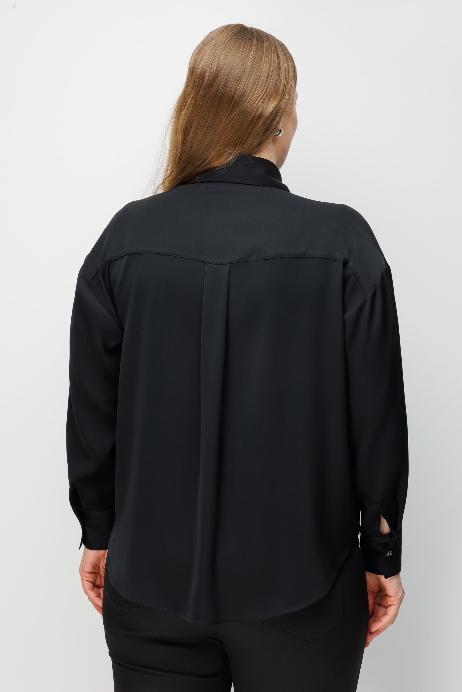 Klasik gömlek yakası ve temiz bitişli geniş manşetler.