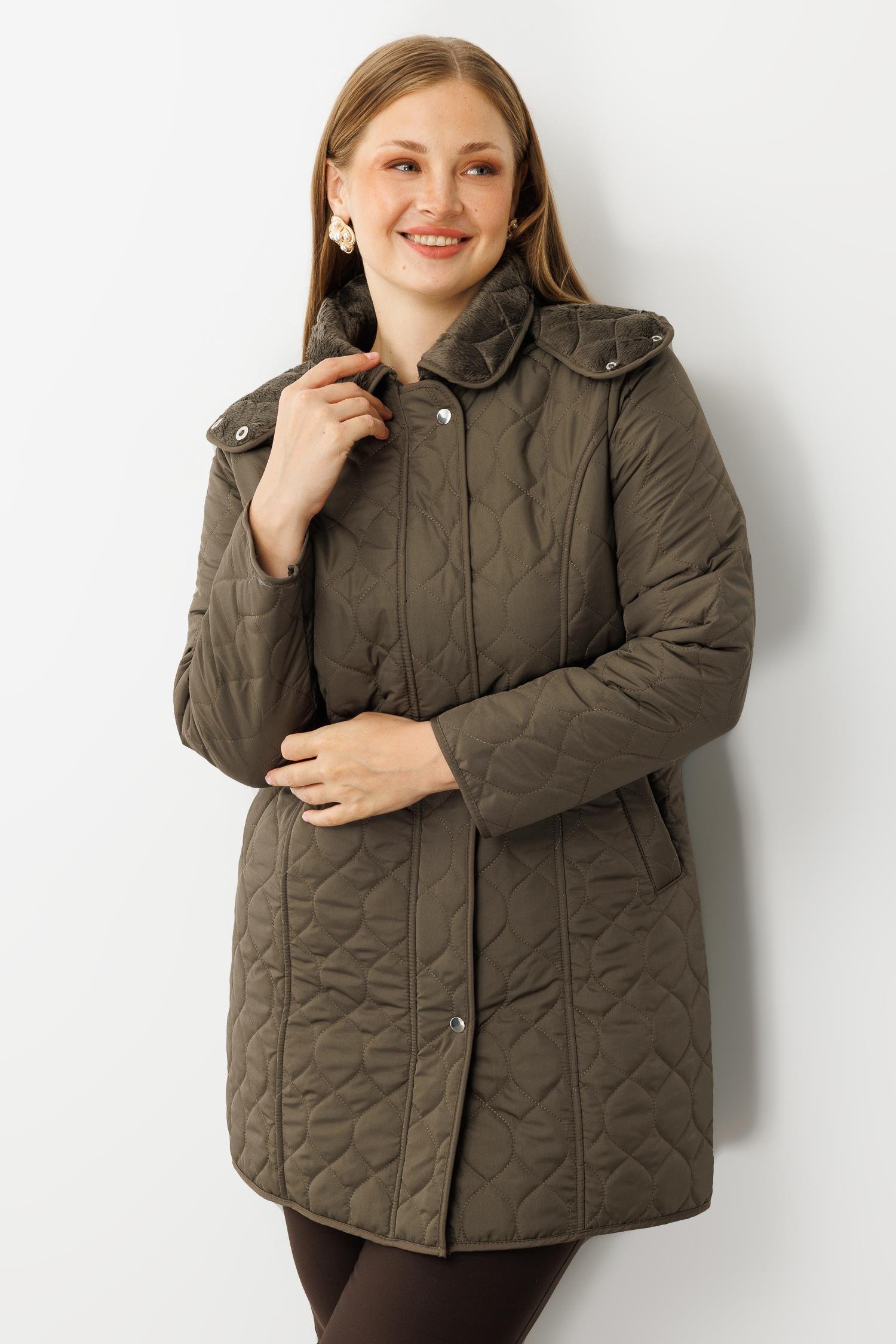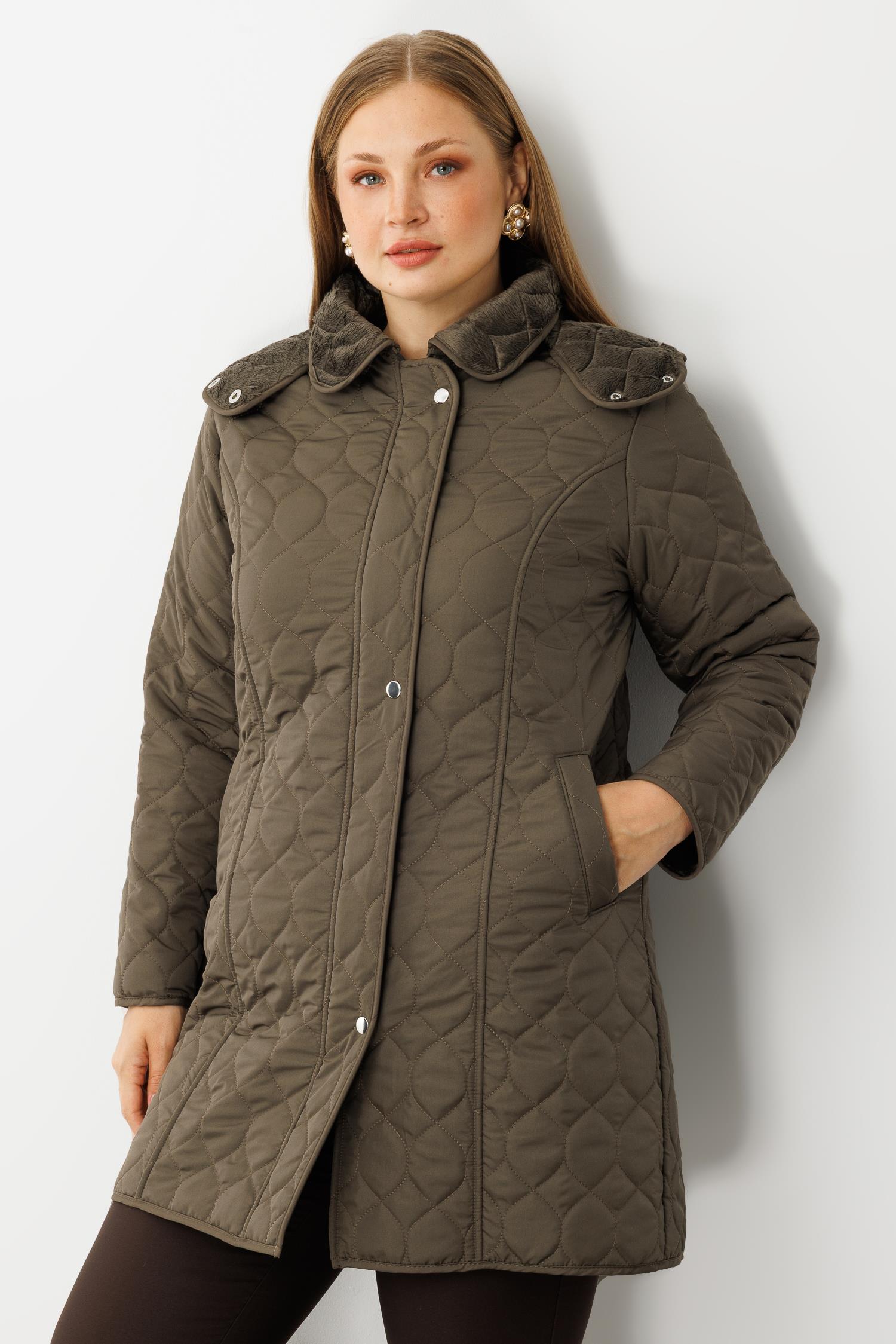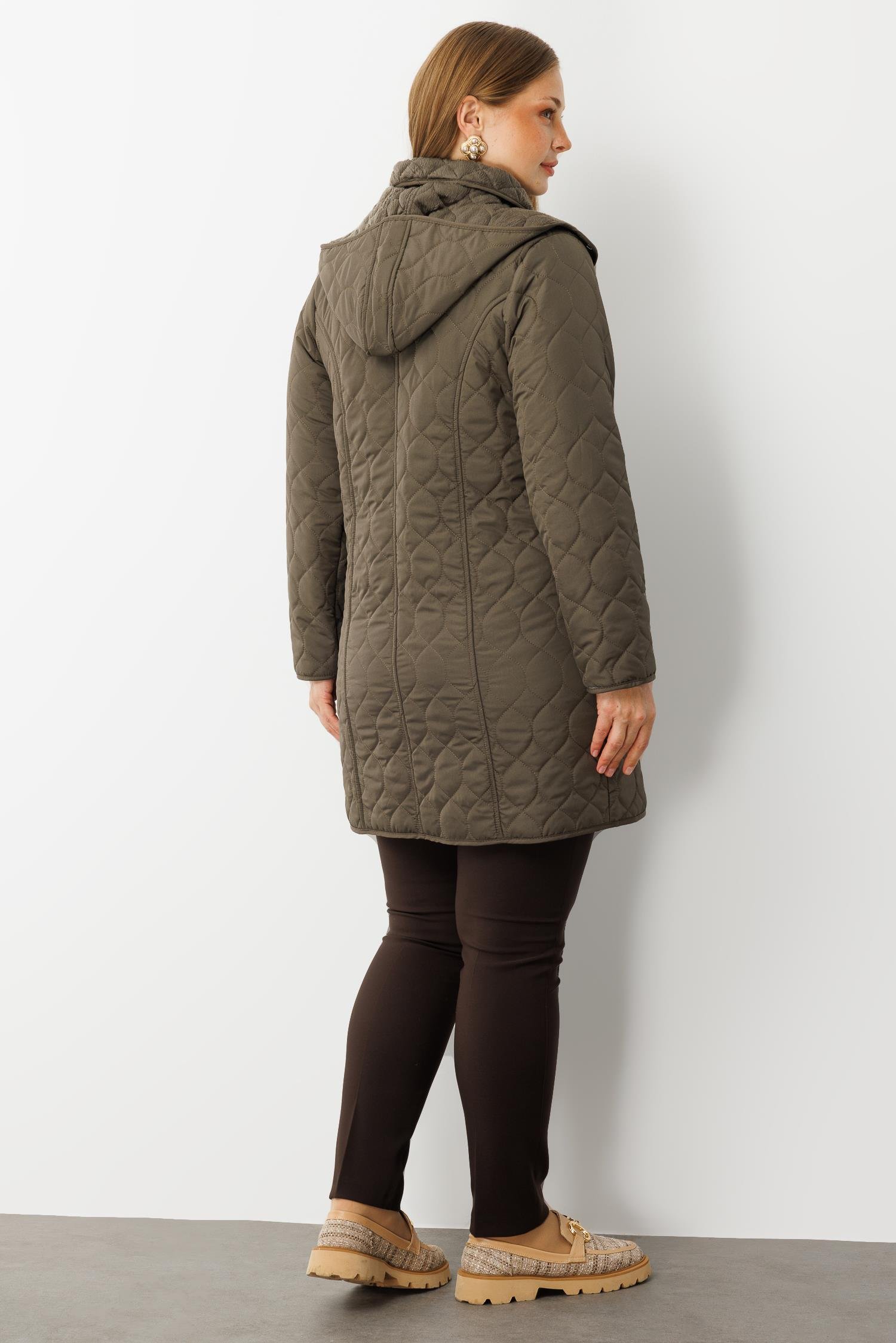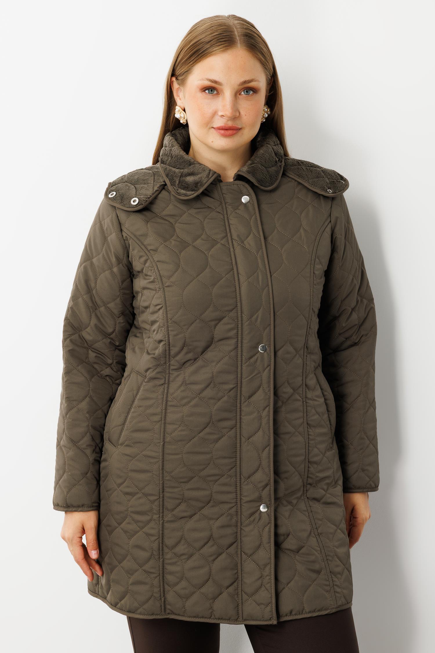 Modailgi Çıtçıtlı Fermuarlı Soğan Desenli Kapüşonlu Kapitone Kaban Haki (GLD260KBN71016-104)