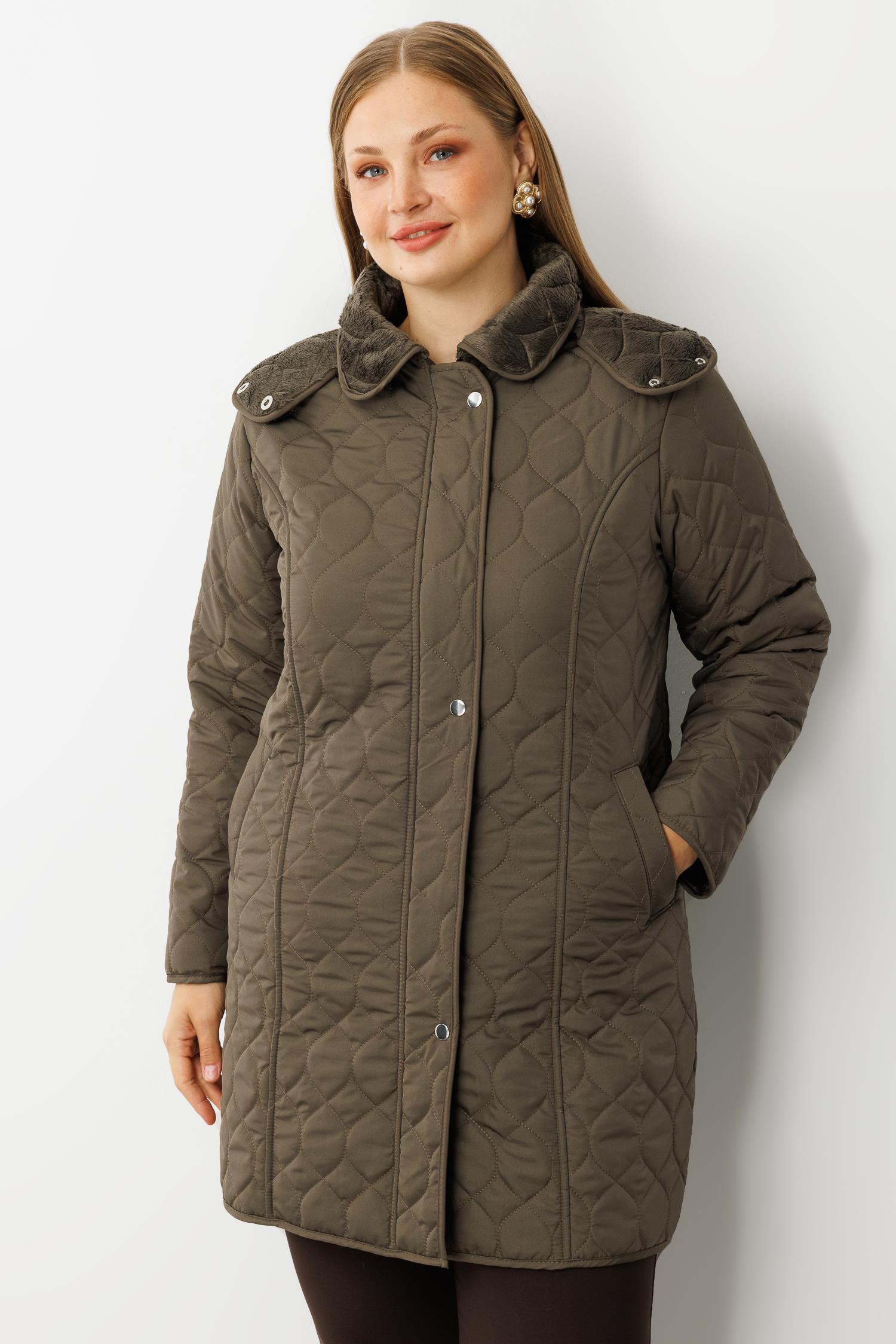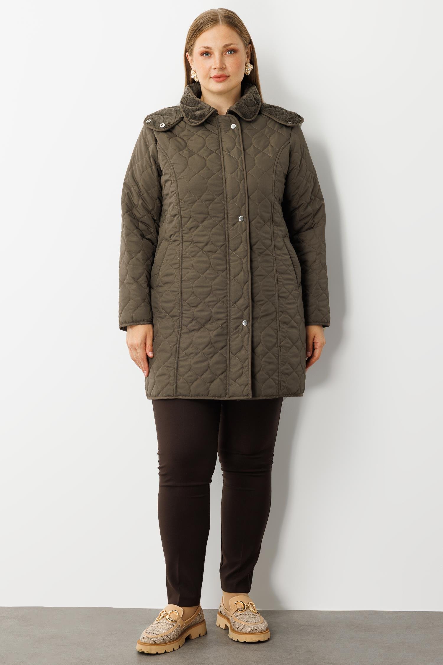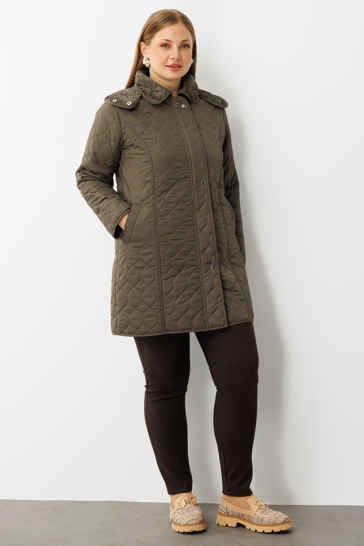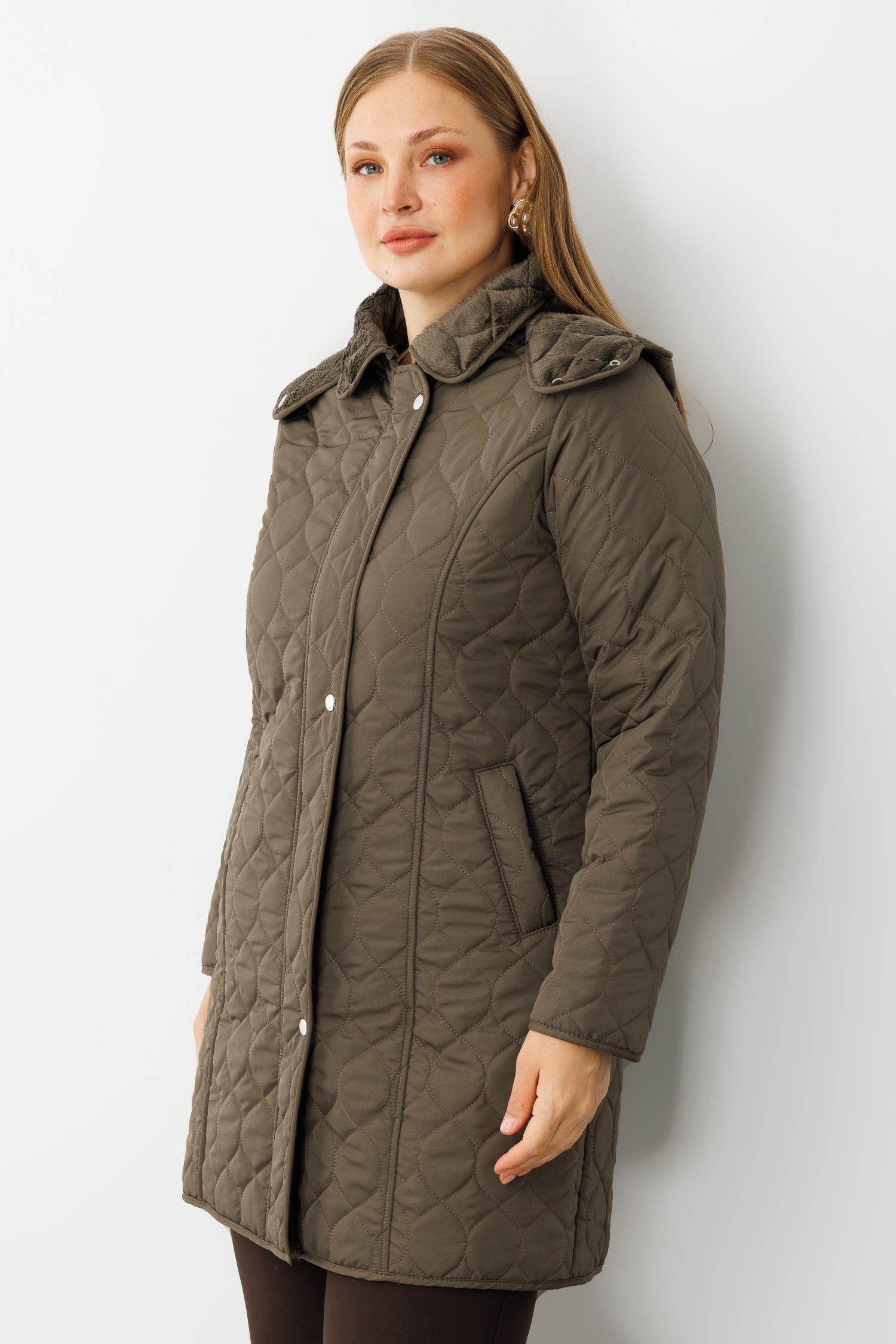 Modailgi Çıtçıtlı Fermuarlı Soğan Desenli Kapüşonlu Kapitone Kaban Haki (GLD260KBN71016-104)