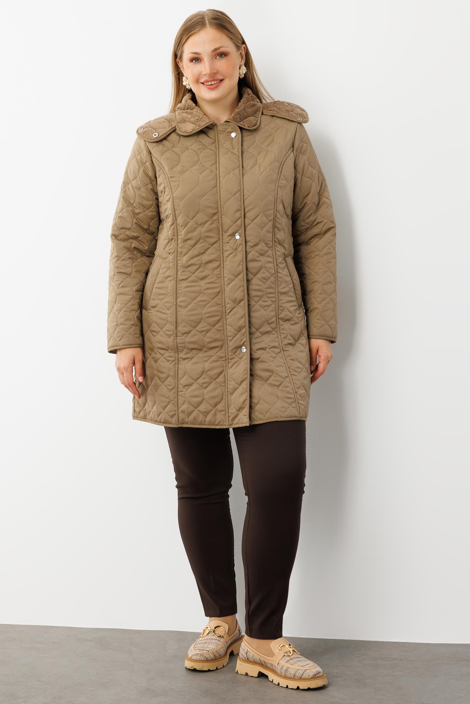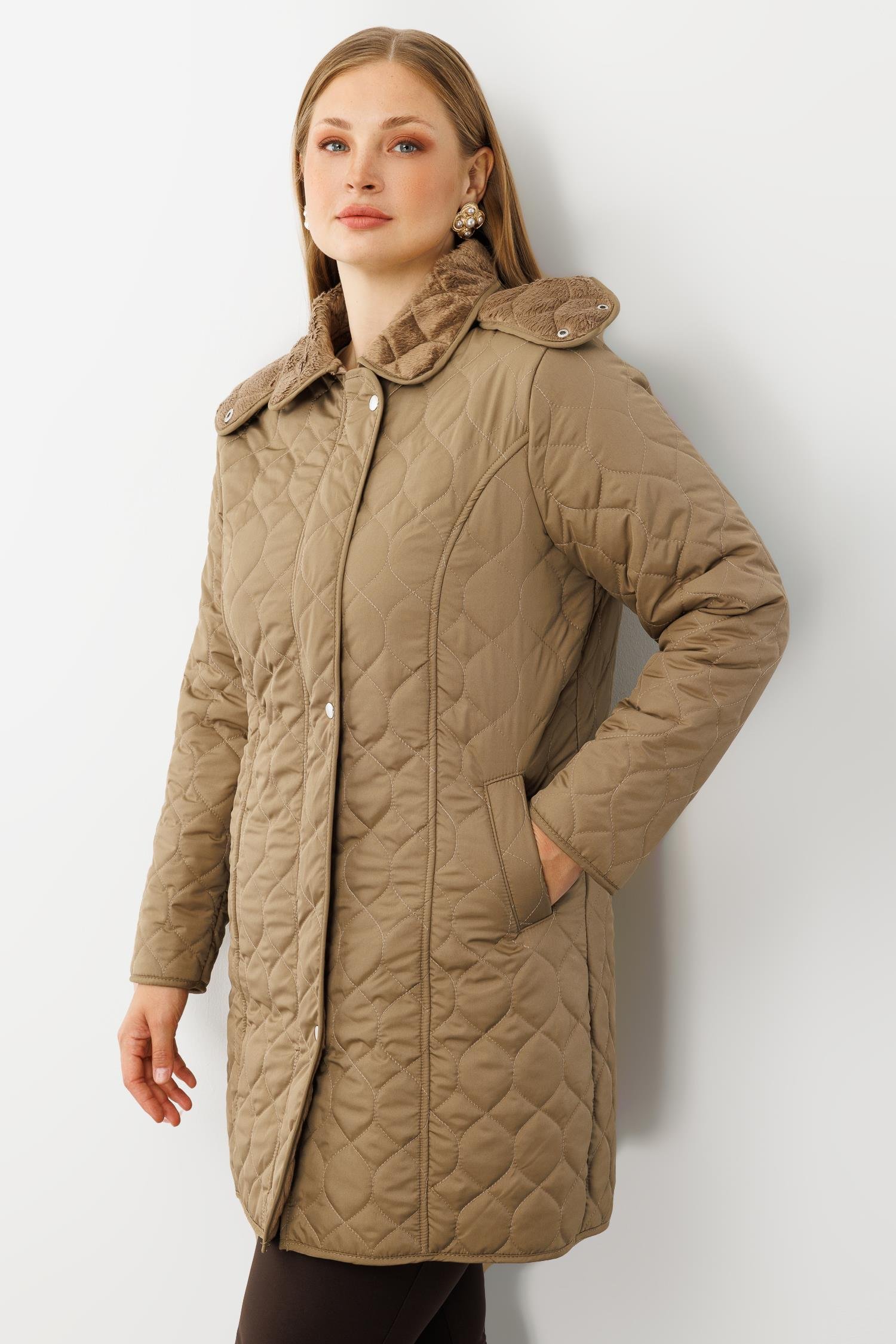 Modailgi Çıtçıtlı Fermuarlı Soğan Desenli Kapüşonlu Kapitone Kaban Vizon (GLD260KBN71016-331)