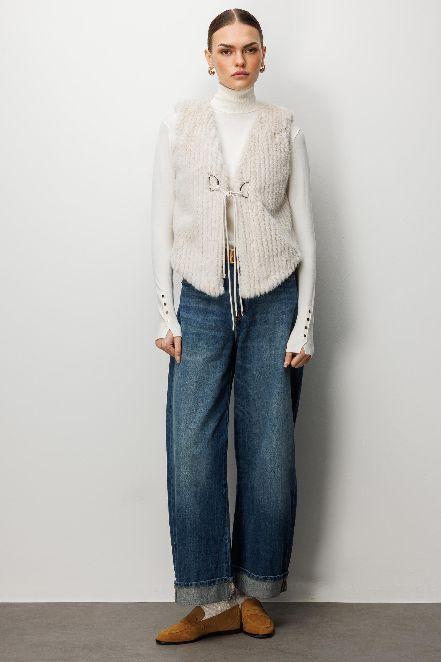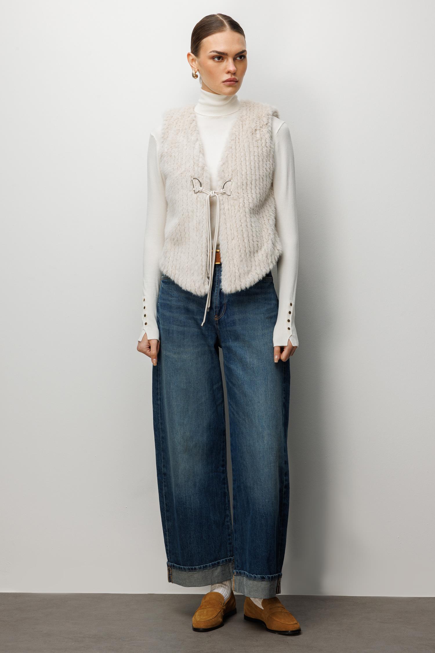 Bu yelek, kış güneşinin ferahlatıcı ışığından ve modern mimarinin çizgisel ritminden ilham alınarak tasarlandı. Kemik renginin sunduğu dinginlik, dikey çizgili peluş dokusunun yumuşaklığıyla birleşerek geleneksel kürk anlayışına grafik ve modern bir yorum katıyor. Ön kısımdaki metalik detaylar, bu romantik parçaya modern bir "urban" dokunuş ekleyerek onu kentsel yaşamın dinamik yapısıyla buluşturuyor.
