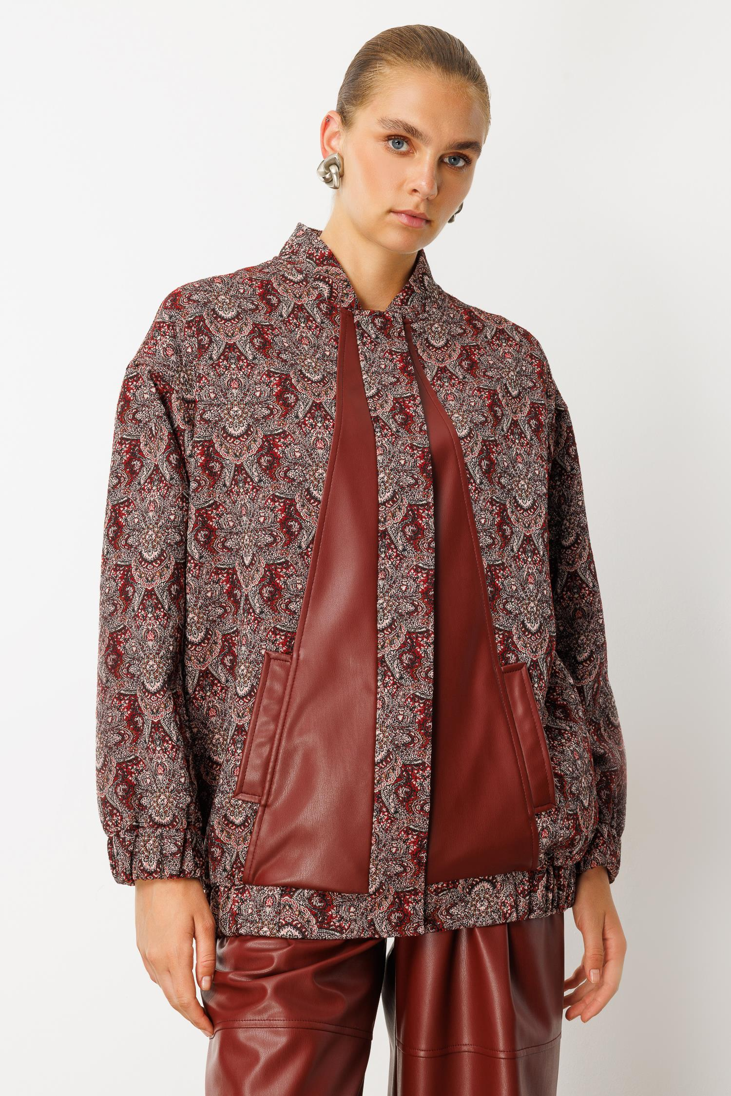 Modailgi Deri Garnili Detaylı Oversize Astarlı Jakar Kumaştan Bomber Ceket - Bordo