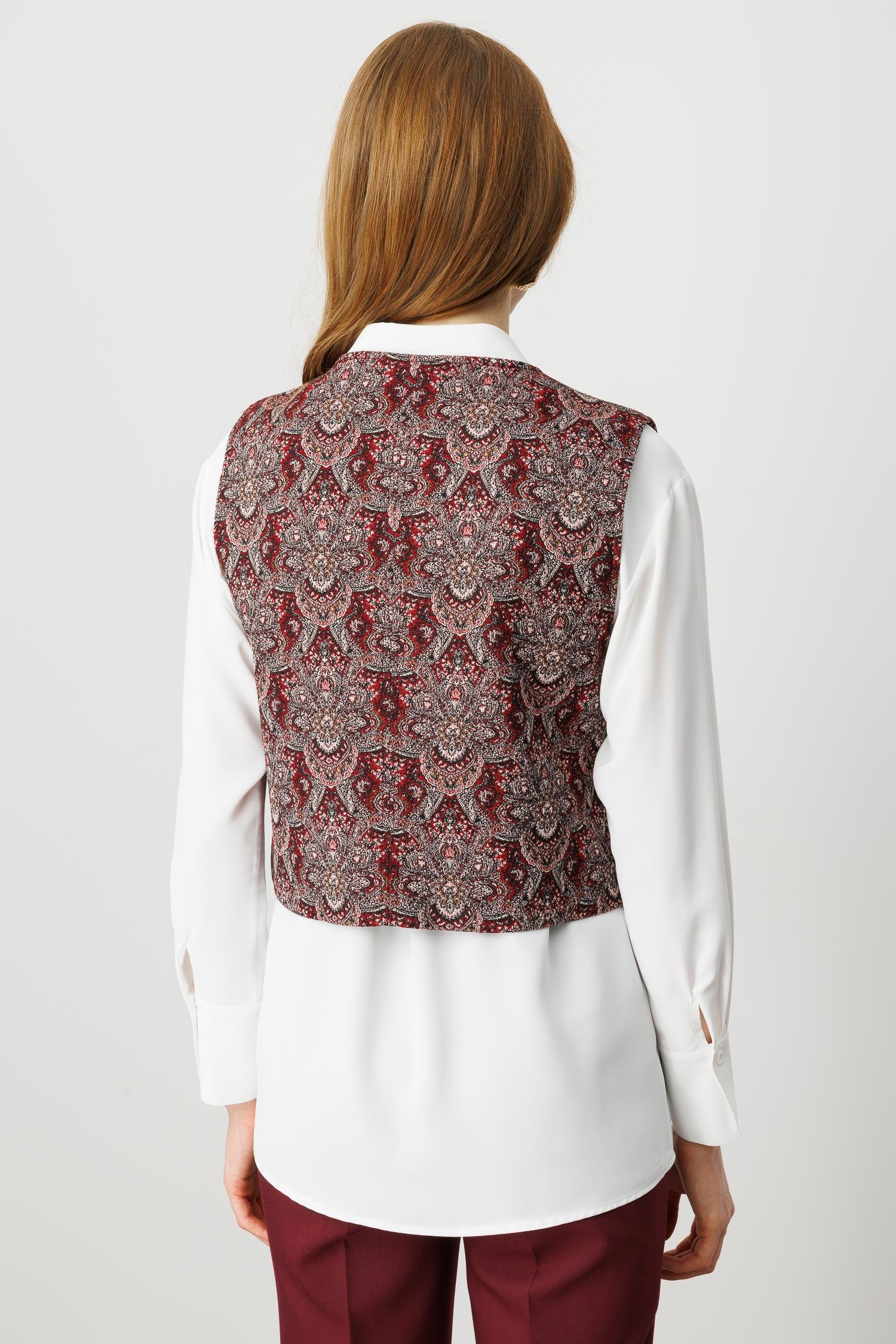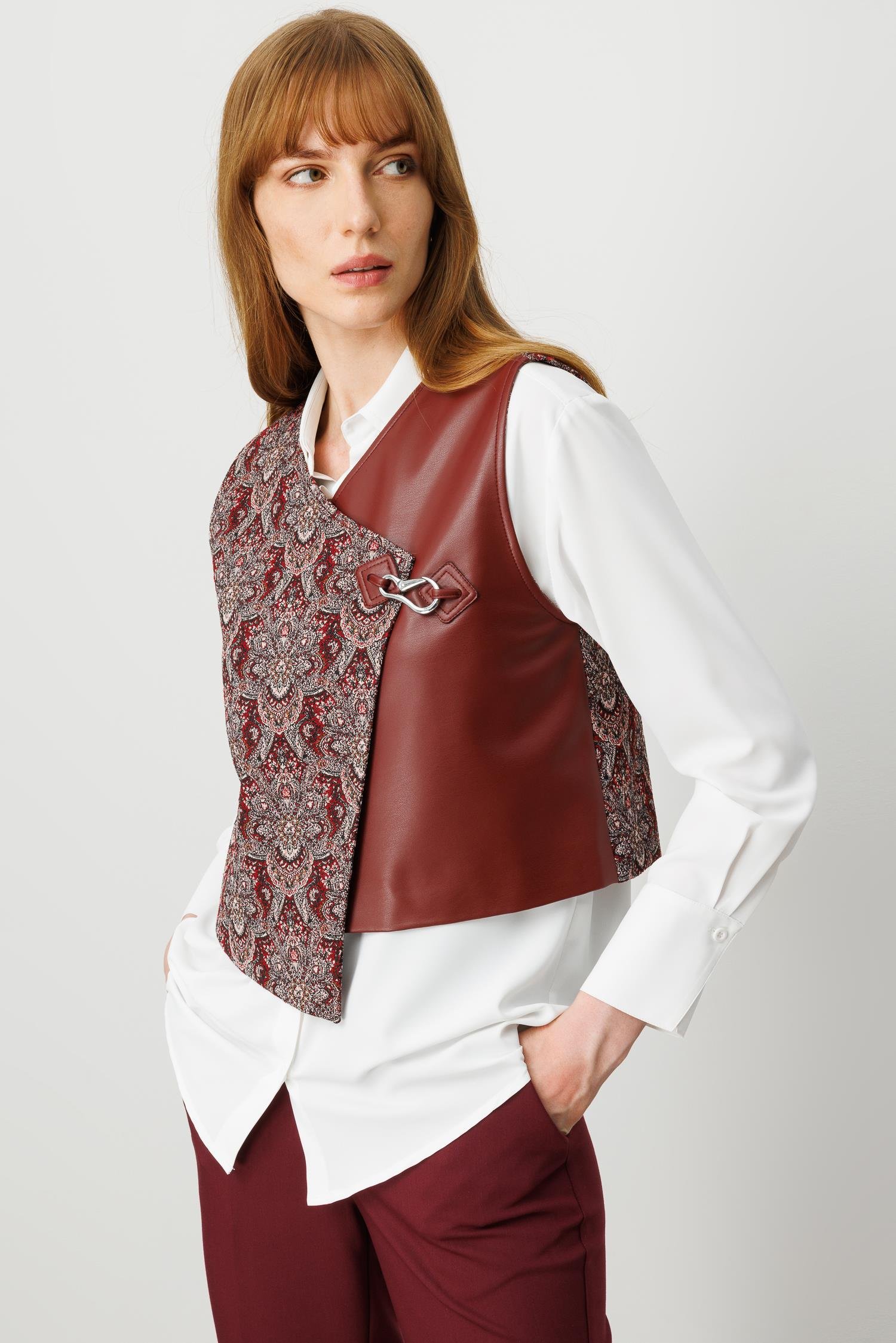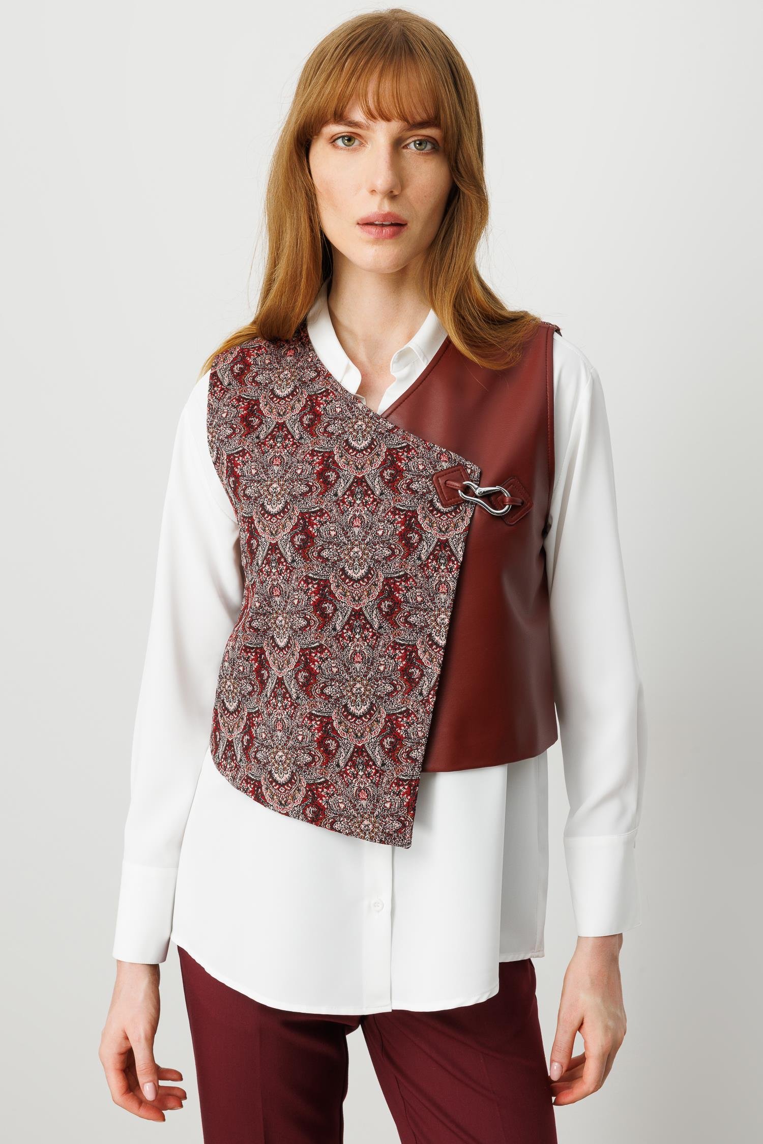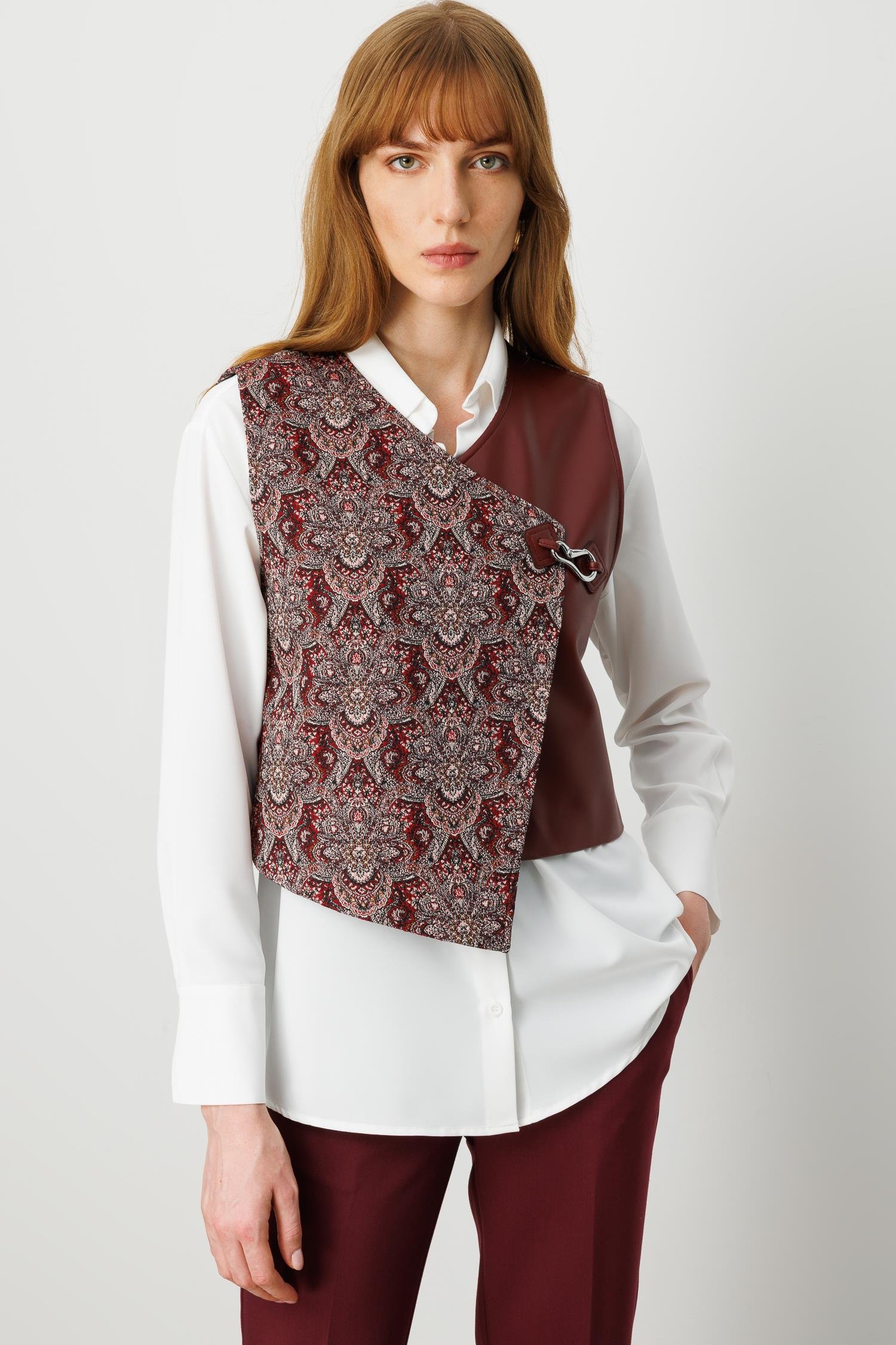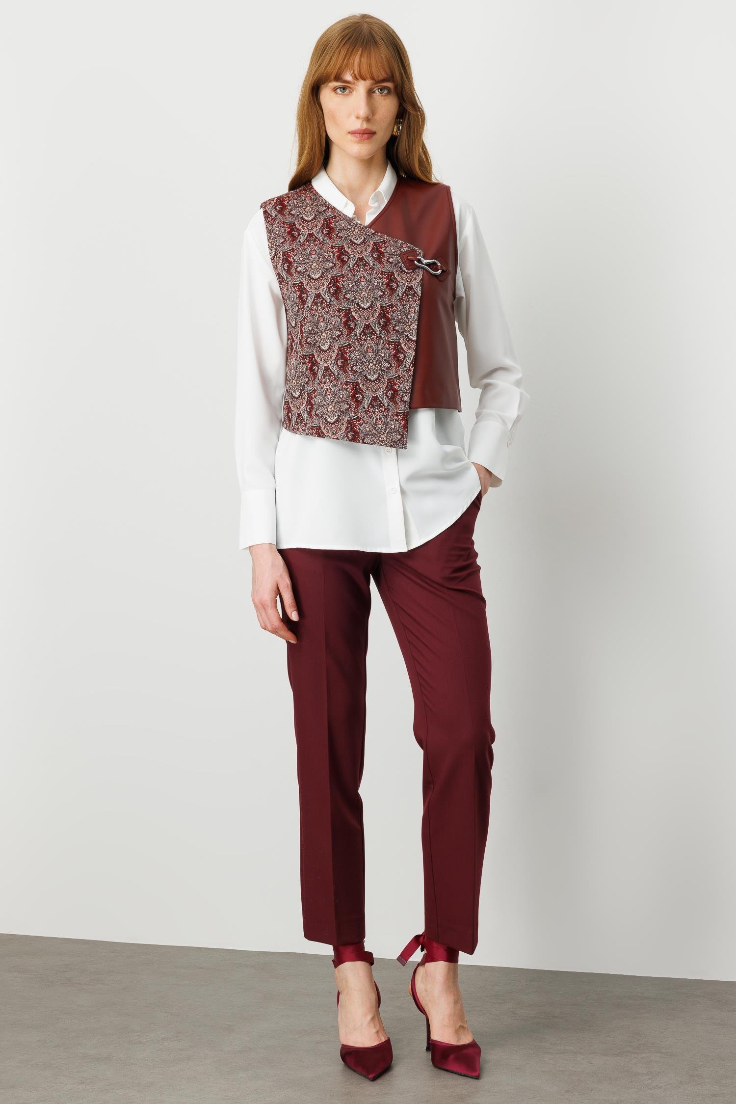 Modailgi Deri Garnili Kumaşlı Klapa Kapamalı Asimetrik Jakar Yelek - Bordo