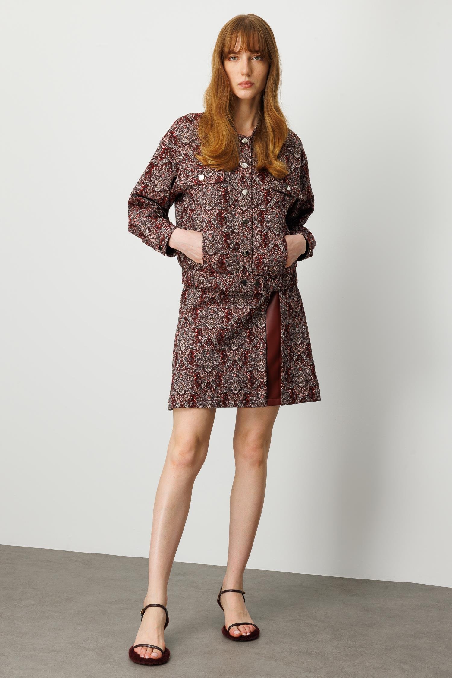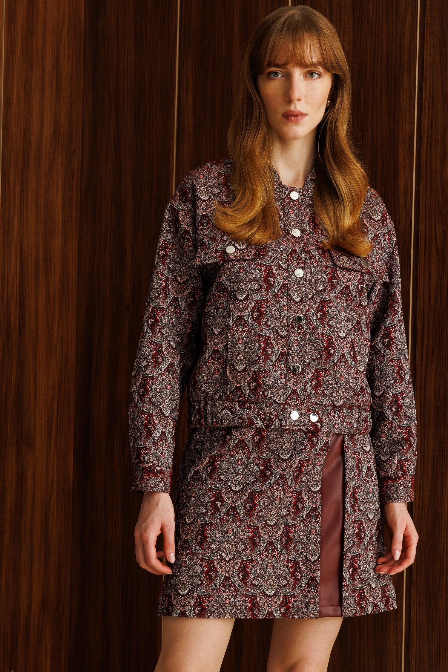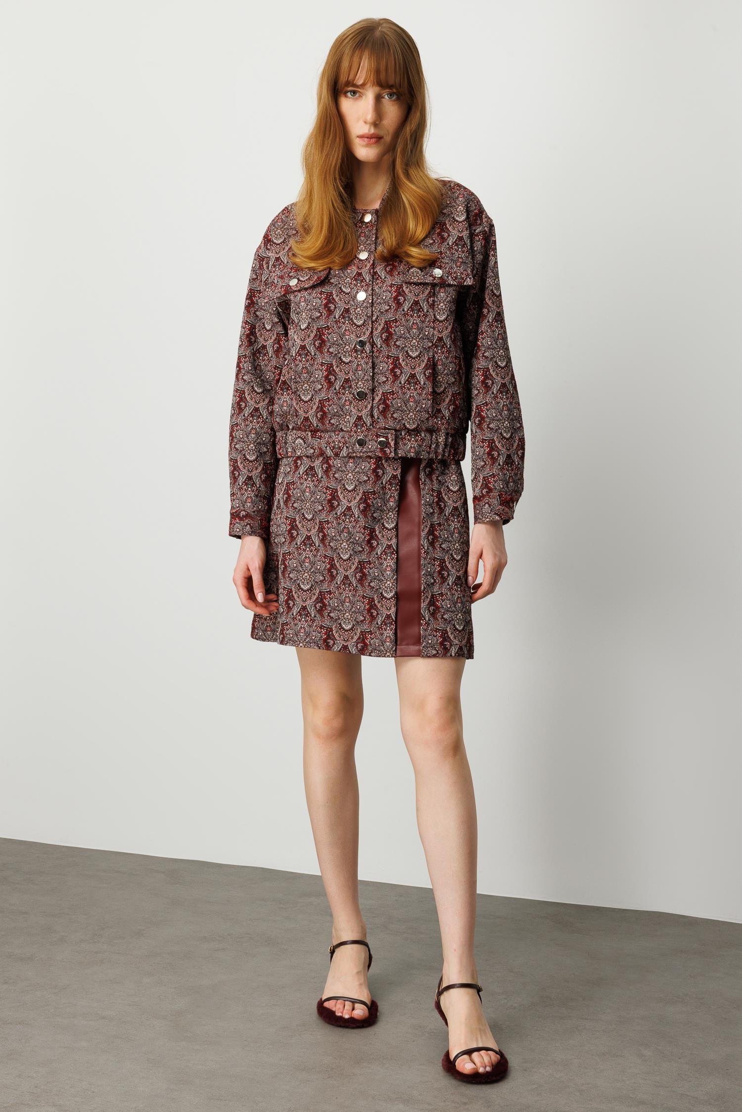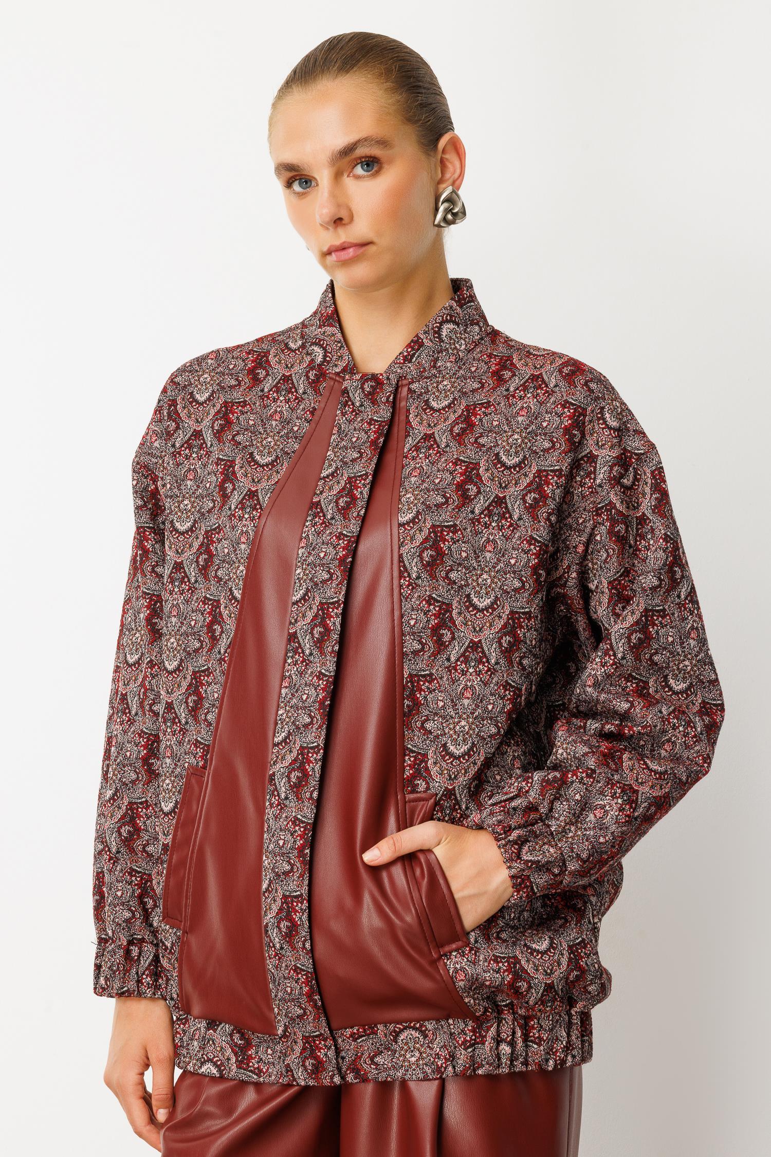 Ürün Detayları: • Model: Oversize bomber kesim, kısa form • Renk: Bordo • Kumaş: Jakar dokulu kumaş ve suni deri kombinasyonu • Detaylar: