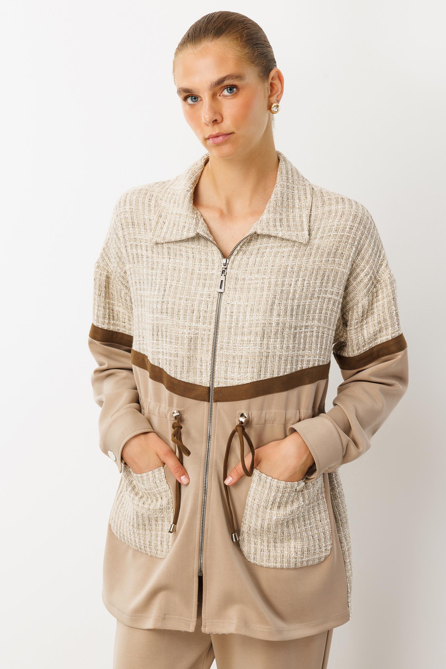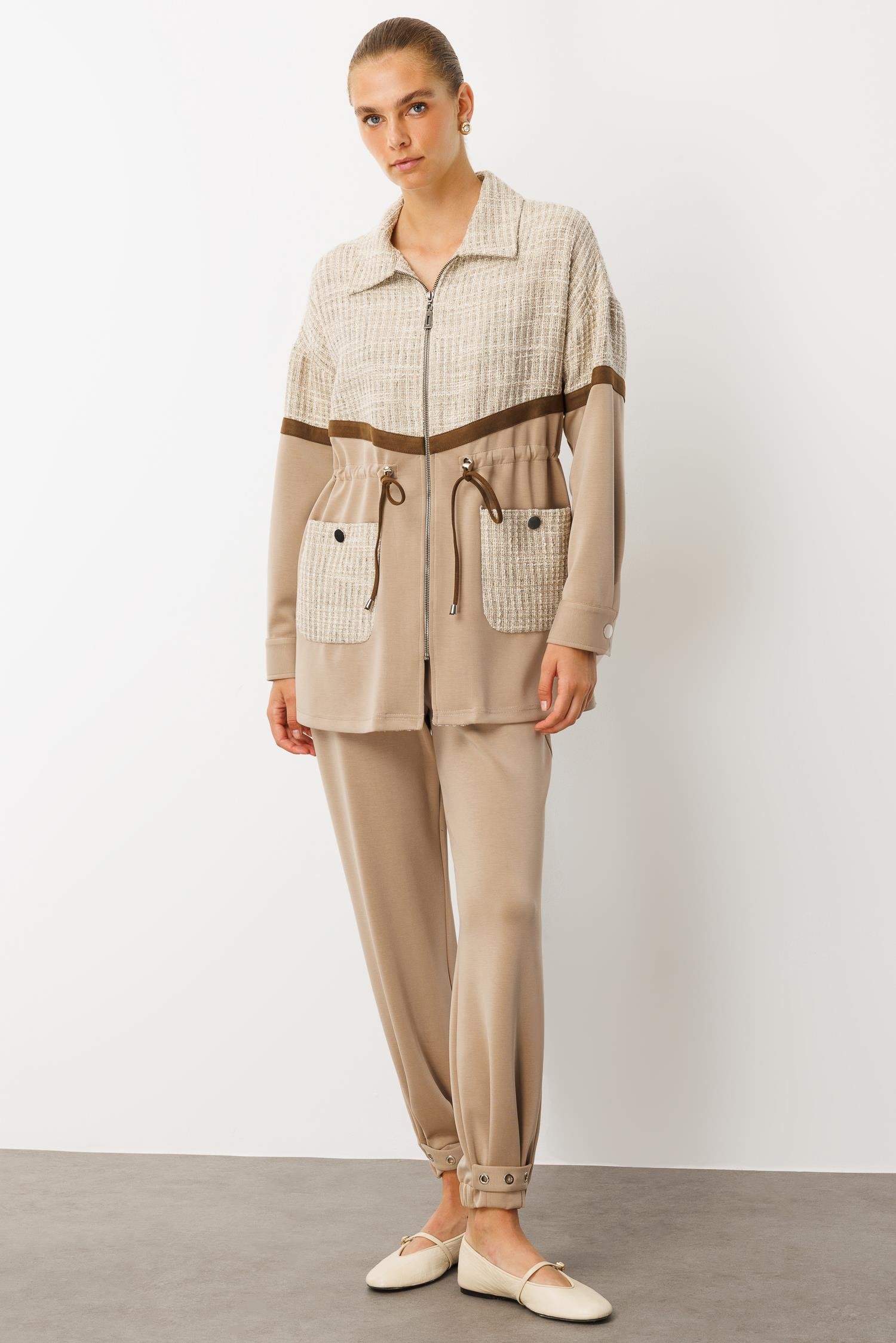 Modern kadının şehir hayatındaki rahatlık ve şıklık ihtiyacından doğan bu tunik, fonksiyonel detaylarıyla öne çıkıyor. Tuvit garnili yapısı sofistike bir görünüm kazandırırken, tünel bağcık detayı vücuda uyum sağlayarak özgür bir şıklık sunuyor. Spor-şık tarzın zamansız yorumu olan bu tasarım, hem gündelik yaşamın dinamik temposuna hem de şehirli kadının stiline güçlü bir dokunuş yapıyor.