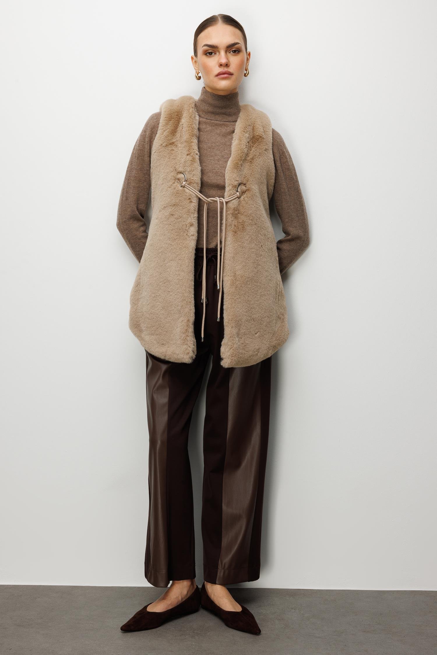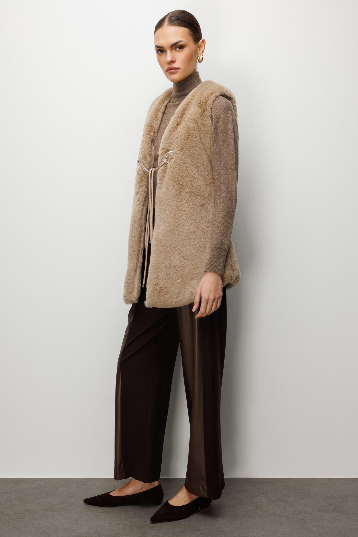 Model: Modern silüeti yumuşak dokuyla buluşturan, vücut hatlarını zarifçe saran uzun peluş yelek.