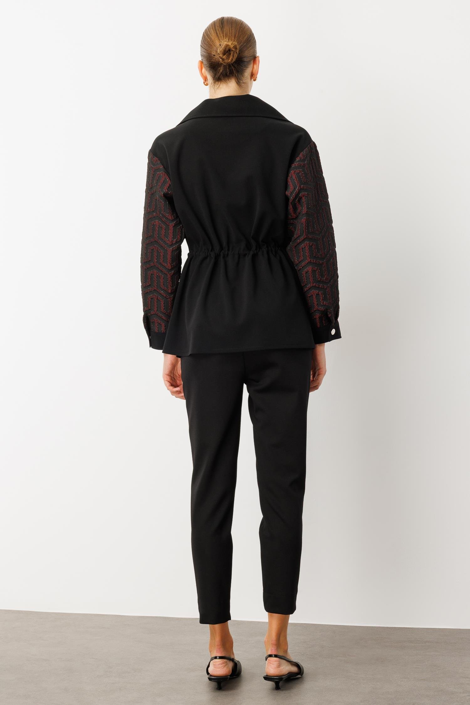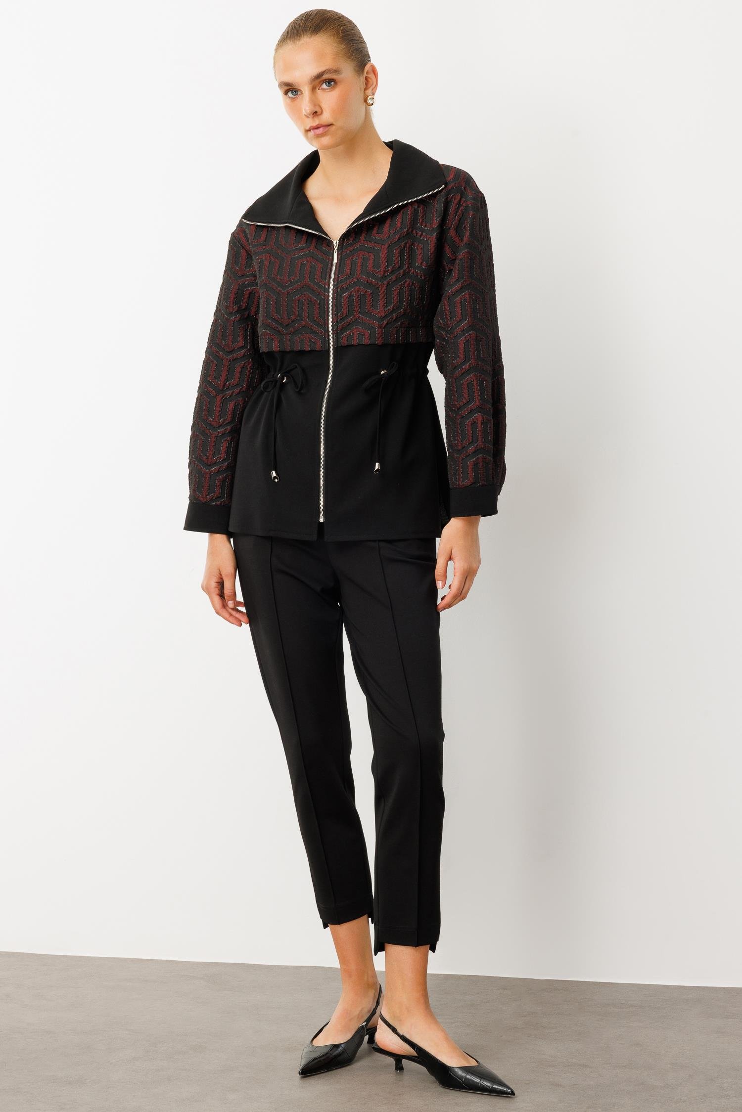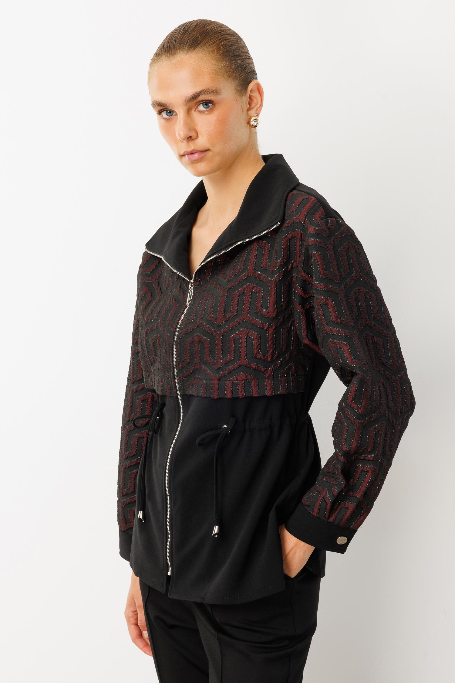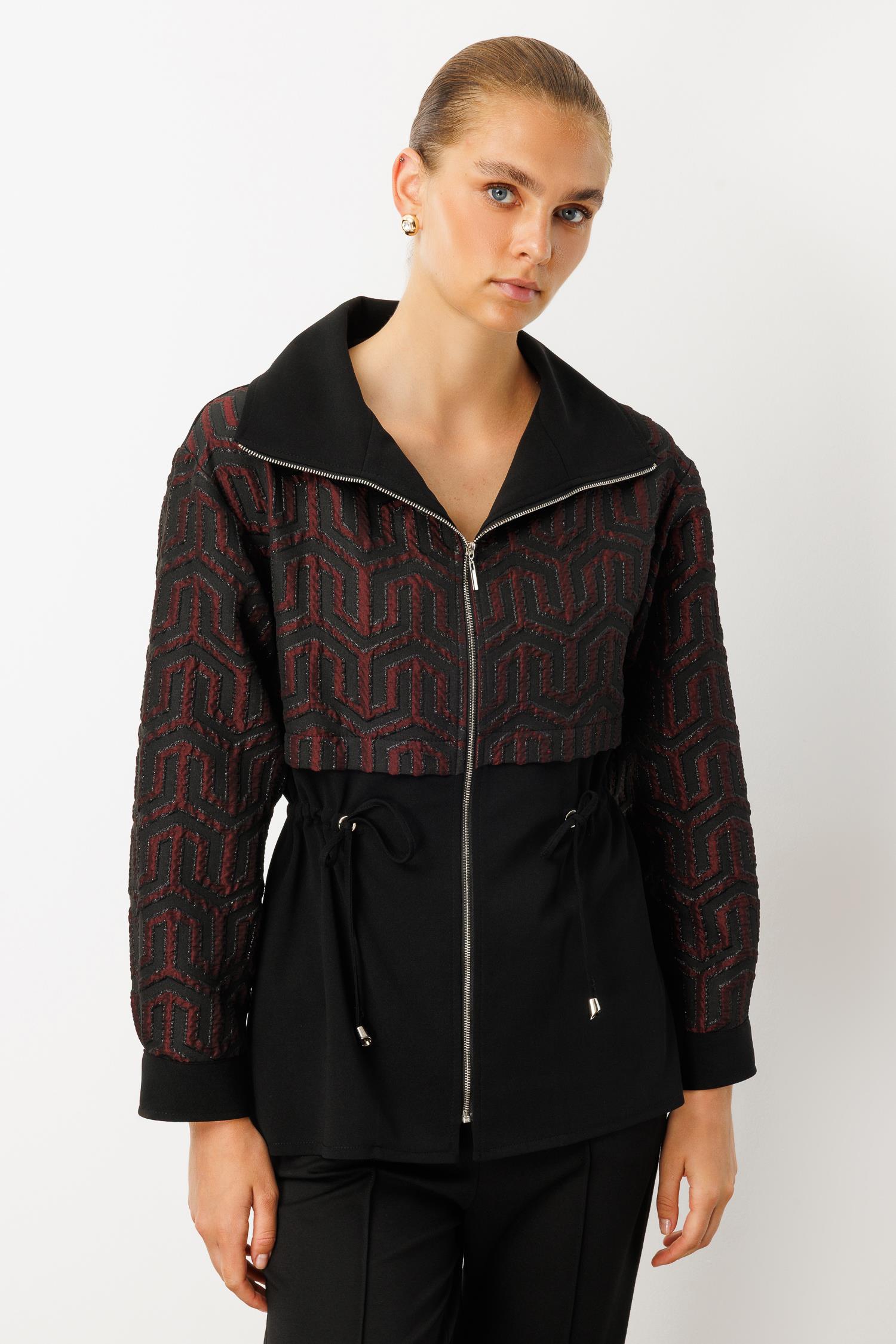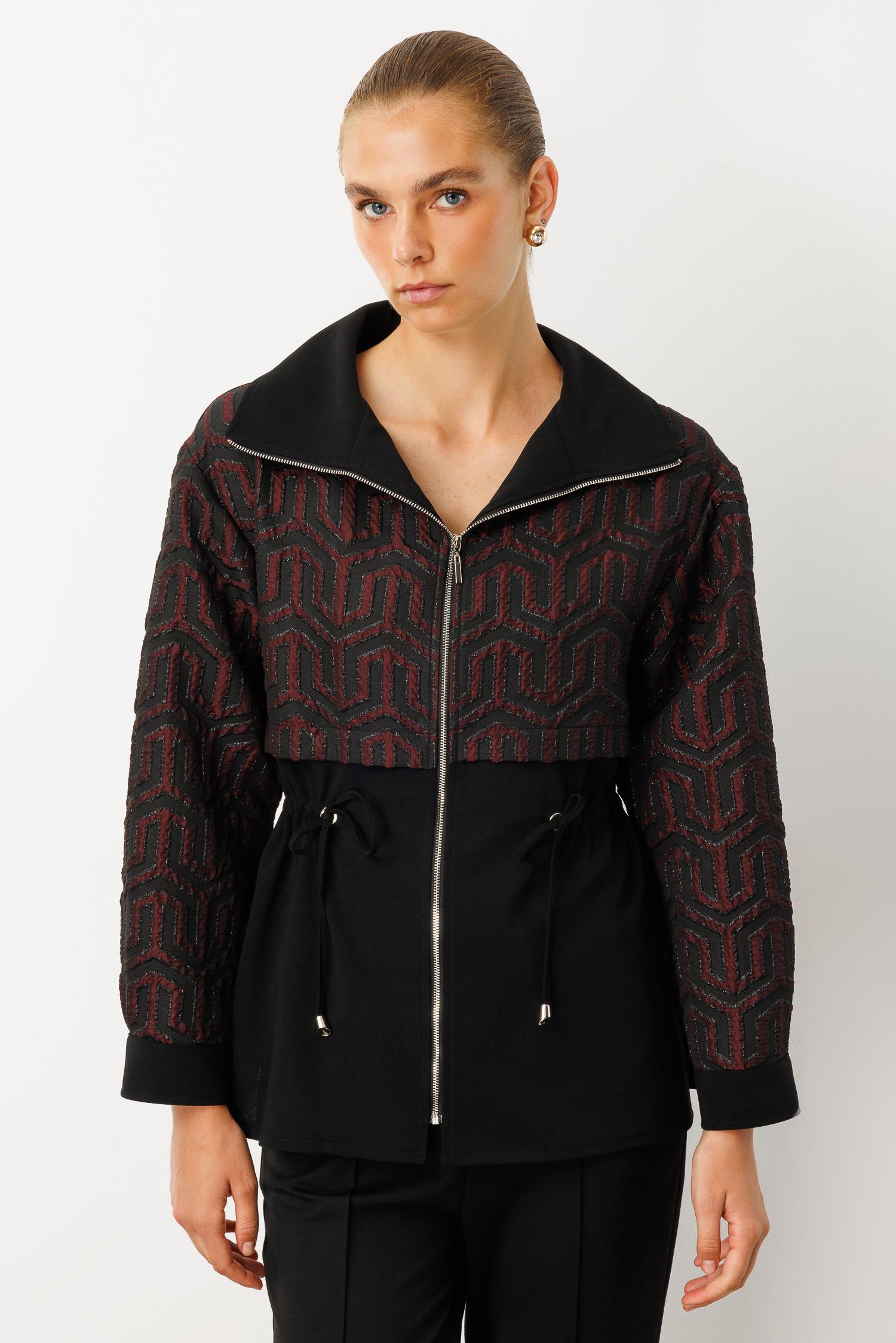 • Model: Fermuarlı, bele oturan formda modern tunik tasarımı • Renk: Bordo – Siyah kontrast detaylı • Kumaş: Üst bölümde jakarlı dokulu kumaş, alt bölümde düz dokuma • Detaylar: • Önde tam boy metal fermuar kapama • Bel kısmında ayarlanabilir büzgü detayı • Geniş yakalı ve uzun kollu form • Jakarlı üst yüzeyde geometrik desen dokusu • Arka kısmı düz, astarsız hafif yapı • Günlük şıklığı modern dokularla buluşturan zarif bir tasarım