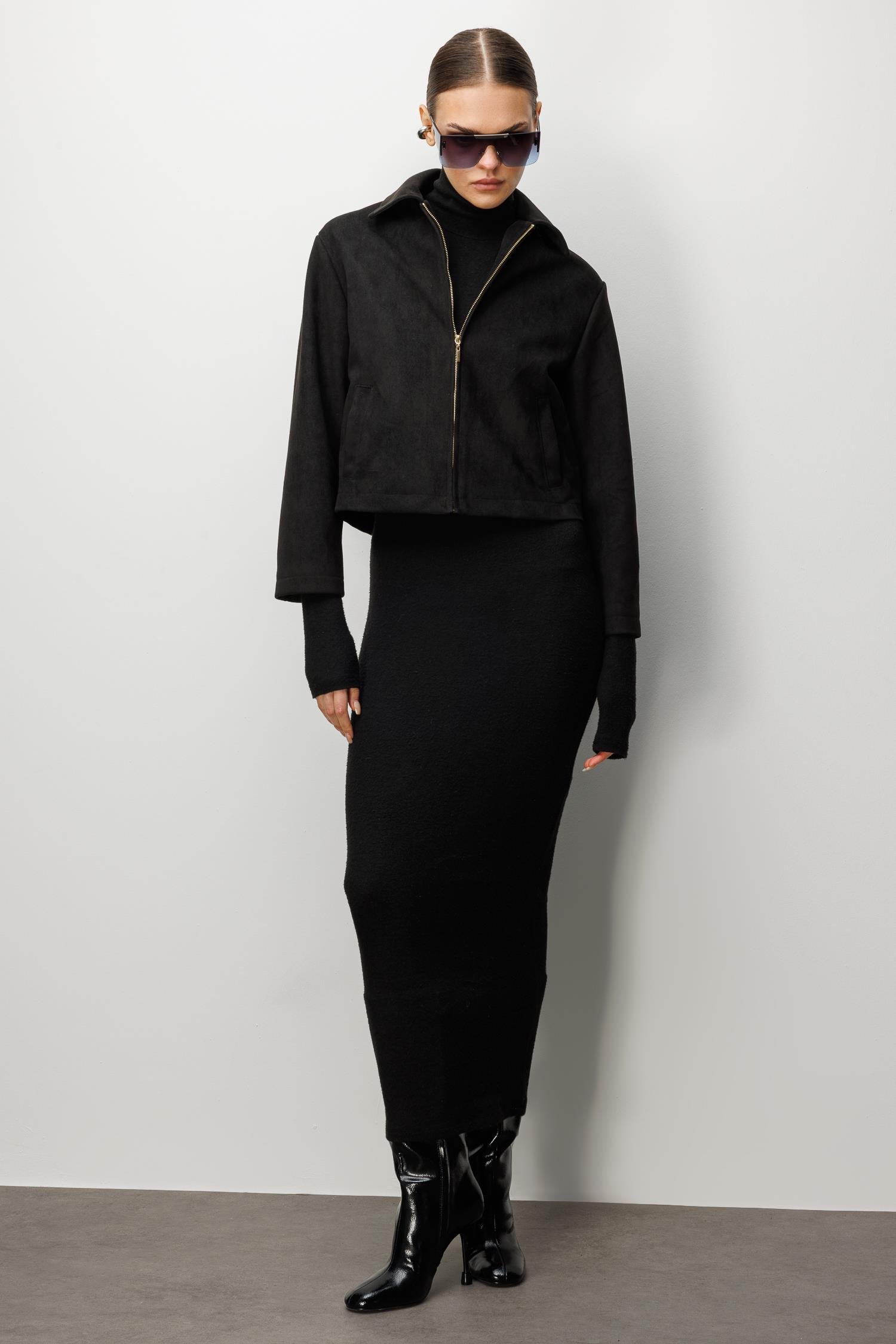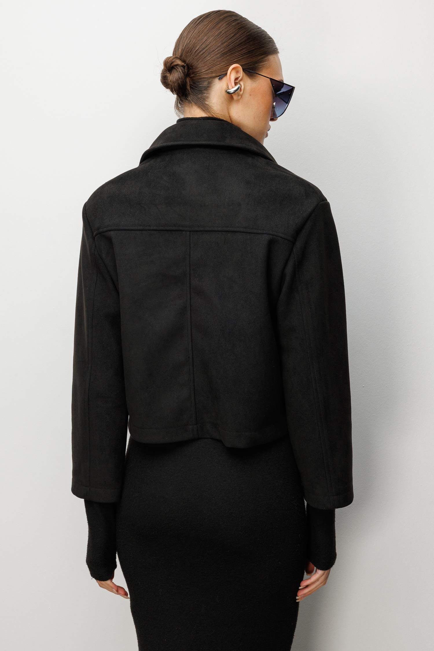 Model: Keskin hatları yumuşak süet dokusuyla dengeleyen, modern ve dinamik Kısa Süet Mont.