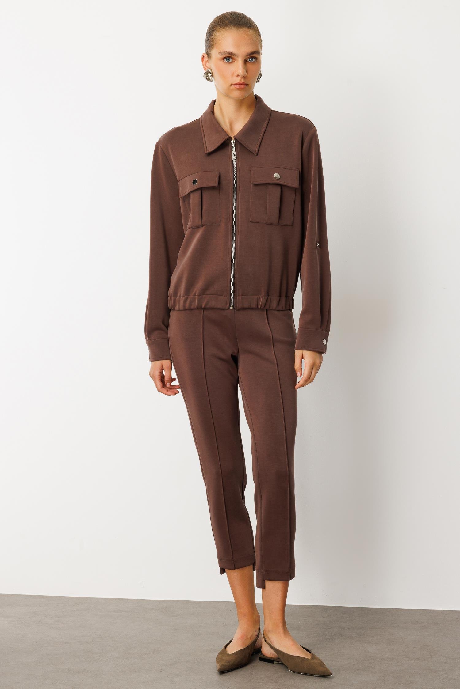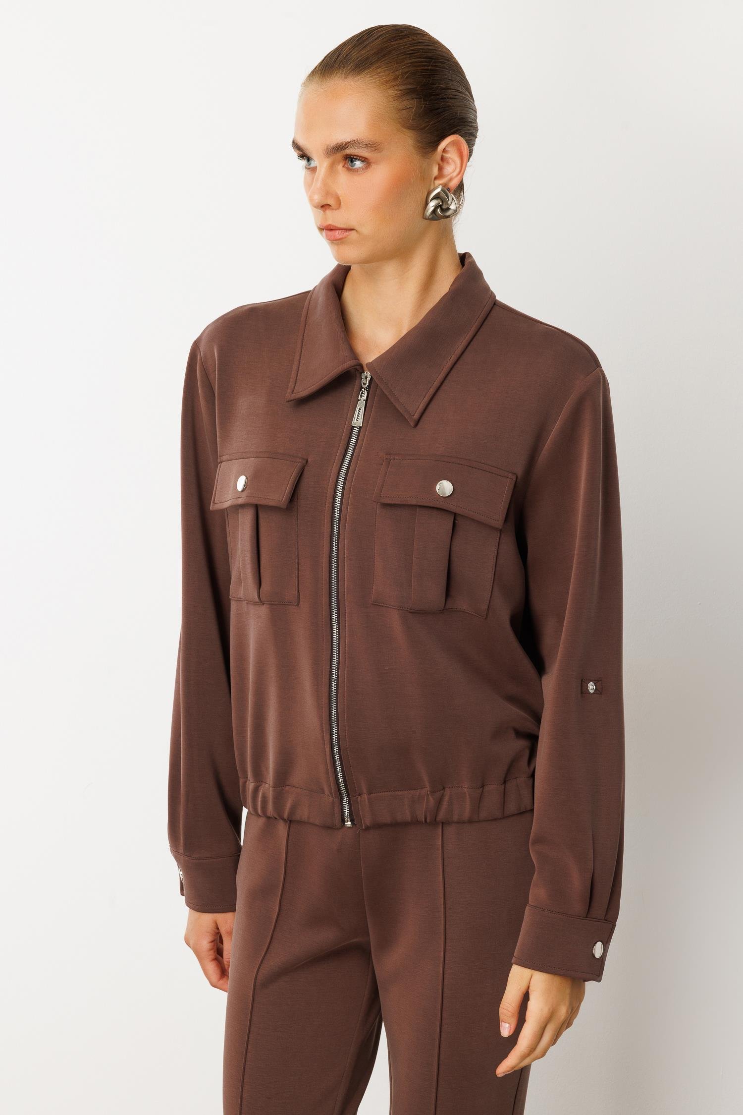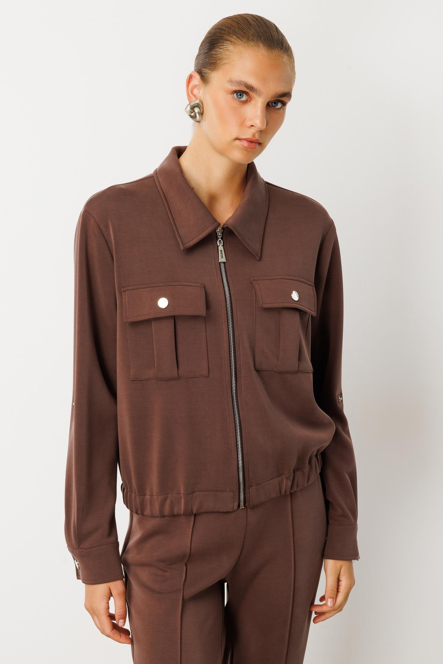 Modailgi Fermuar Kapamalı Etek Altı Lastikli Kapak Cep Detaylı Örme Gömlek - Kahve