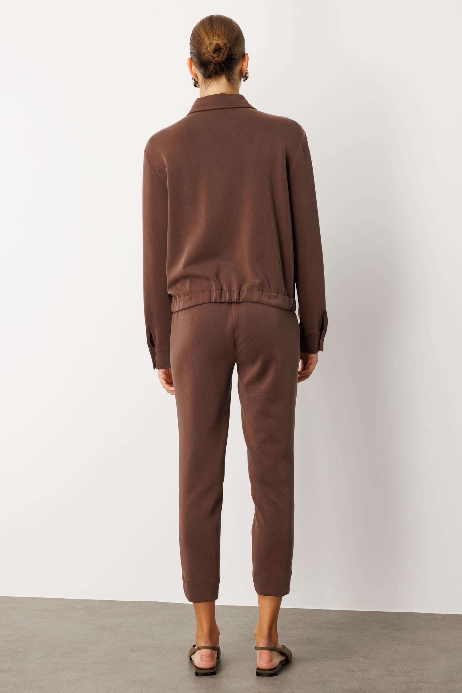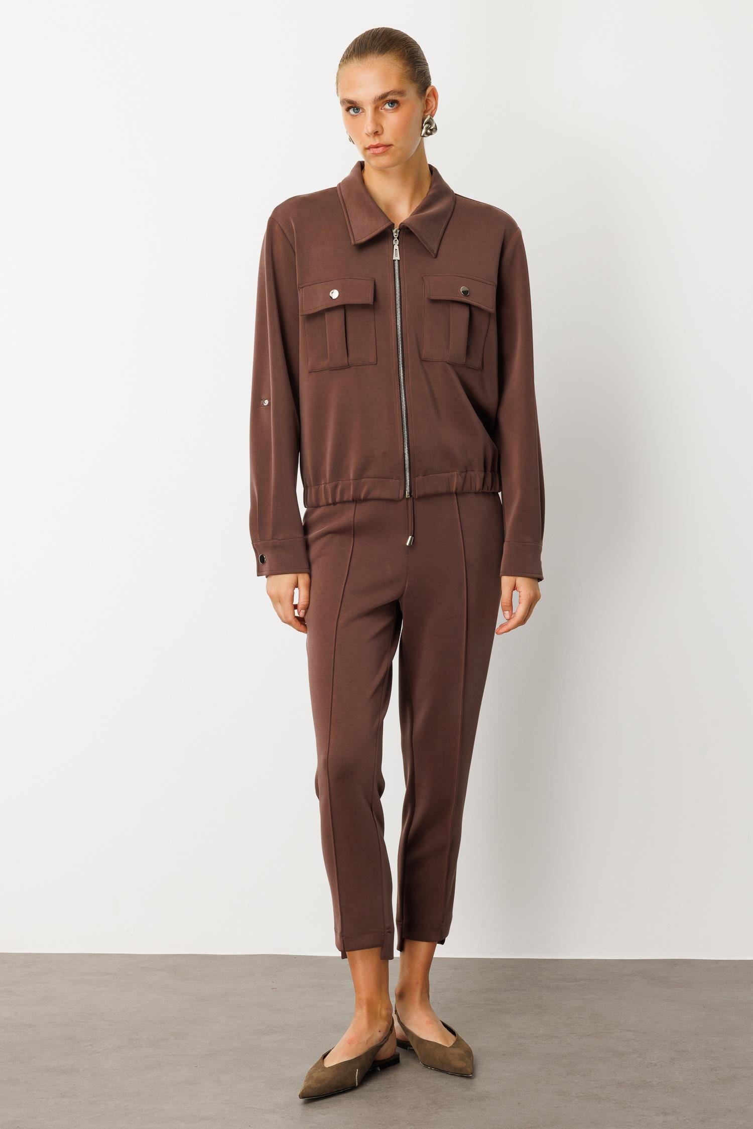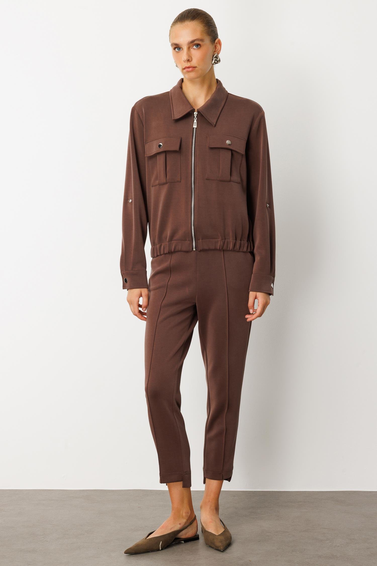 Modailgi Fermuar Kapamalı Etek Altı Lastikli Kapak Cep Detaylı Örme Gömlek - Kahve