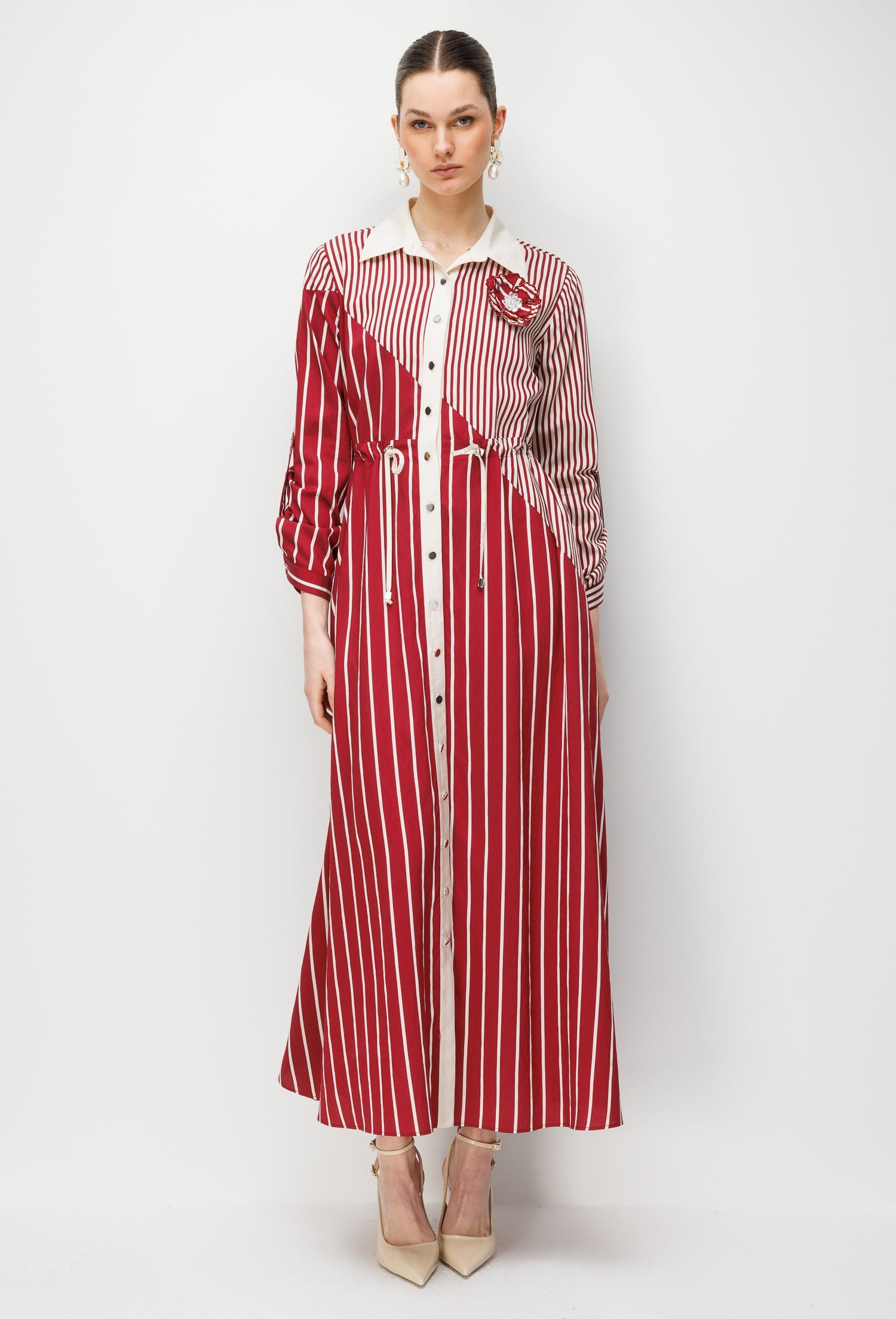 Kısa Ürün Başlığı: Bordo ve ekru çizgilerin dinamik oyununu asimetrik kesim detayları ve beli vurgulayan büzgü tasarımıyla buluşturan, modern ve eforsuz şıklık sunan uzun elbise.