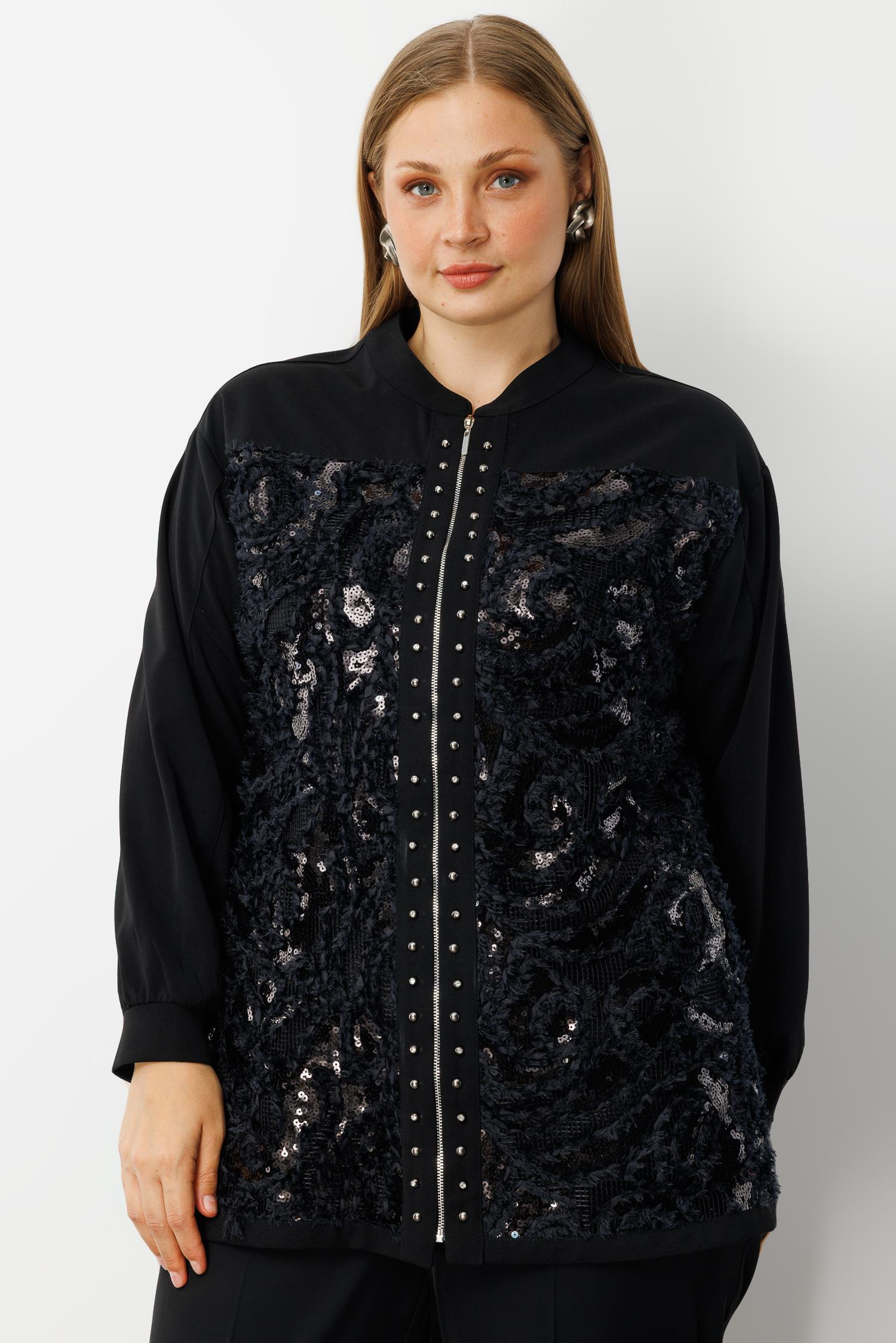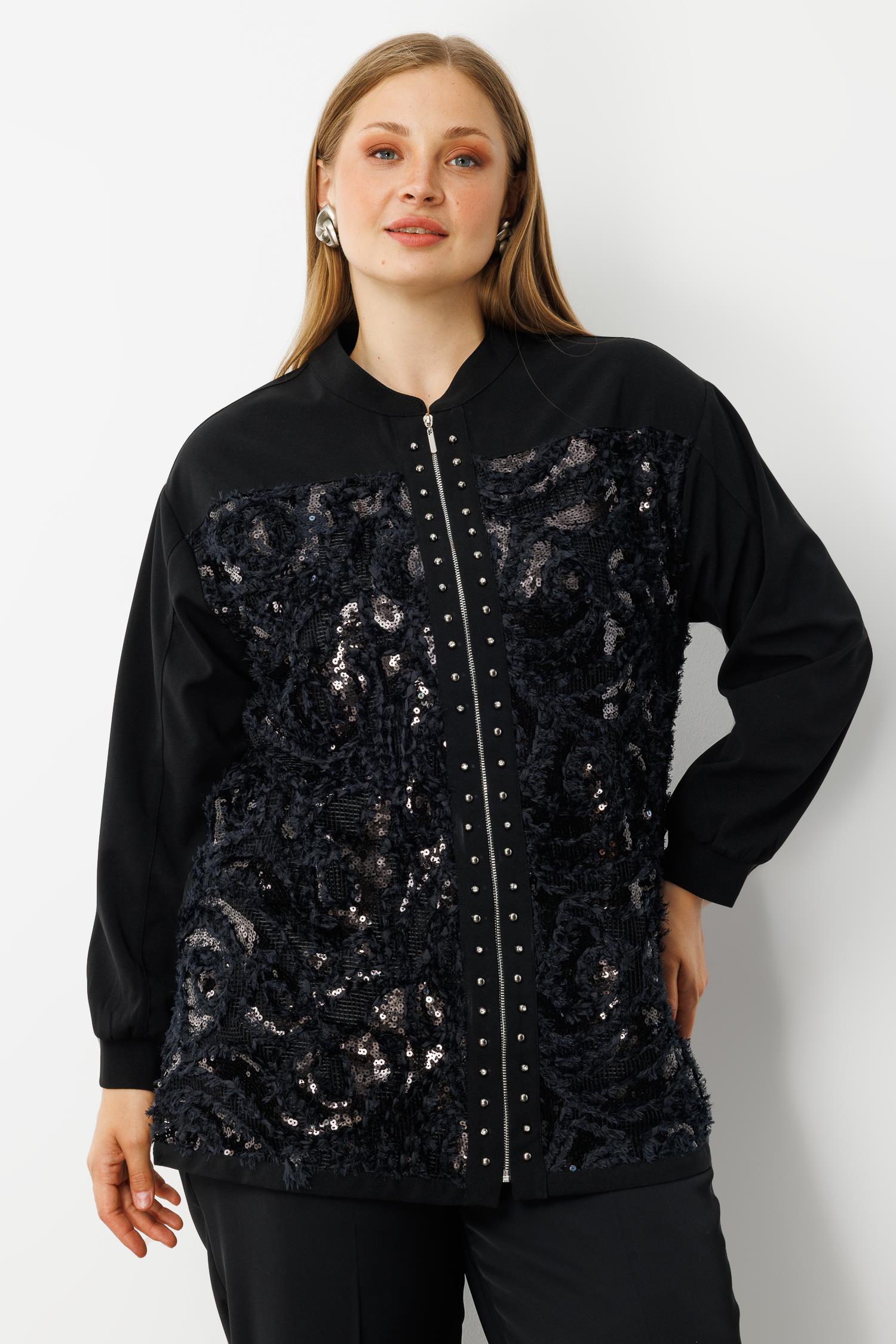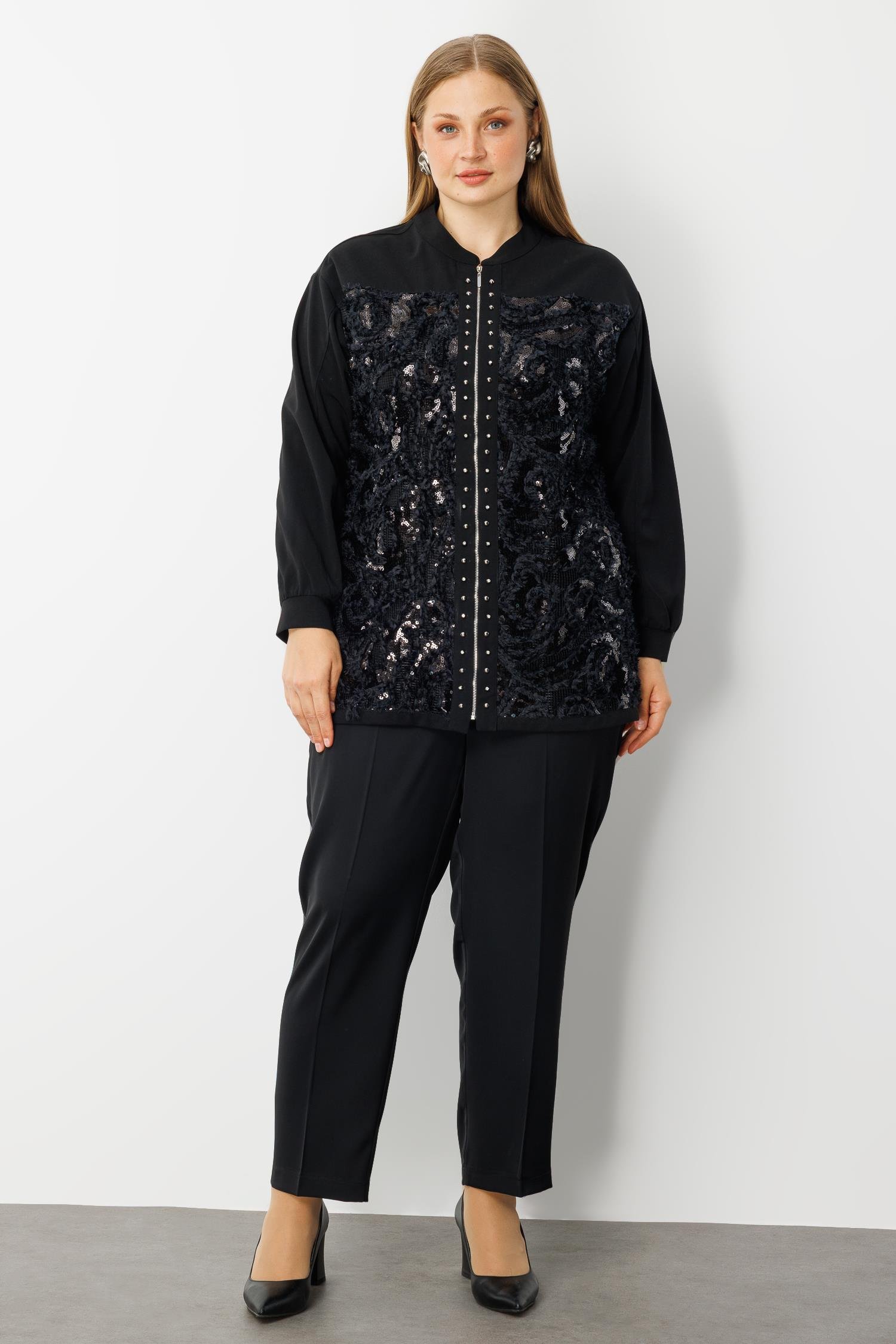 • Model: Fermuarlı, düz kesim, zarif ve modern tunik formu • Renk: Siyah • Kumaş: Premium dokulu kumaş, ön panelde ışıltılı güpür detaylı • Detaylar: • Ön kısmında inci ve fermuar detaylarıyla hareket kazandırılmış tasarım • Kollar ve arka bölümde düz siyah kumaş geçişleri • Yuvarlak yaka formu • Tam boy fermuar kapama • Astarlı ön panel, pürüzsüz duruş sağlar • Şık davetlerden ofis kombinlerine kadar zarafetiyle fark yaratır