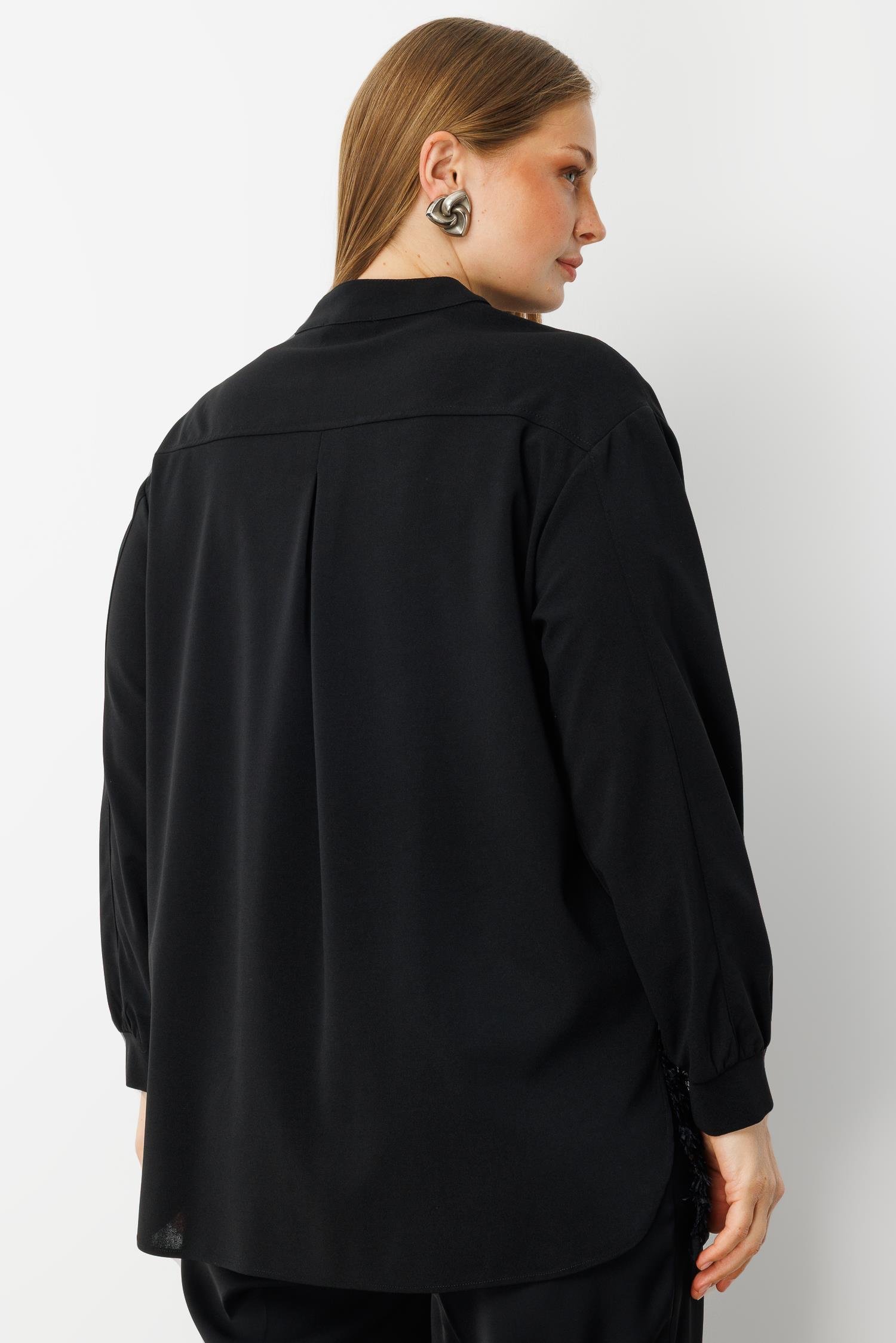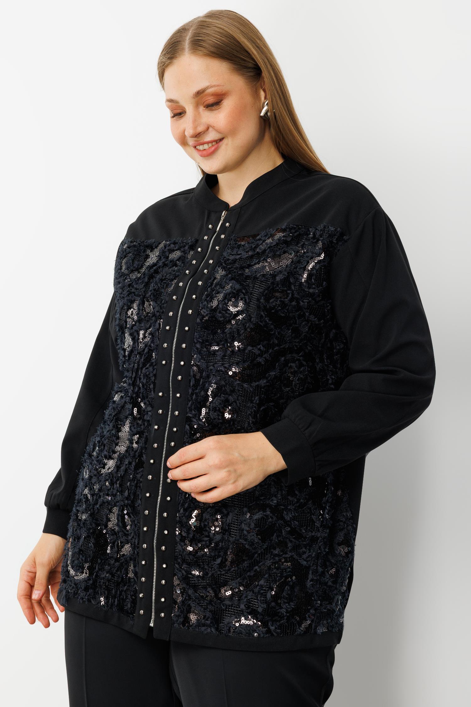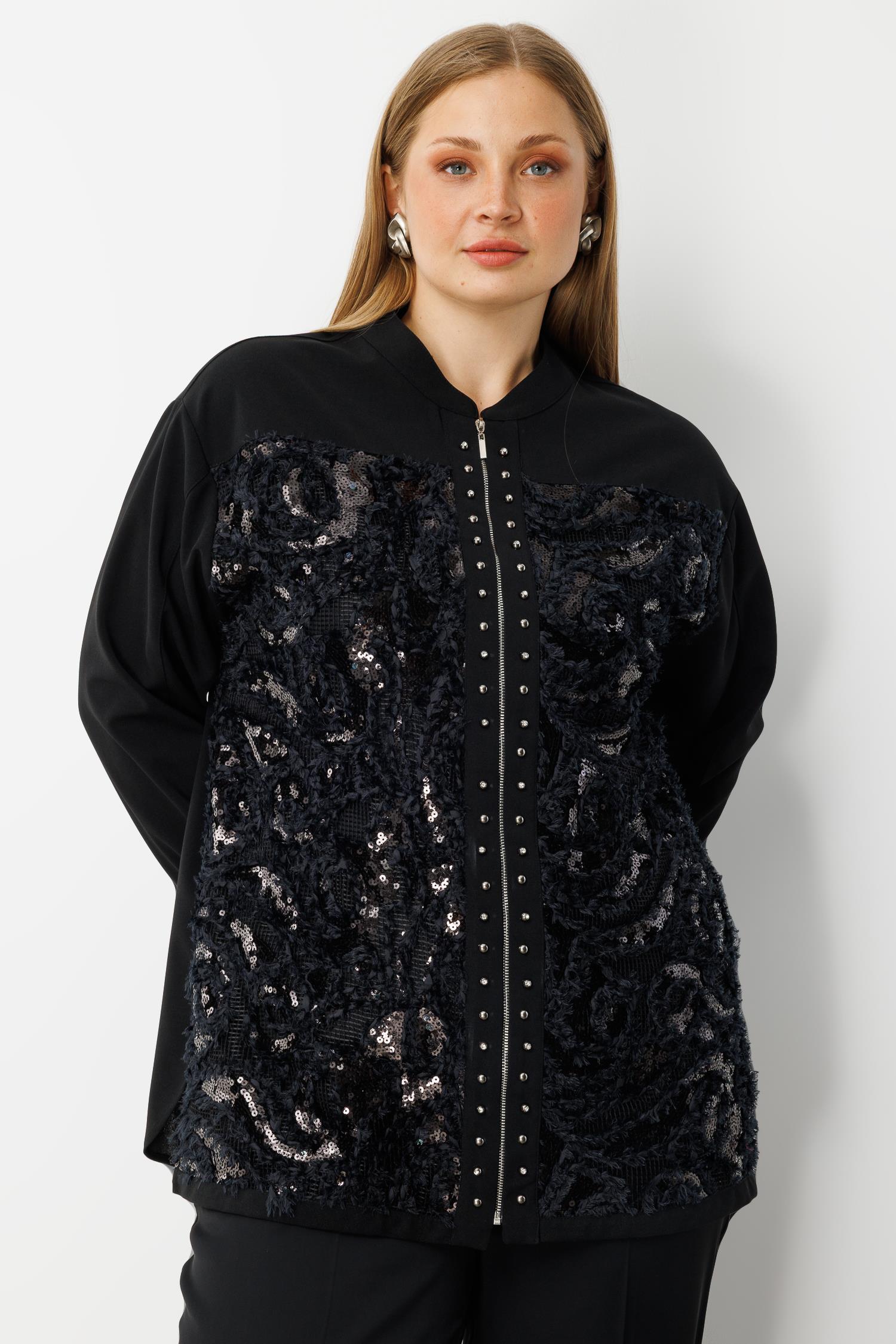 • Model: Fermuarlı, düz kesim, zarif ve modern tunik formu • Renk: Siyah • Kumaş: Premium dokulu kumaş, ön panelde ışıltılı güpür detaylı • Detaylar: • Ön kısmında inci ve fermuar detaylarıyla hareket kazandırılmış tasarım • Kollar ve arka bölümde düz siyah kumaş geçişleri • Yuvarlak yaka formu • Tam boy fermuar kapama • Astarlı ön panel, pürüzsüz duruş sağlar • Şık davetlerden ofis kombinlerine kadar zarafetiyle fark yaratır