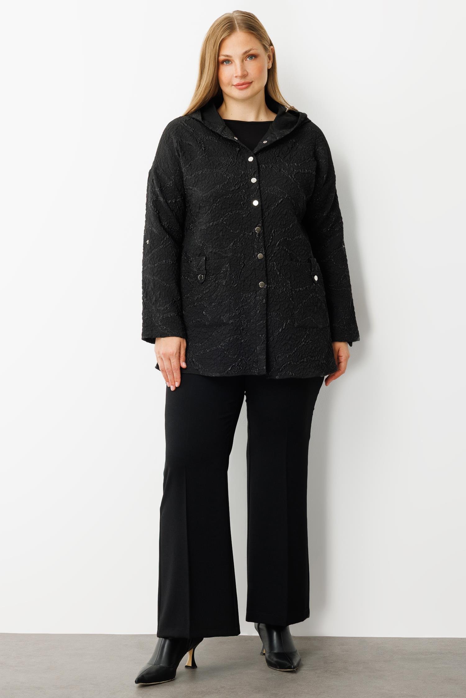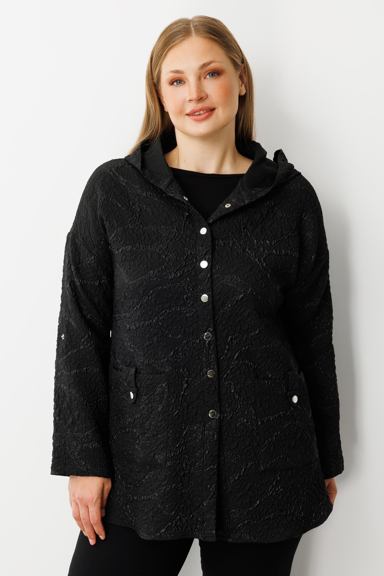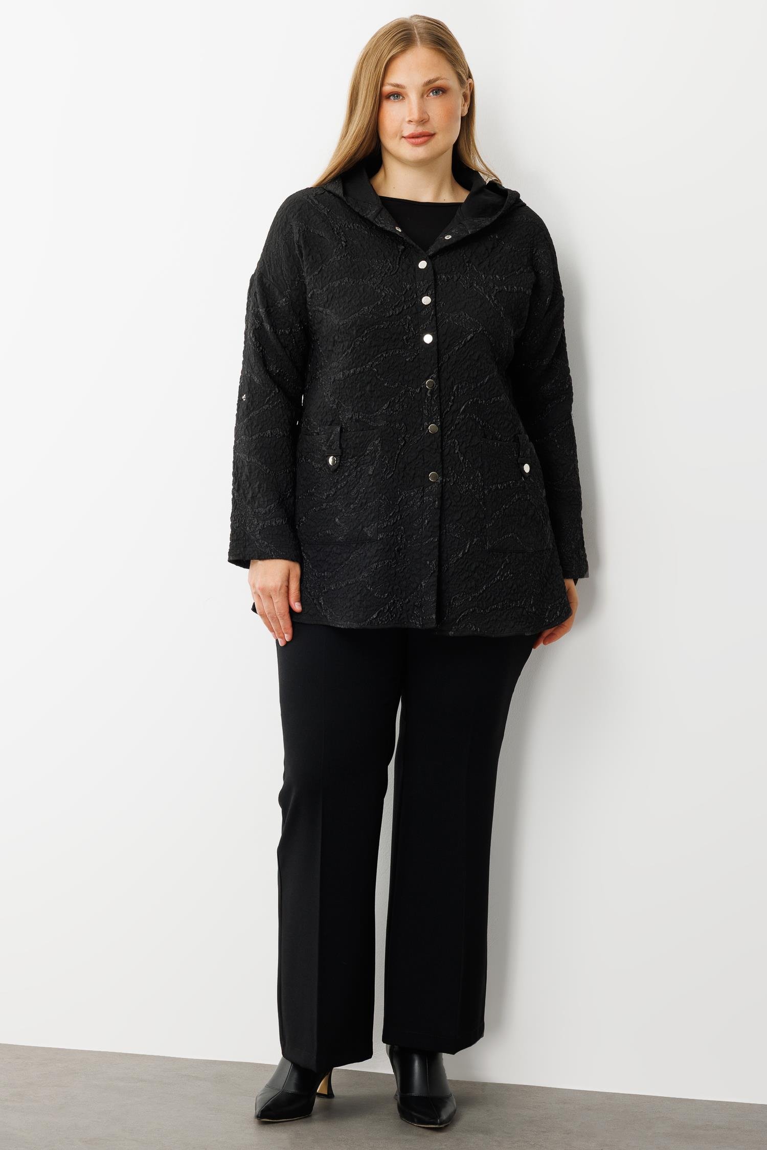 • Model: Kapüşonlu, düz kesim, rahat ve modern tunik formu • Renk: Siyah • Kumaş: Jakarlı dokuma kumaş, hafif parlak doku • Detaylar: • Önde metal düğmeli kapama • İki yan cep detayı • Kapüşonlu tasarım ile sportif-şık duruş • Tam astarlı yapı sayesinde konforlu kullanım • Uzun kollu ve kalça hizasında biten form • Gün boyu şıklık ve rahatlığı bir araya getirir