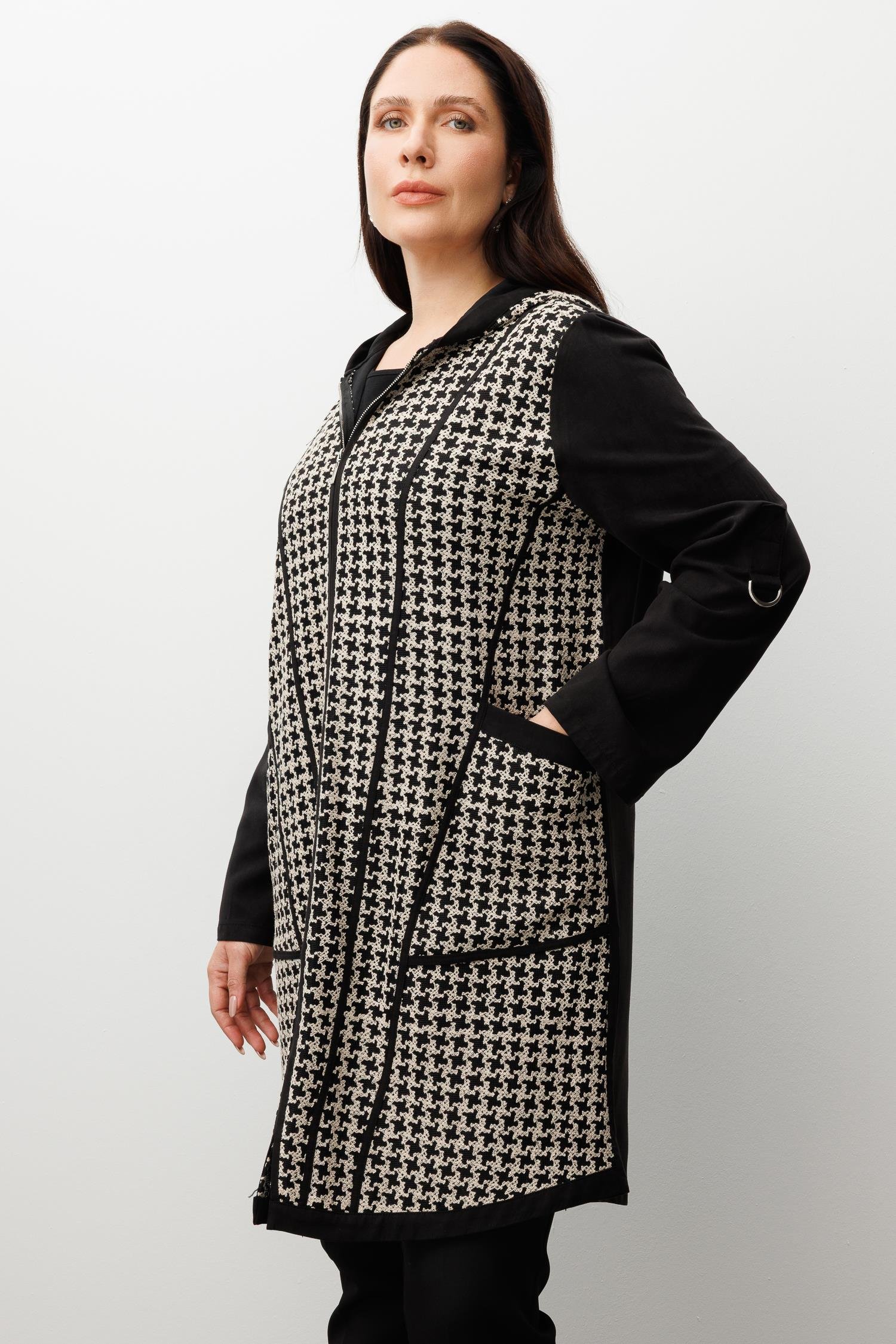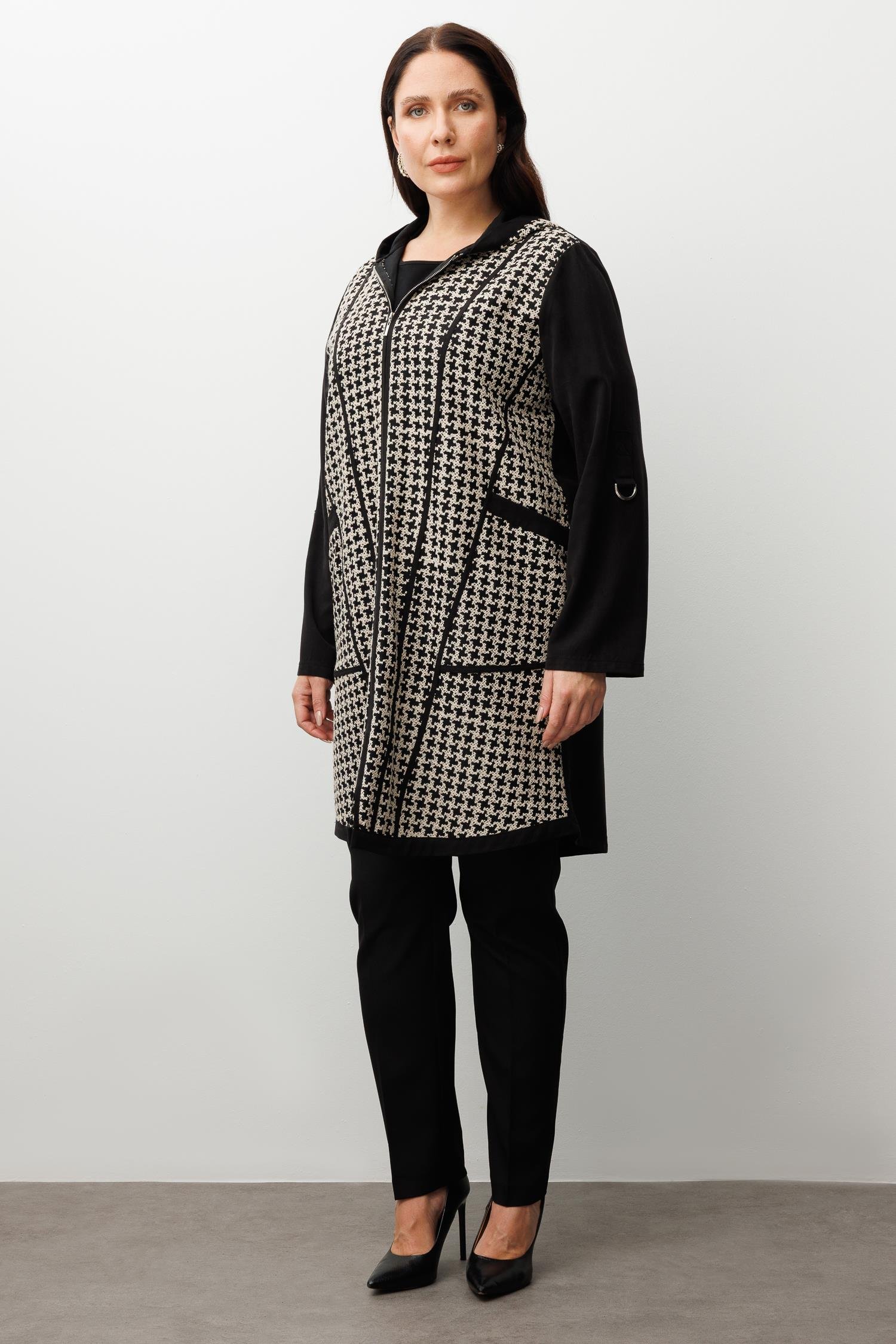 Modailgi  Kapüşonlu Kolları Apoletli Kazayağı Desen Nakış Kumaş Kap Siyah