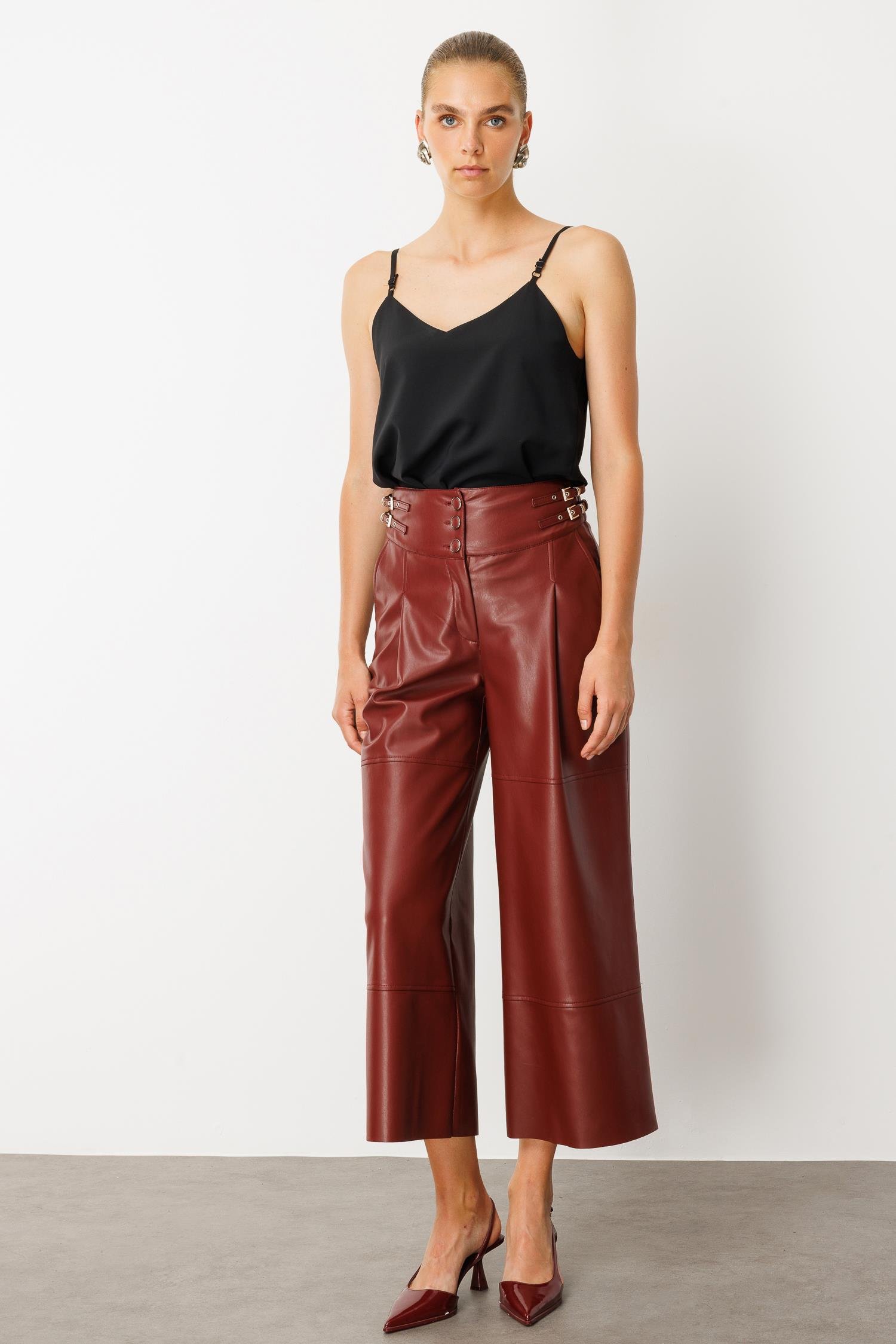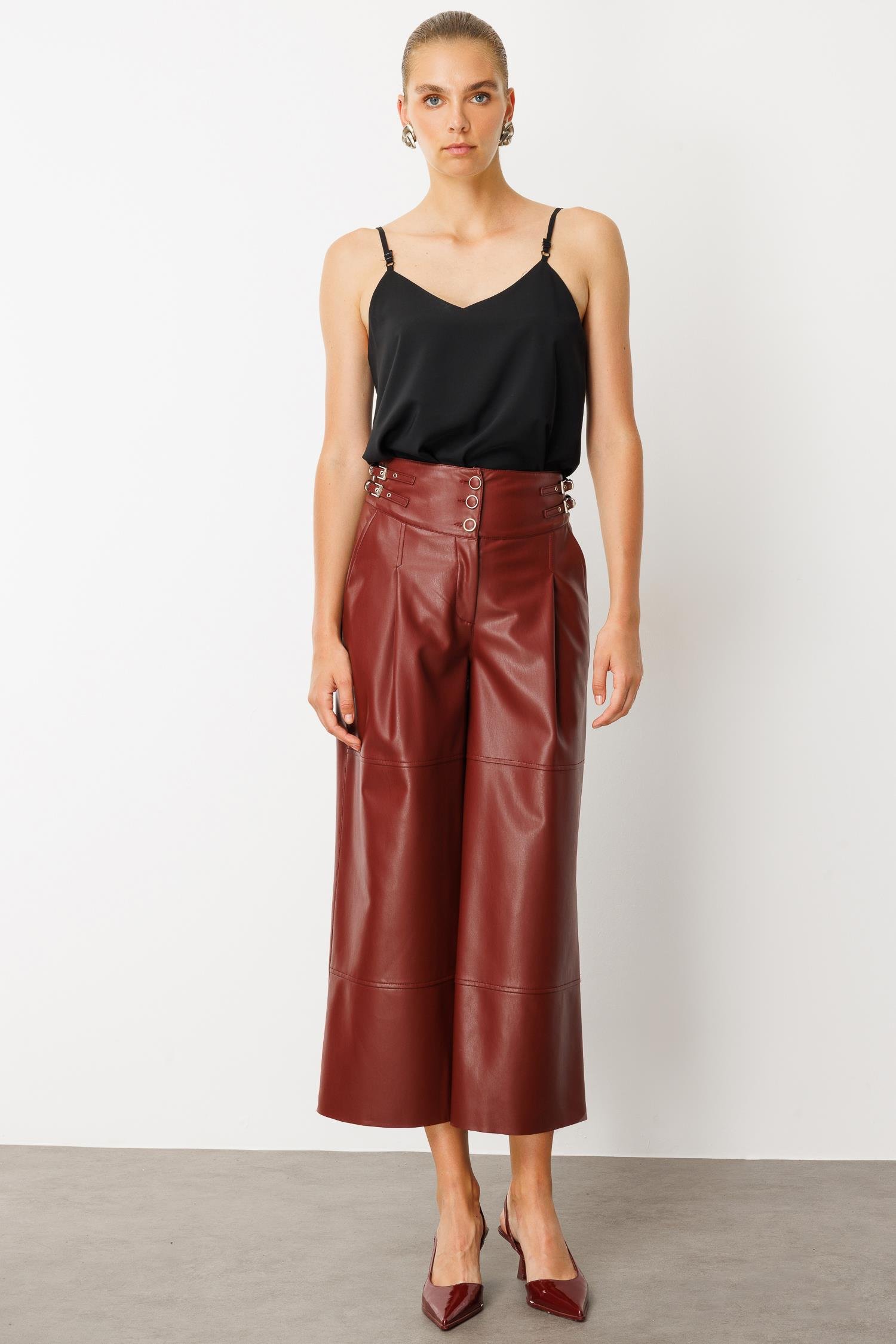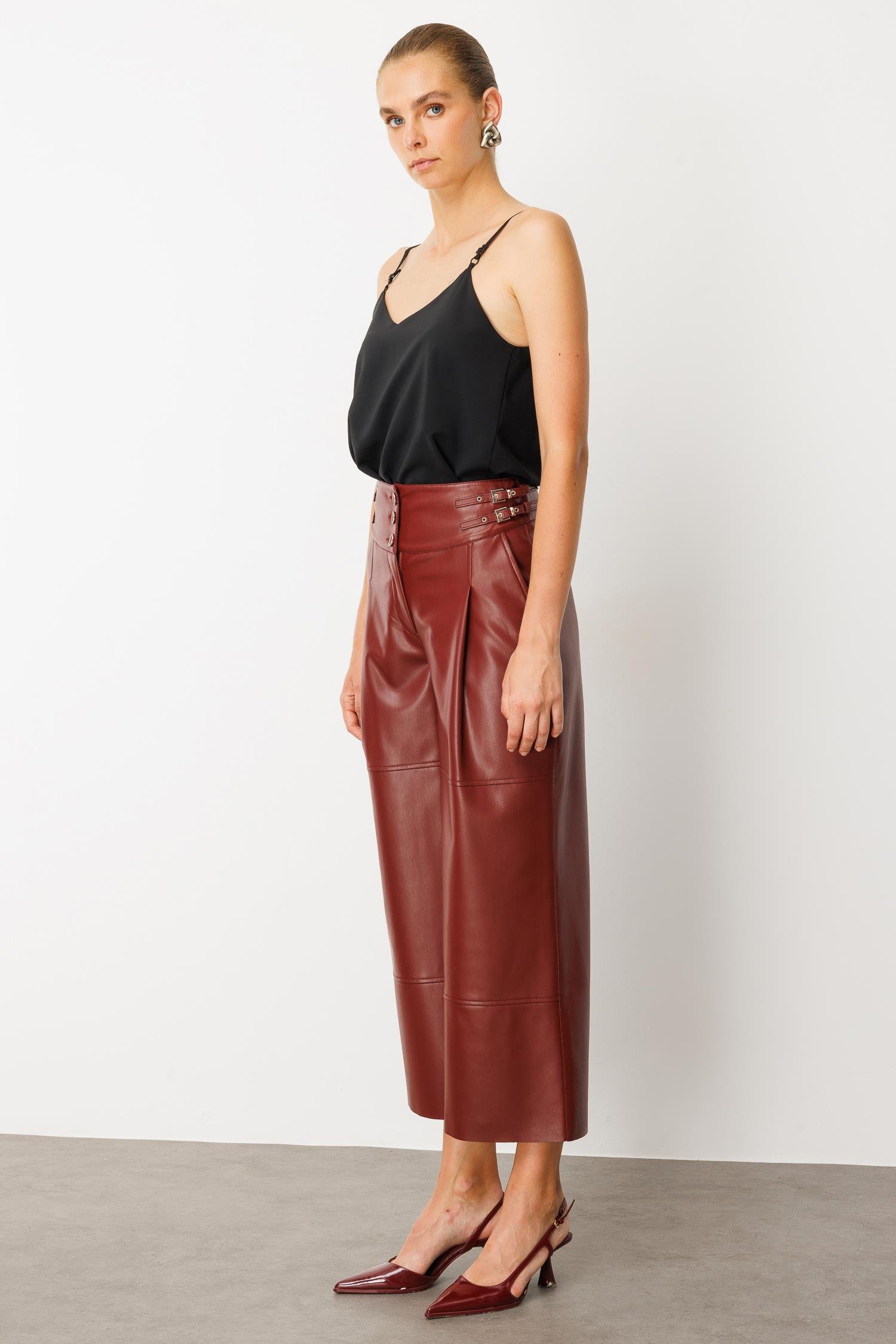 Modailgi Kemer Kısmı Deri Toka Detaylı Yandan Cepli Pileli Ara Boy Pantolon - Bordo
