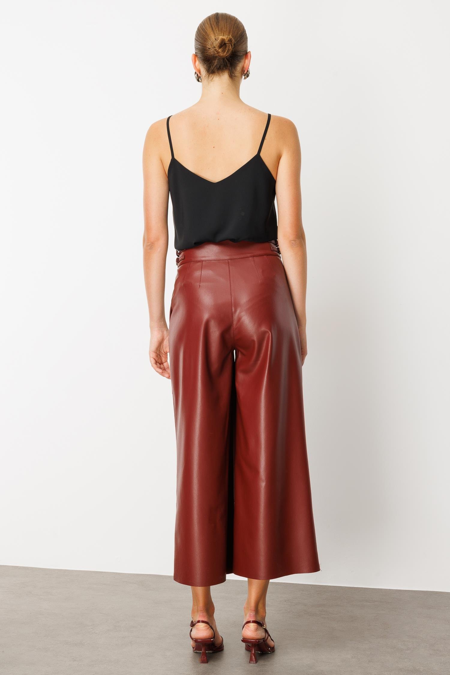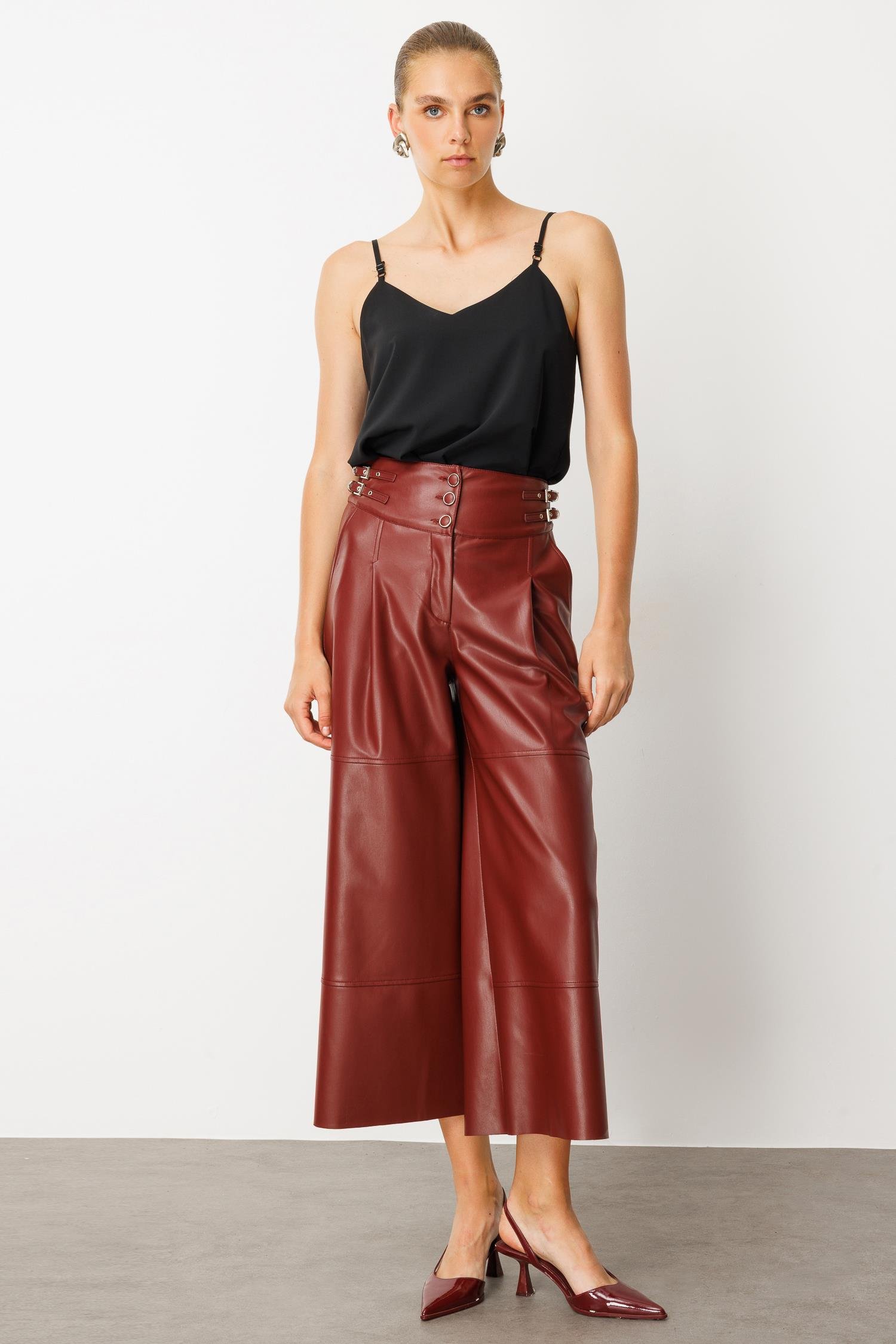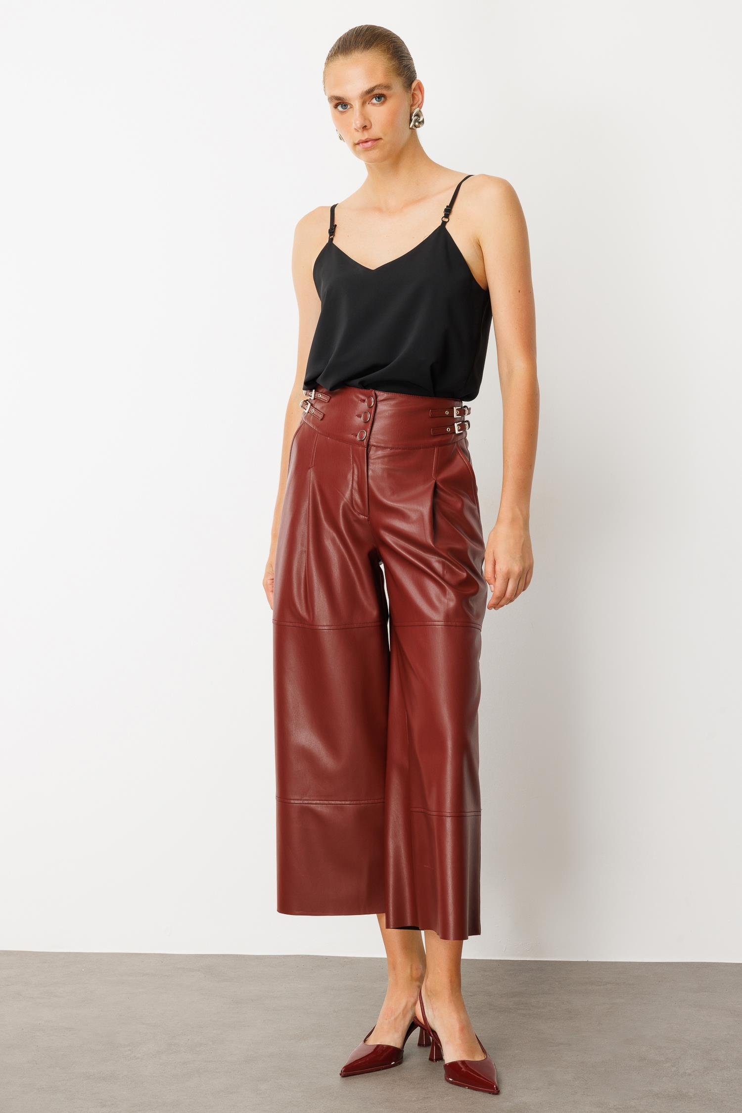 Modailgi Kemer Kısmı Deri Toka Detaylı Yandan Cepli Pileli Ara Boy Pantolon - Bordo