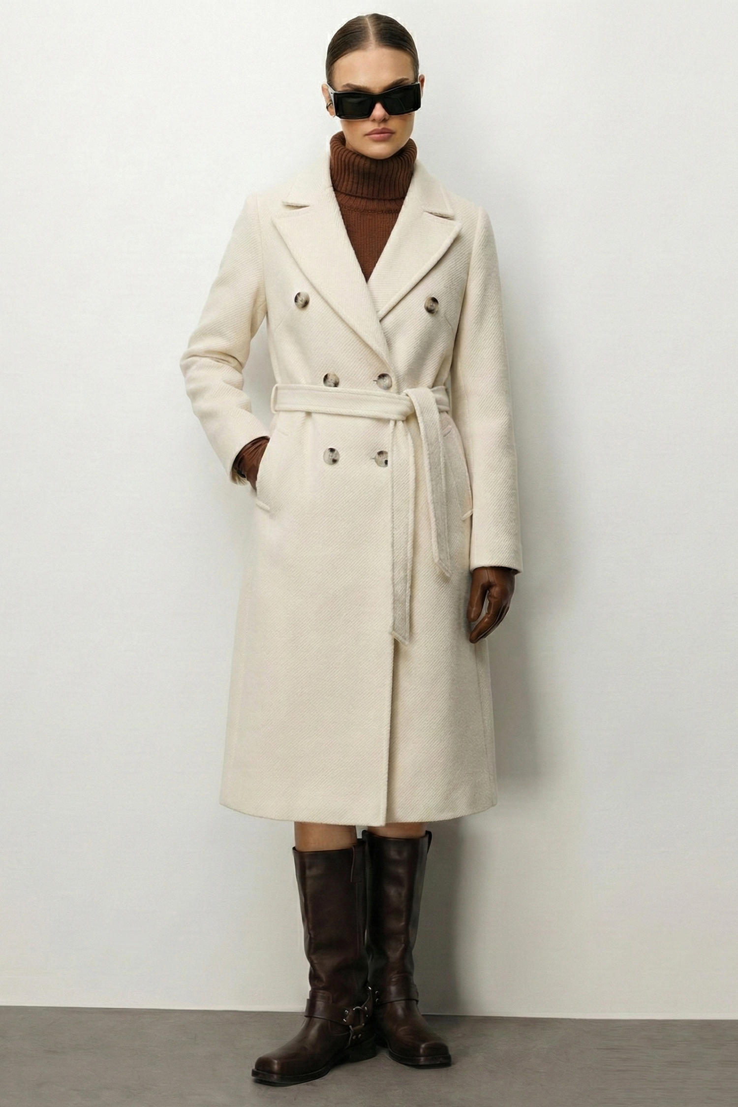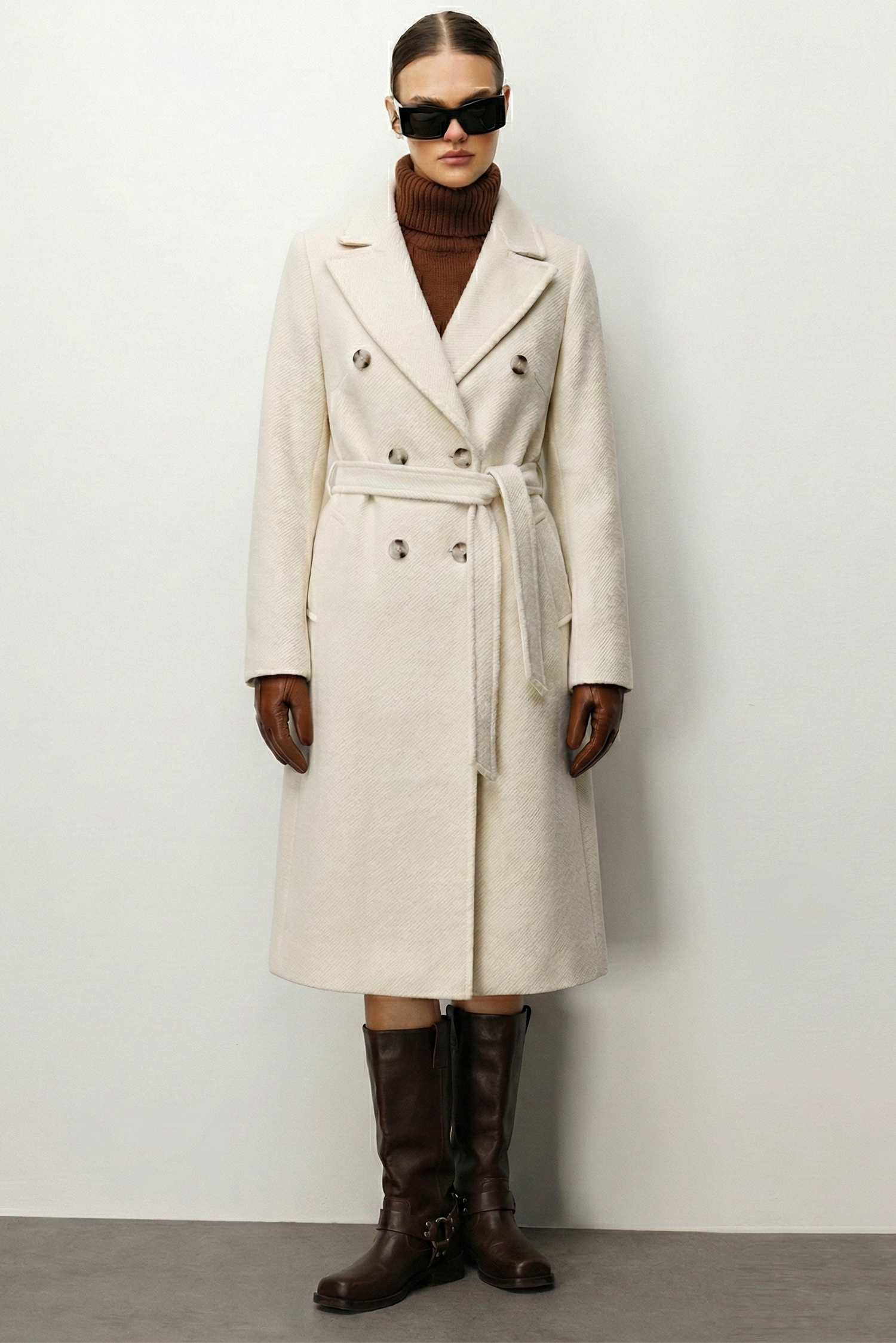Model: Klasik palto silüetini modern doku oyunlarıyla zenginleştiren, geniş yakalı ve kuşaklı kruvaze kaban.