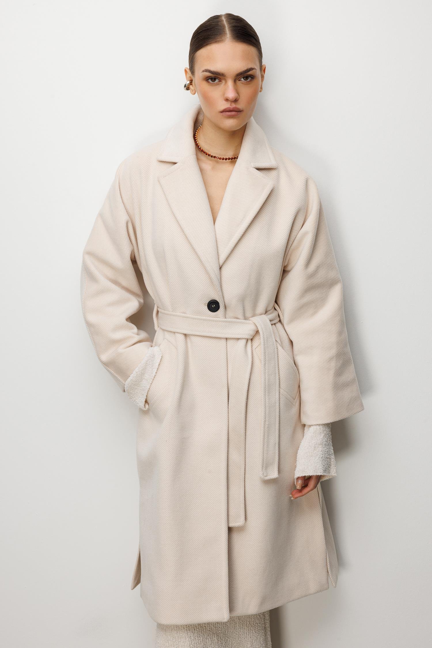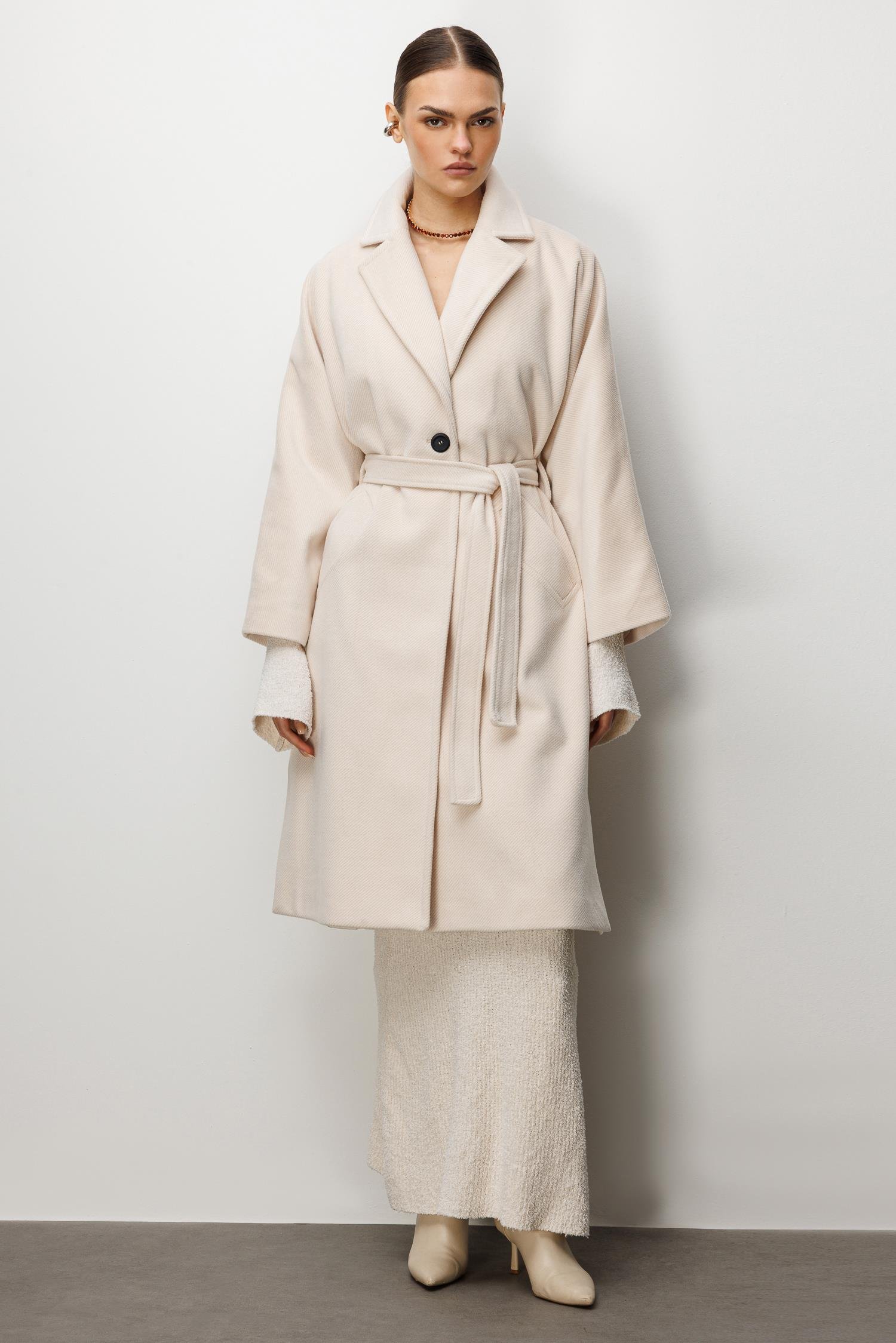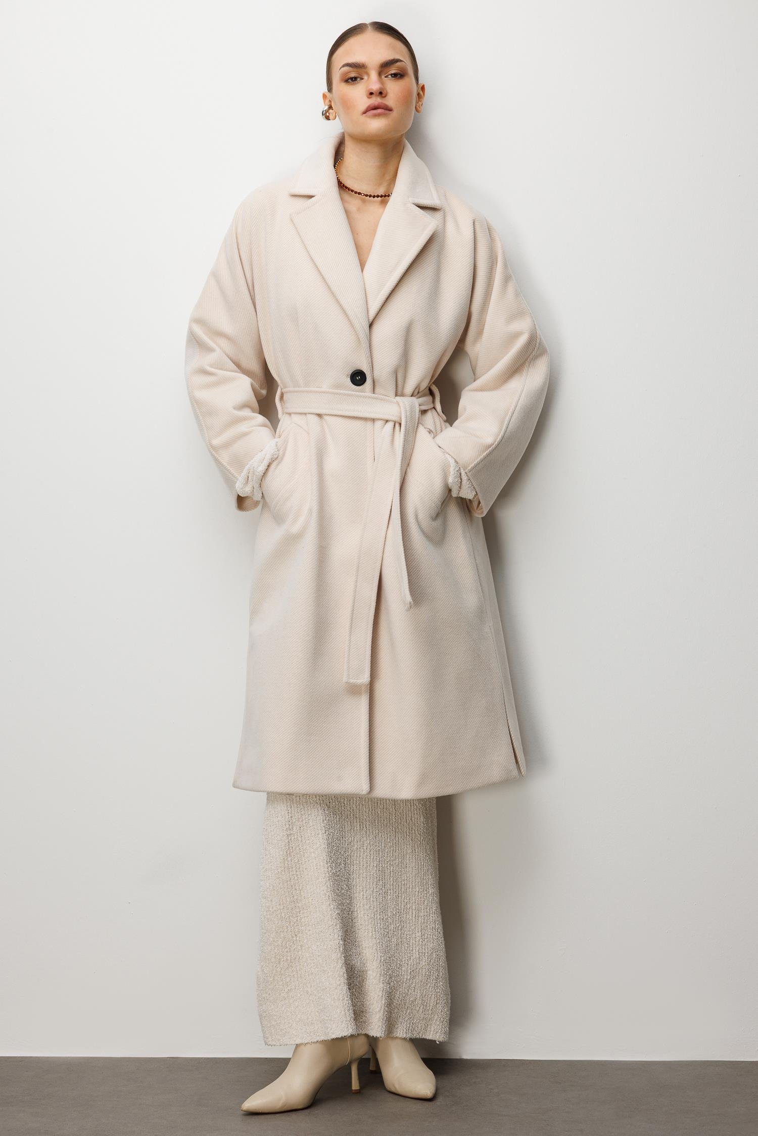 Bu kaban, kış güneşinin ferahlatıcı aydınlığından ve modern mimarinin çizgisel estetiğinden ilham alınarak tasarlandı. Bej renginin sunduğu dinginlik, kumaştaki diyagonal çizgilerin yarattığı optik hareketle birleşerek geleneksel kaşe kaban anlayışına modern ve lüks bir soluk getiriyor. Tek düğmeli minimalist yapı ve kuşak detayı, geçmişin asil terzilik unsurlarını günümüzün rahat silüetleriyle harmanlıyor.