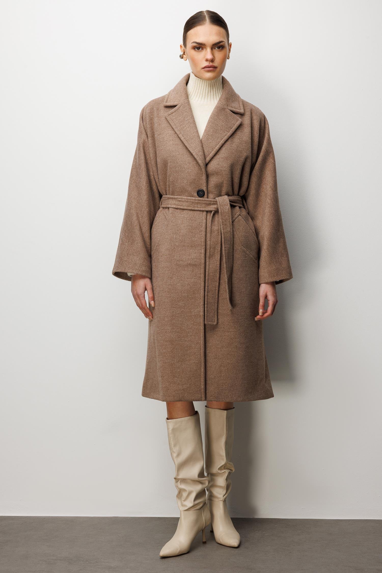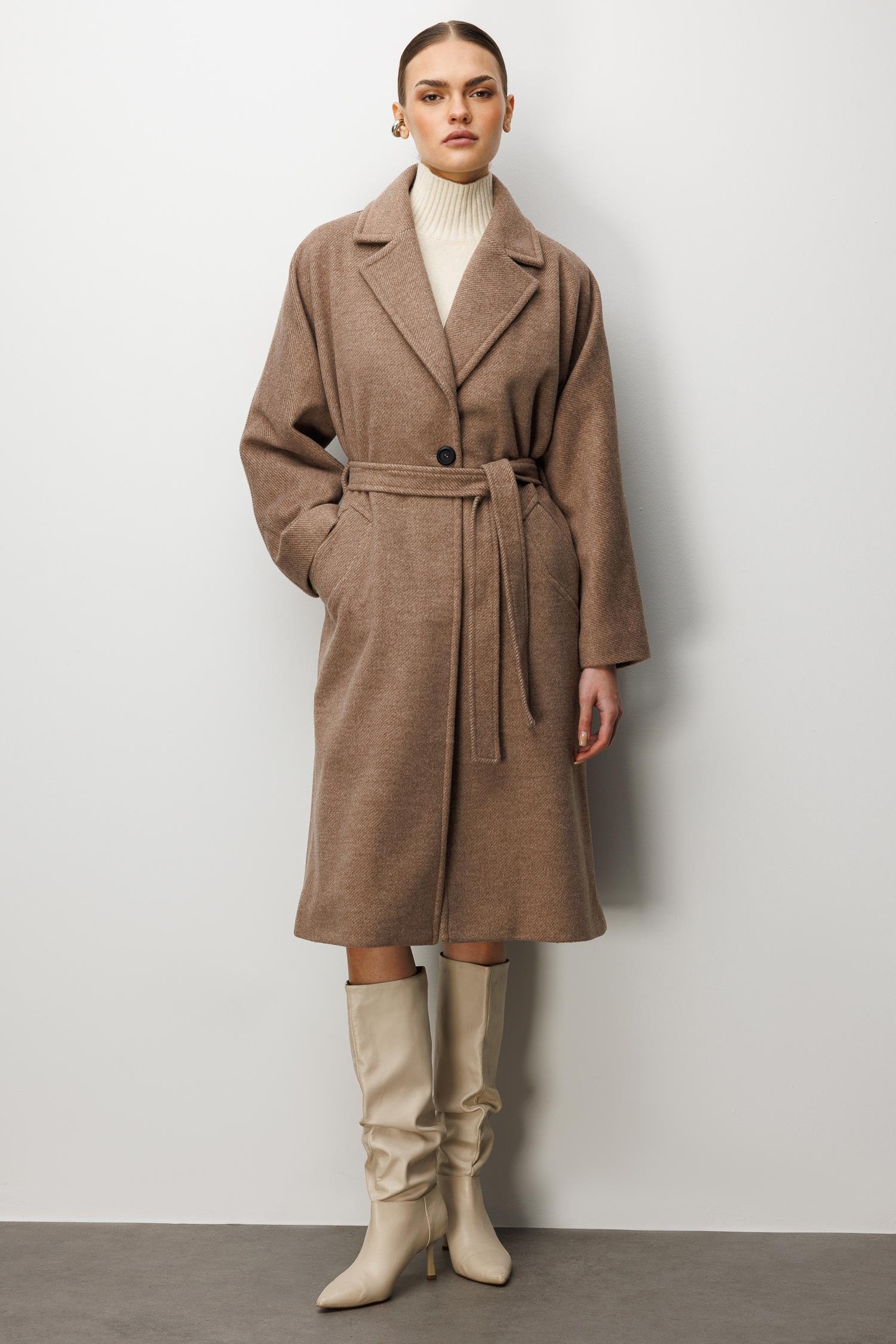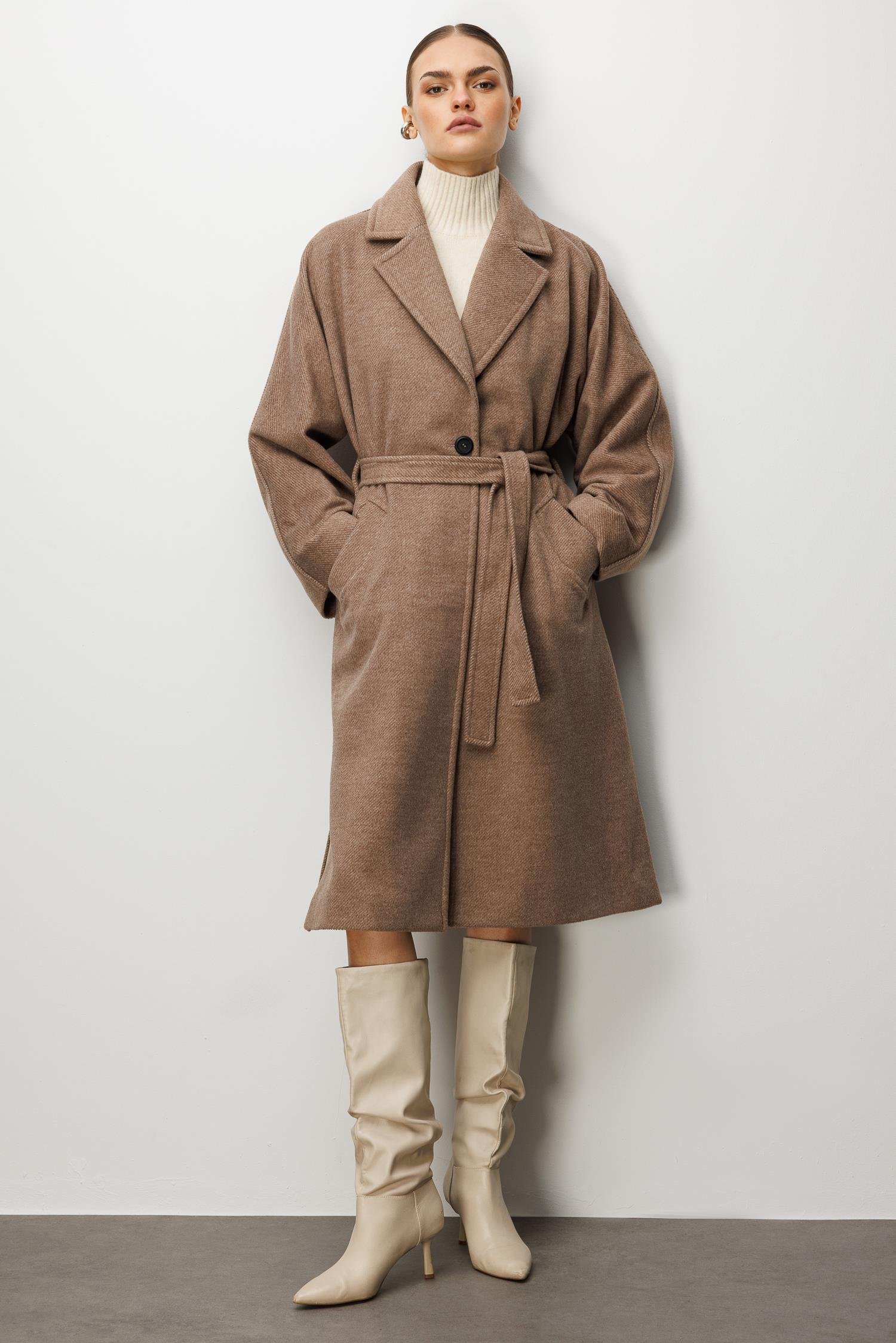Model: Modern silüeti klasik terzilikle buluşturan, düşük omuzlu ve rahat kesimli kaşe kaban.