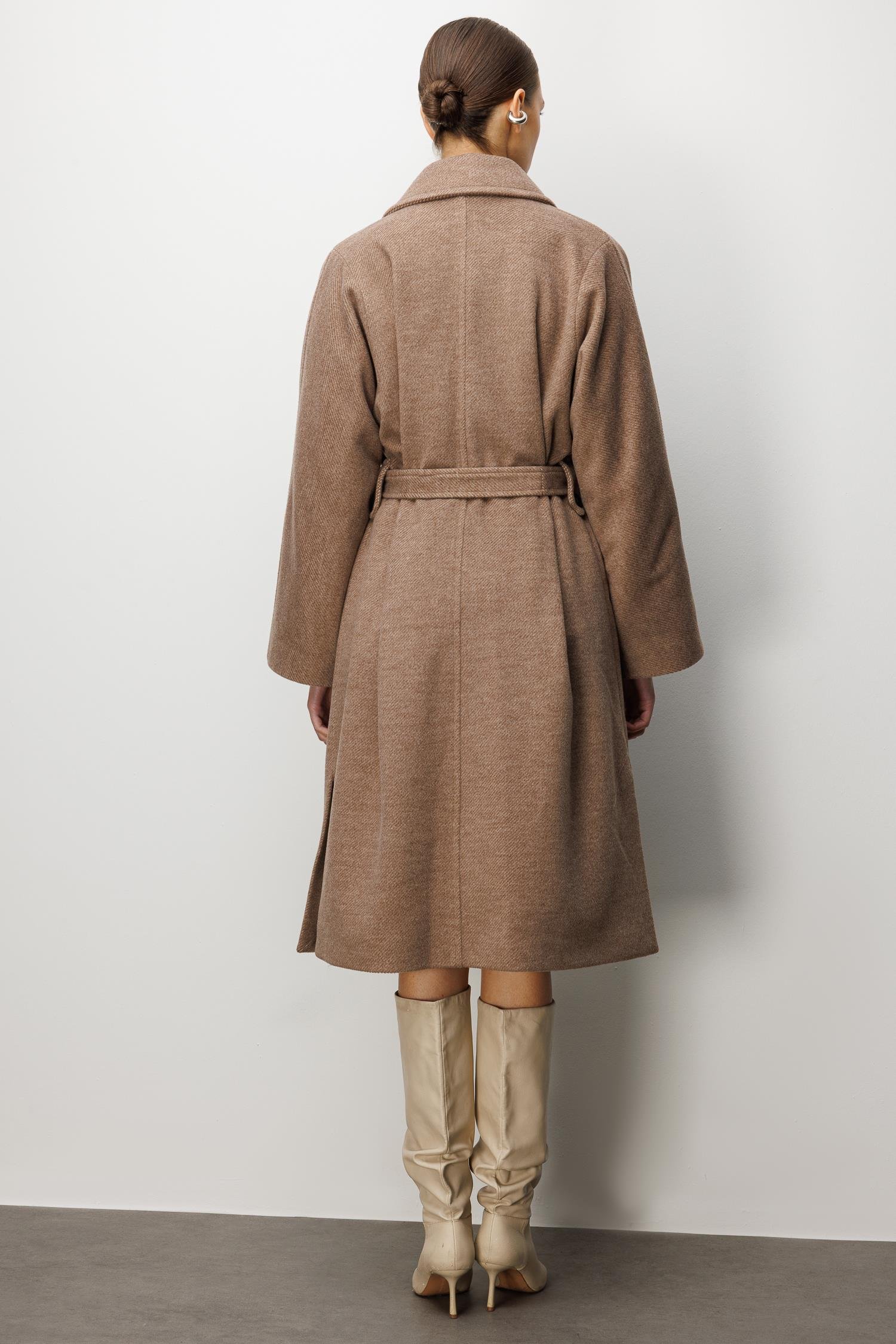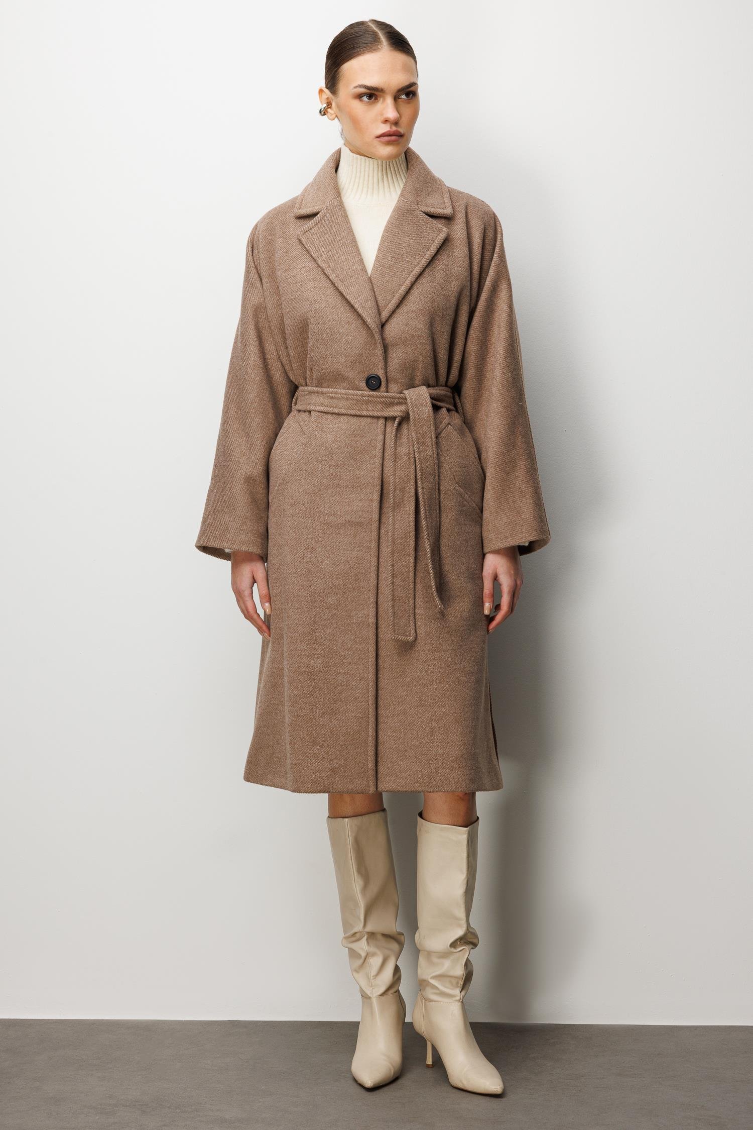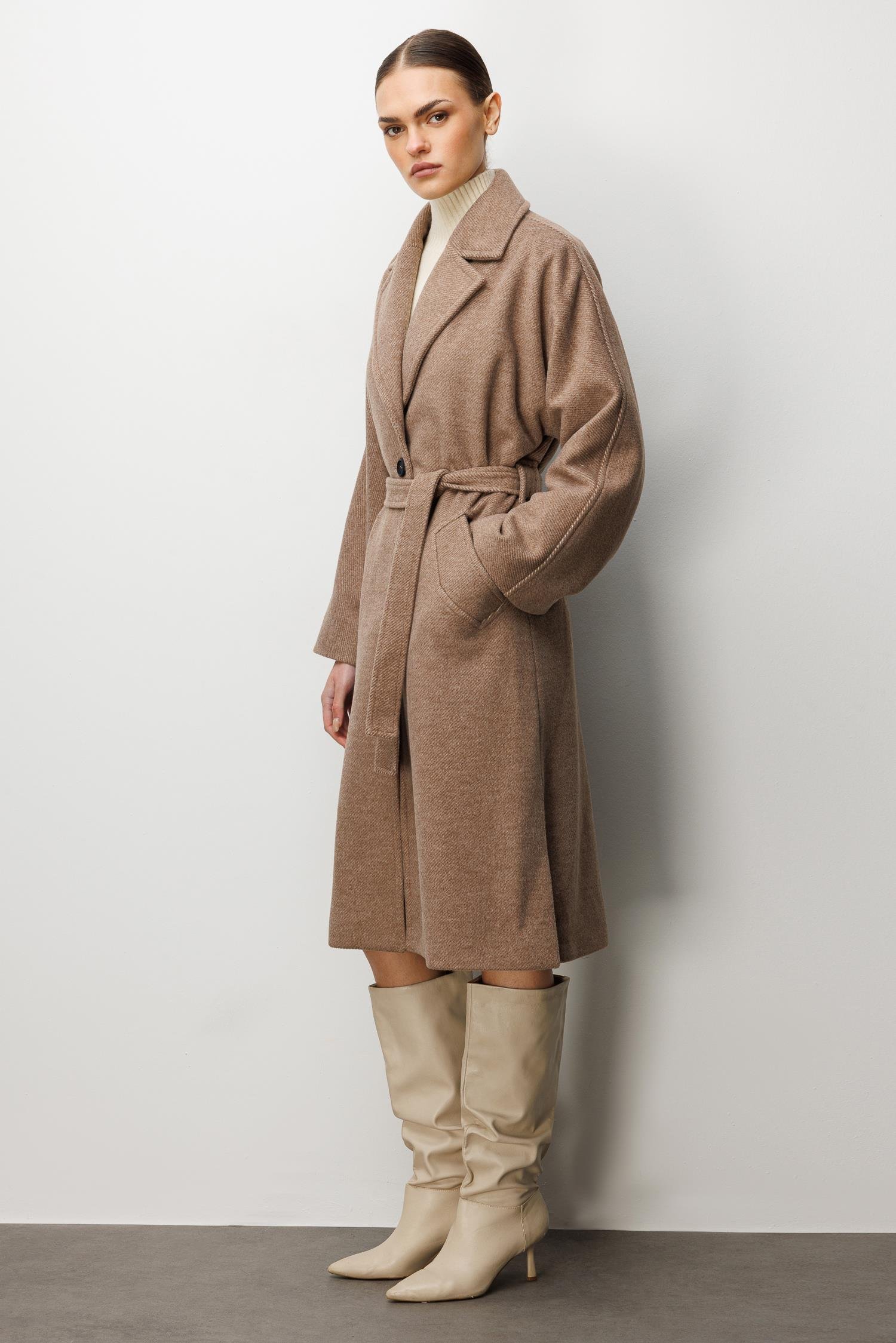 Model: Modern silüeti klasik terzilikle buluşturan, düşük omuzlu ve rahat kesimli kaşe kaban.