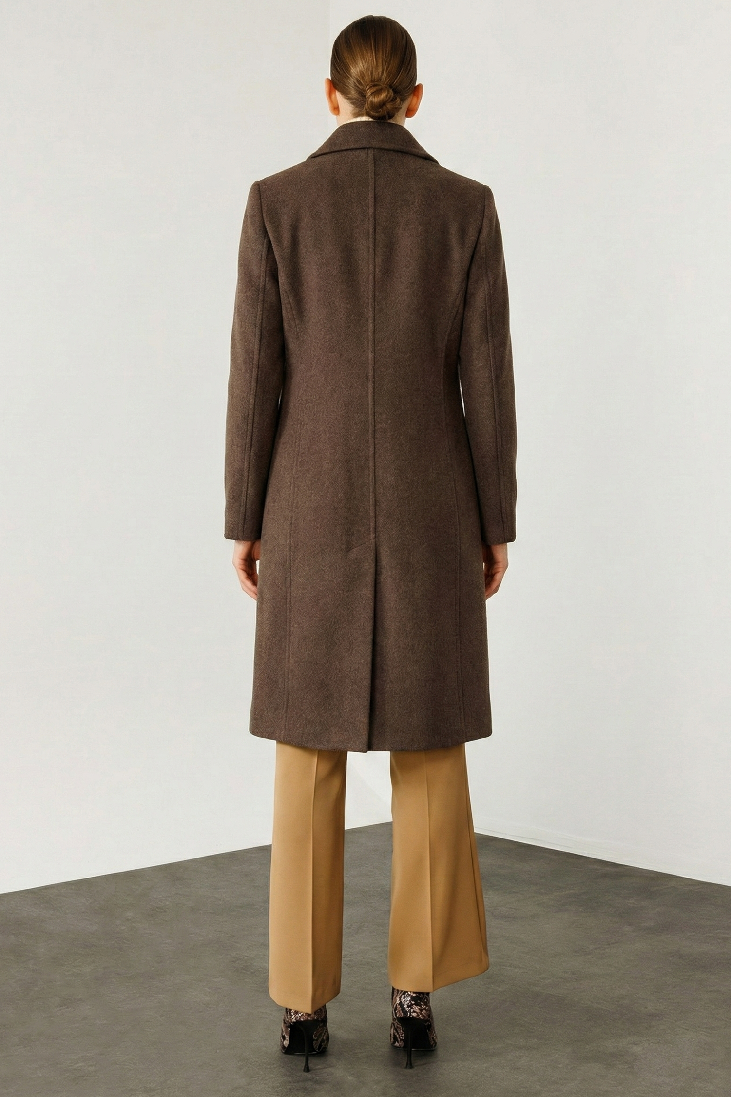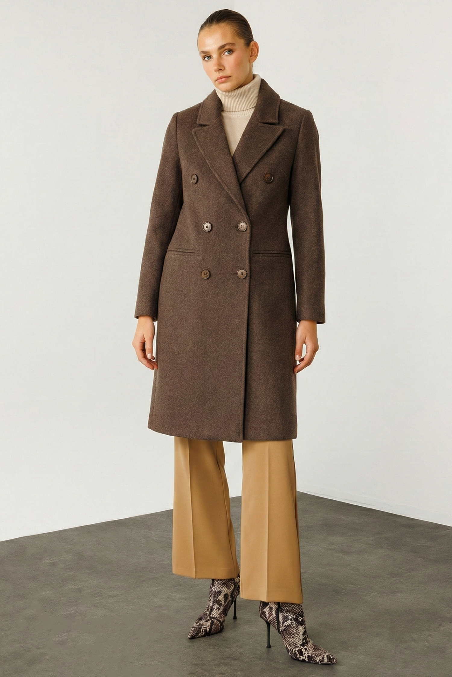 Model: Klasik ve zamansız bir silüet sunan, orta boy, kaşe kumaşlı kruvaze kaban.