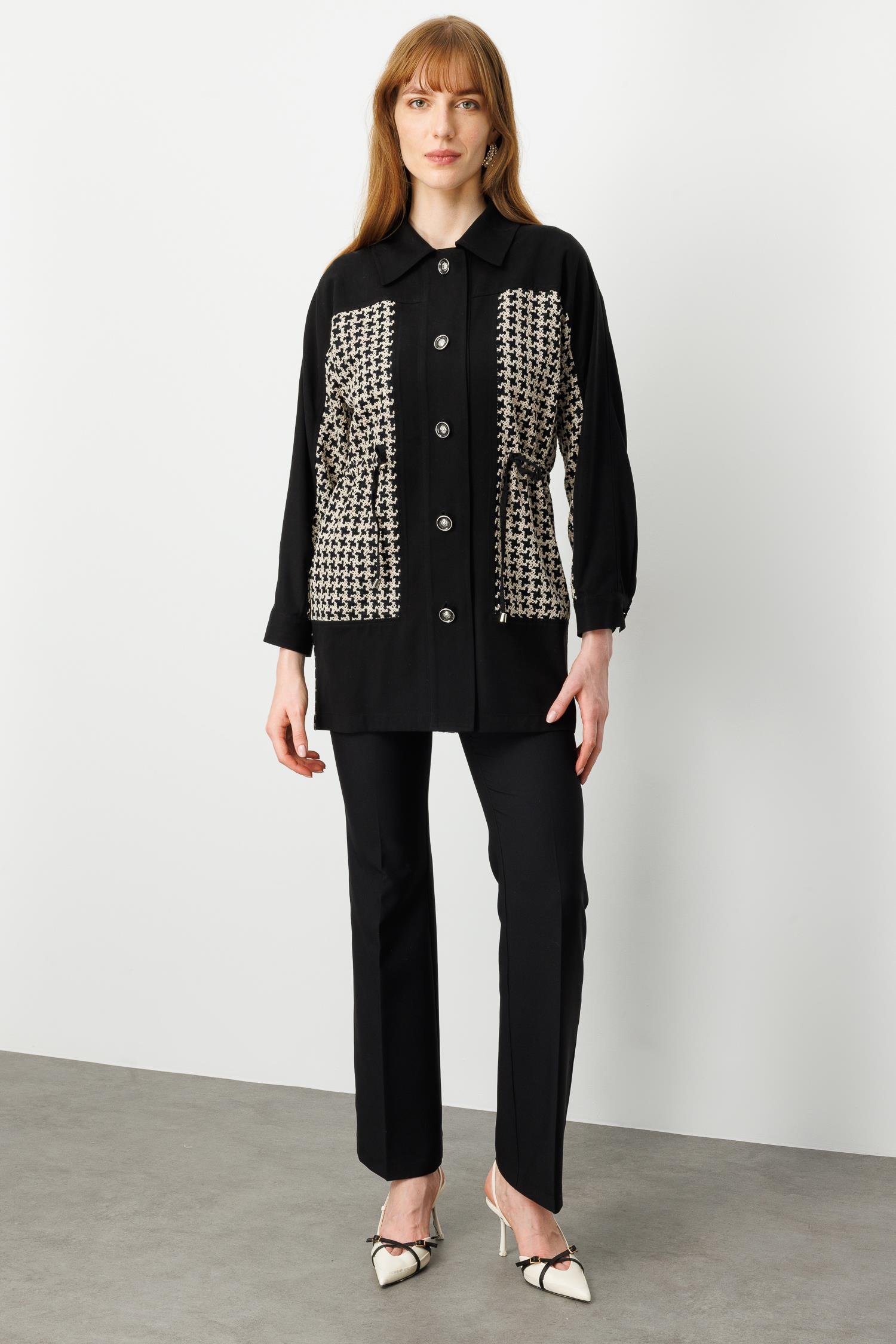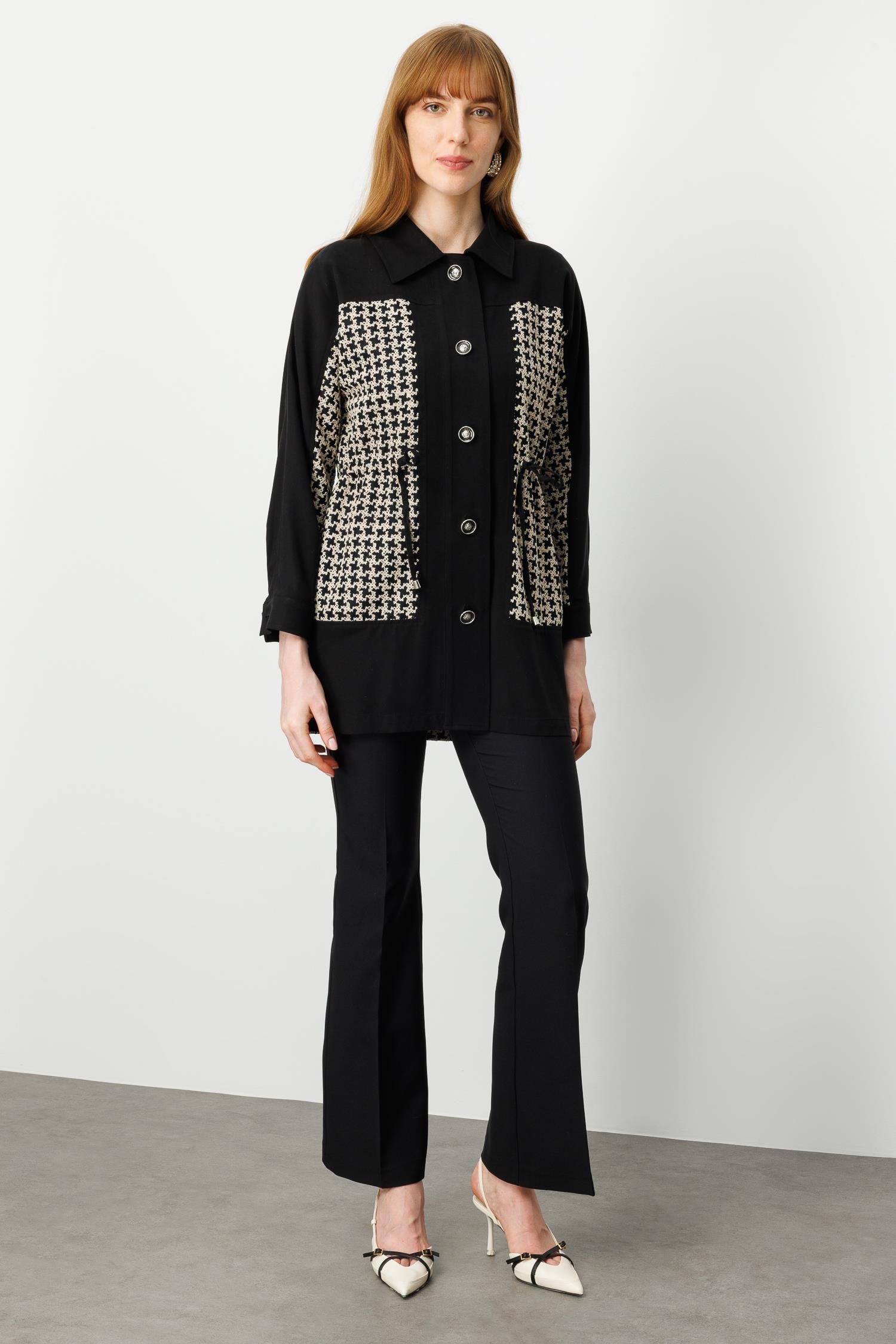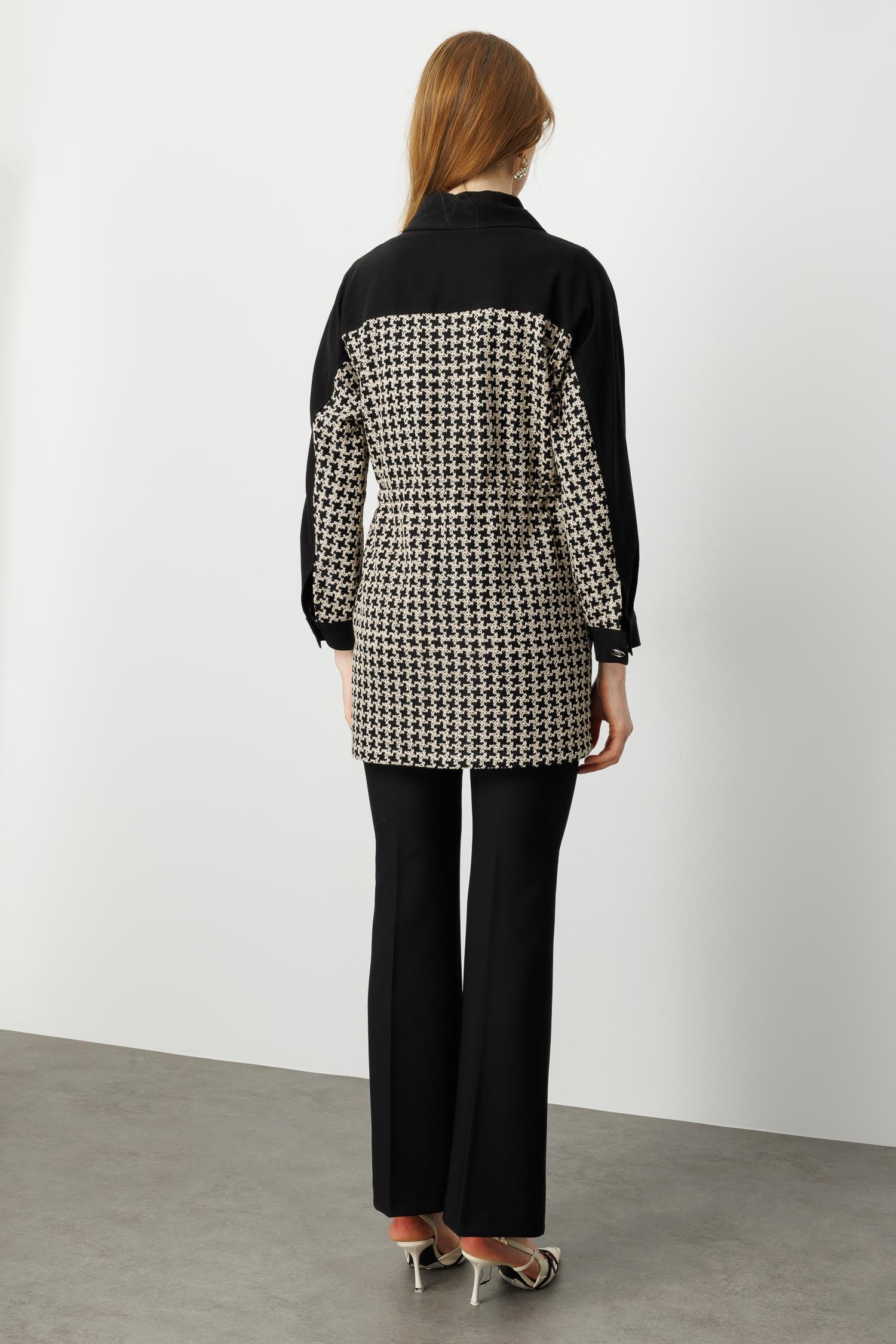 Nakışlı kazayağı desenli kumaş ile ön gövde ve cep bölgesi detayları