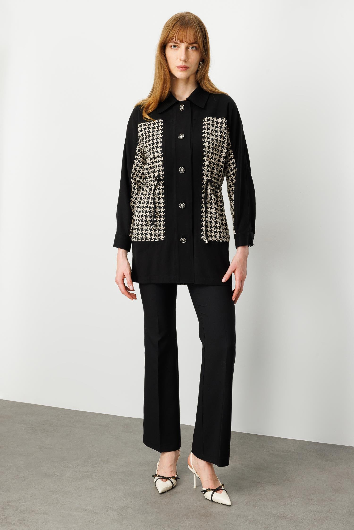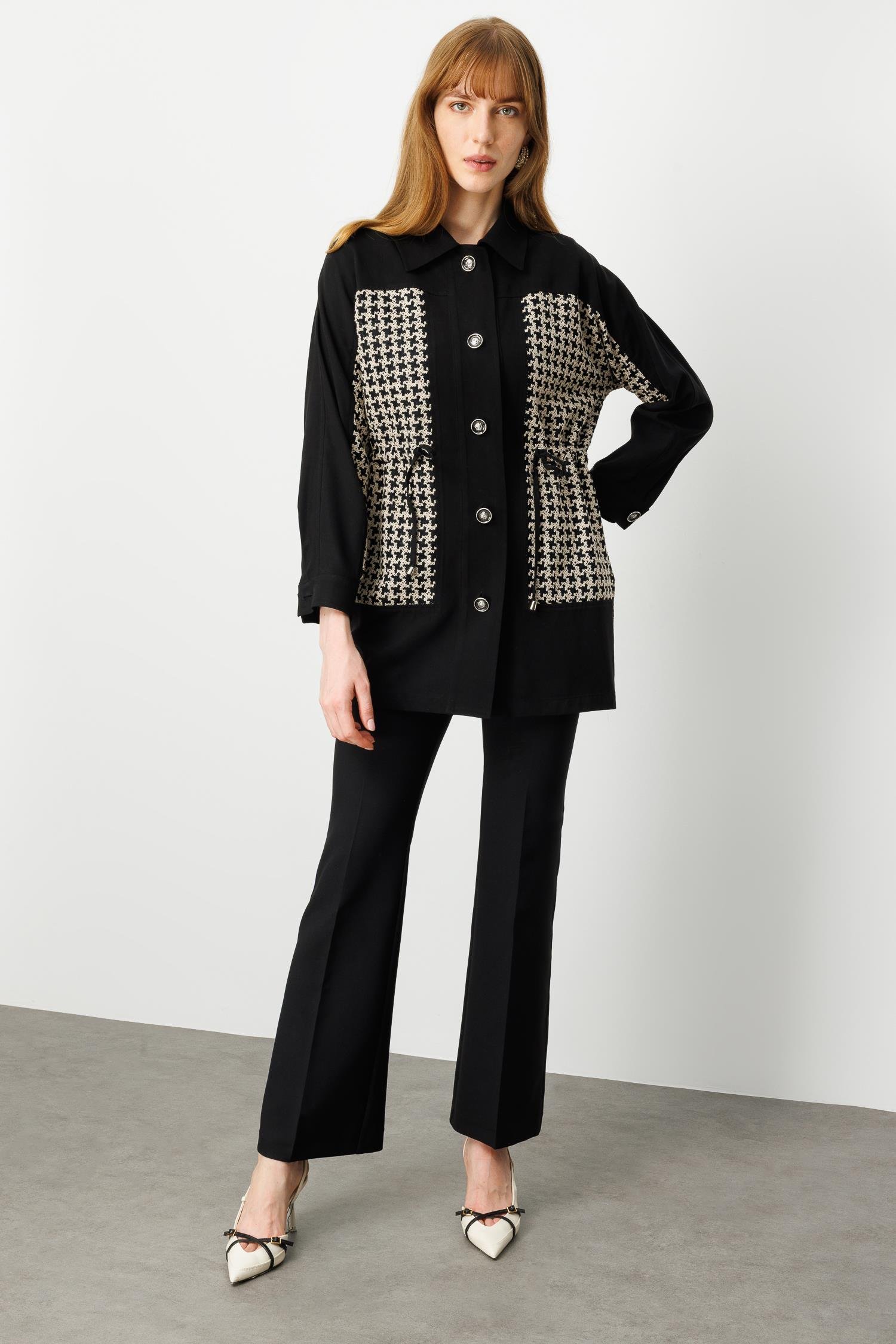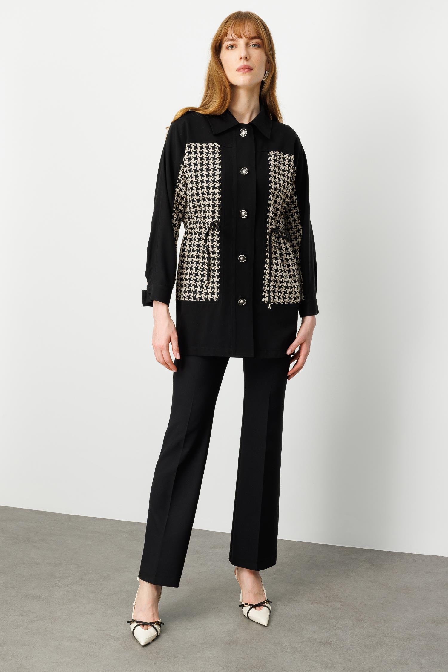 Nakışlı kazayağı desenli kumaş ile ön gövde ve cep bölgesi detayları