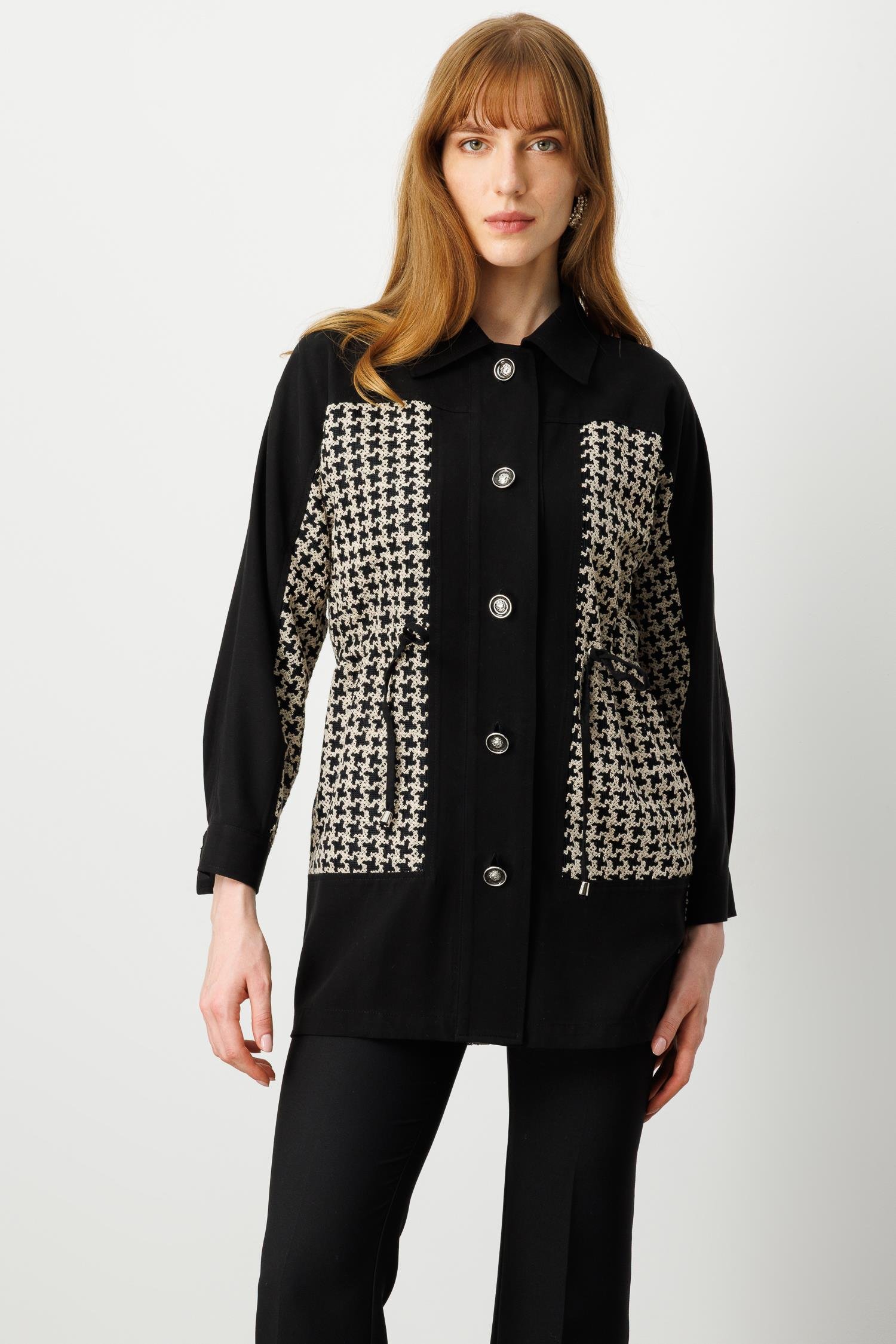 • Model: Uzun tunik formunda, düğme kapamalı, şık geçişli kumaş detayıyla tasarlanmış tunik kap