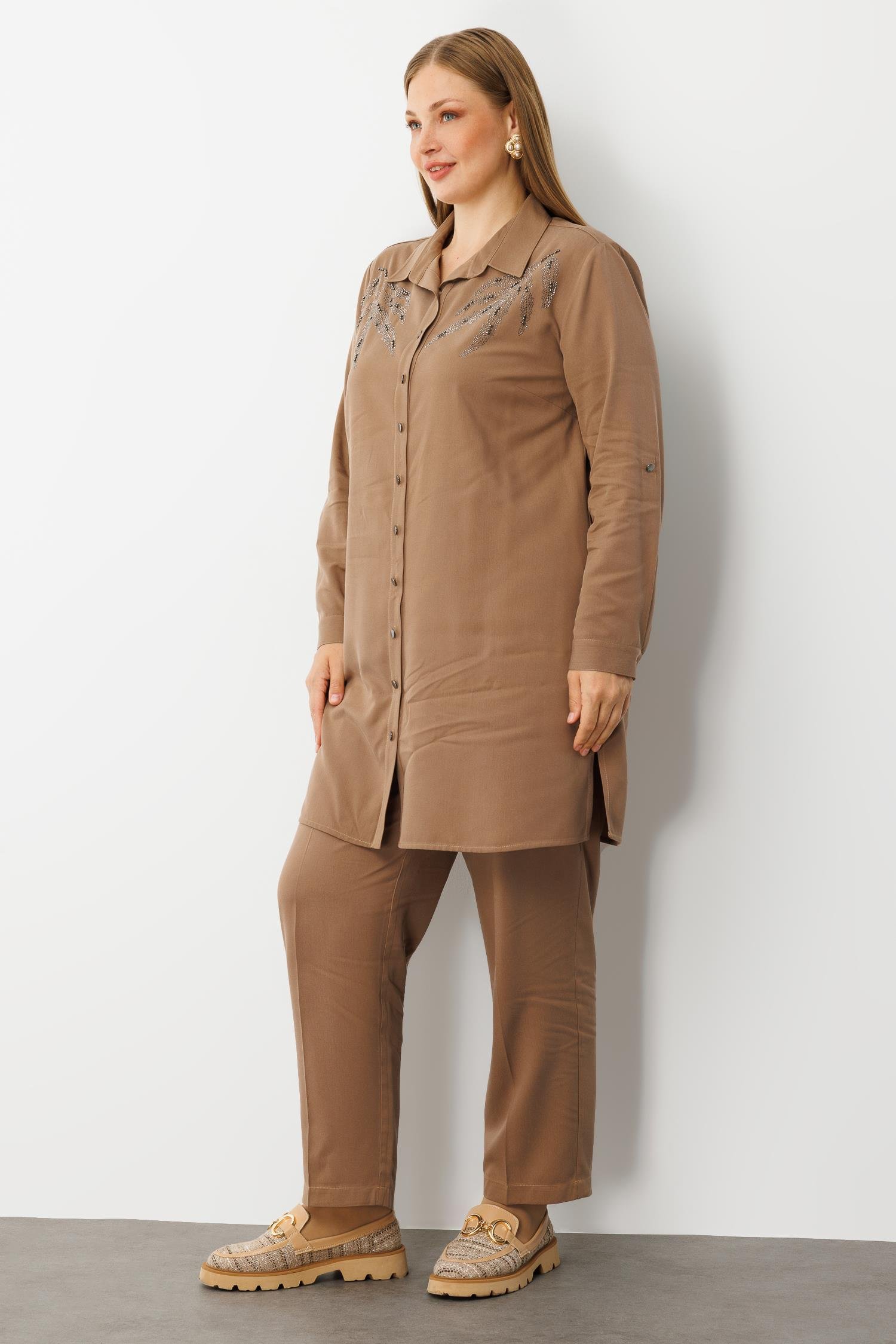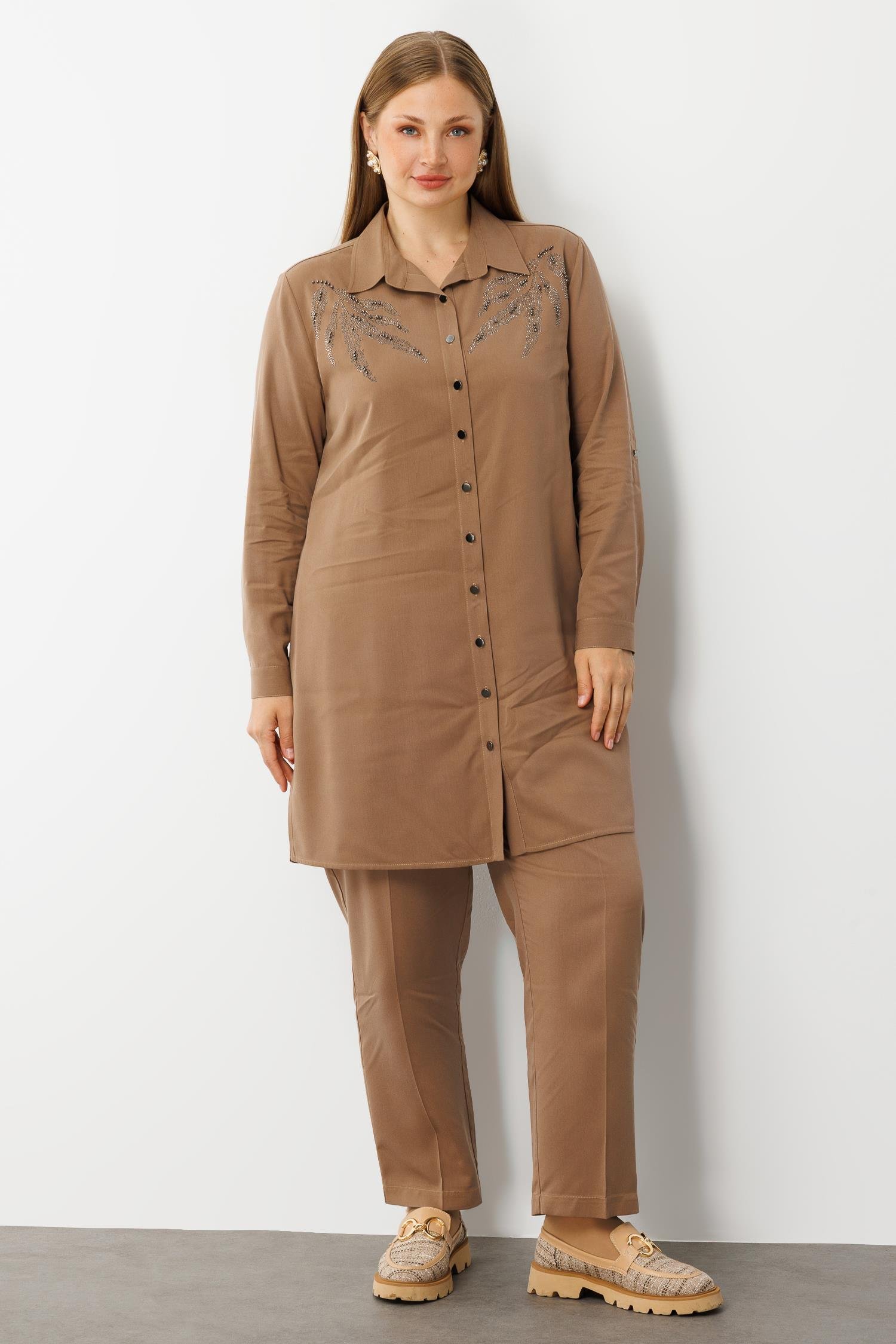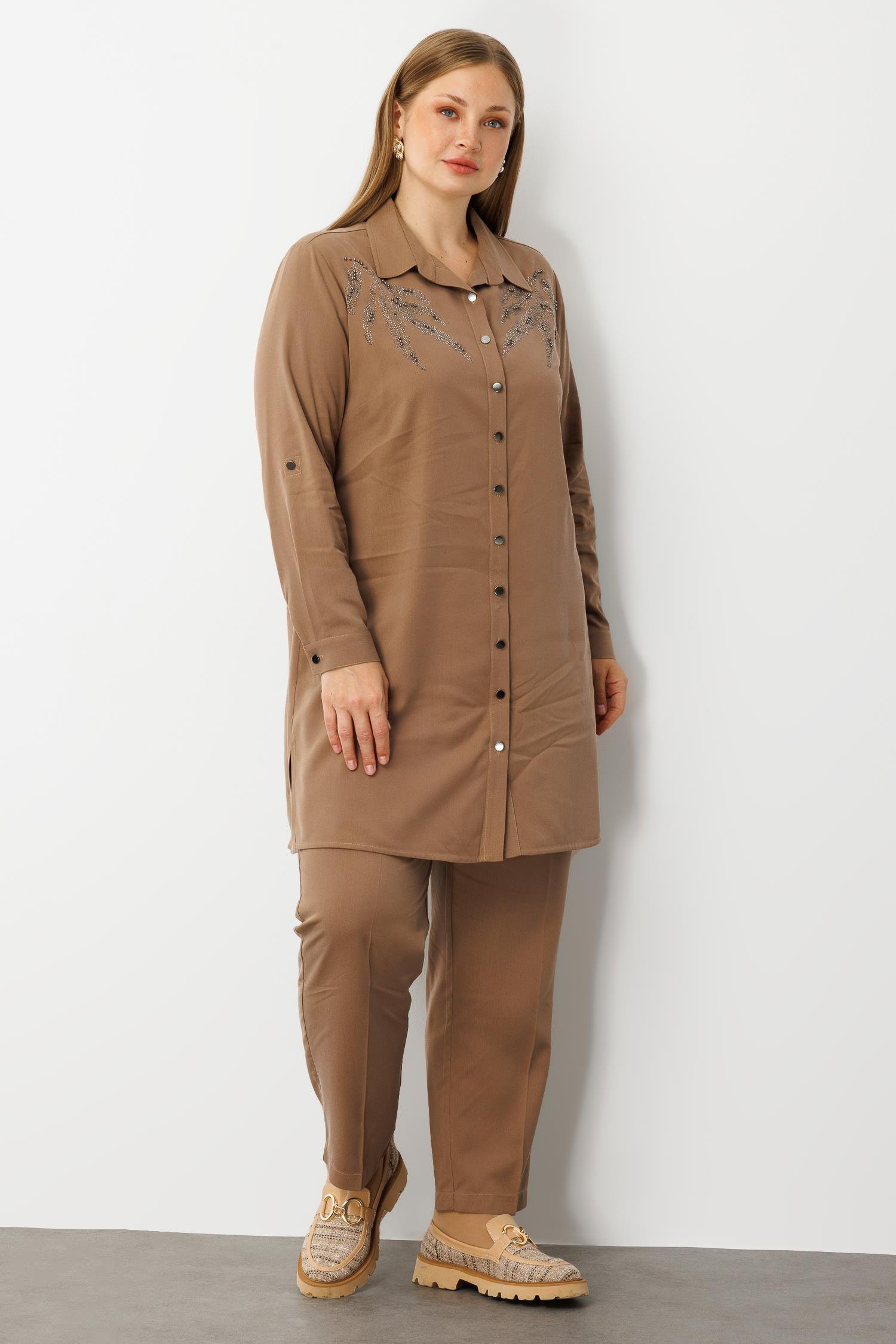 Modailgi  Ön Robaları Yaprak Desenli Taş Tunik Vizon
